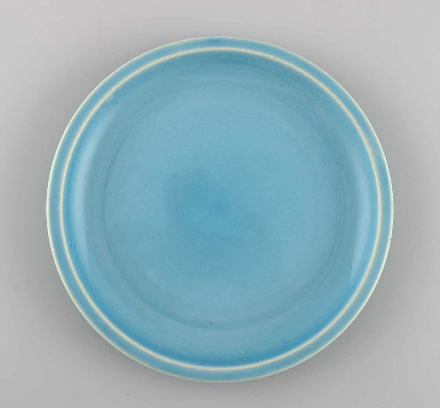 Jens H. Quistgaard (1919-2008) for Bing & Grøndahl. Fem Tema tallerkener i glaseret stentøj. Sjælden turkis glasur. 1960/70'erne.