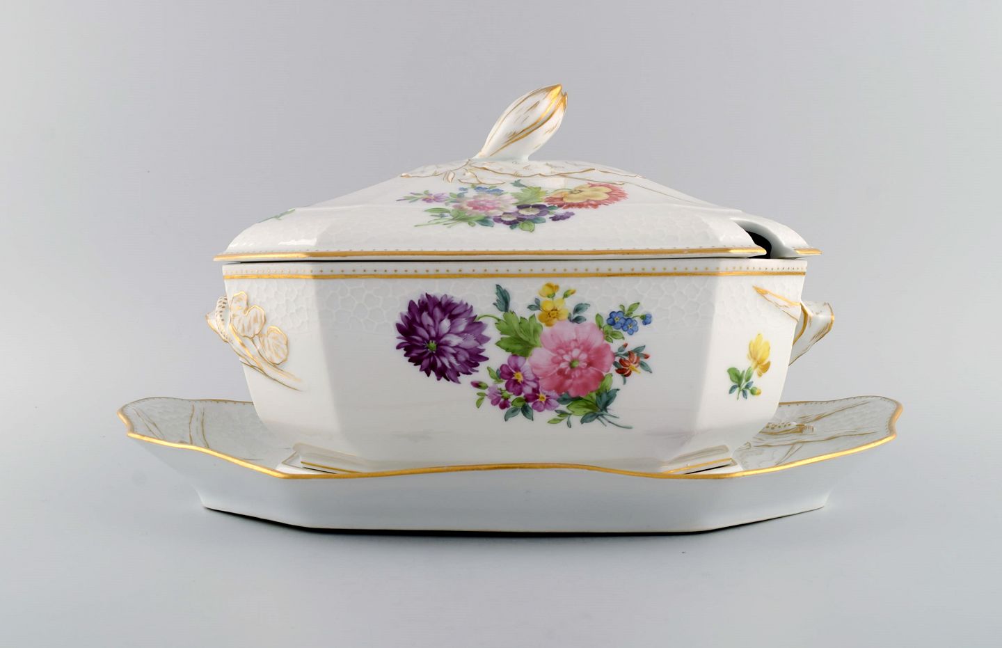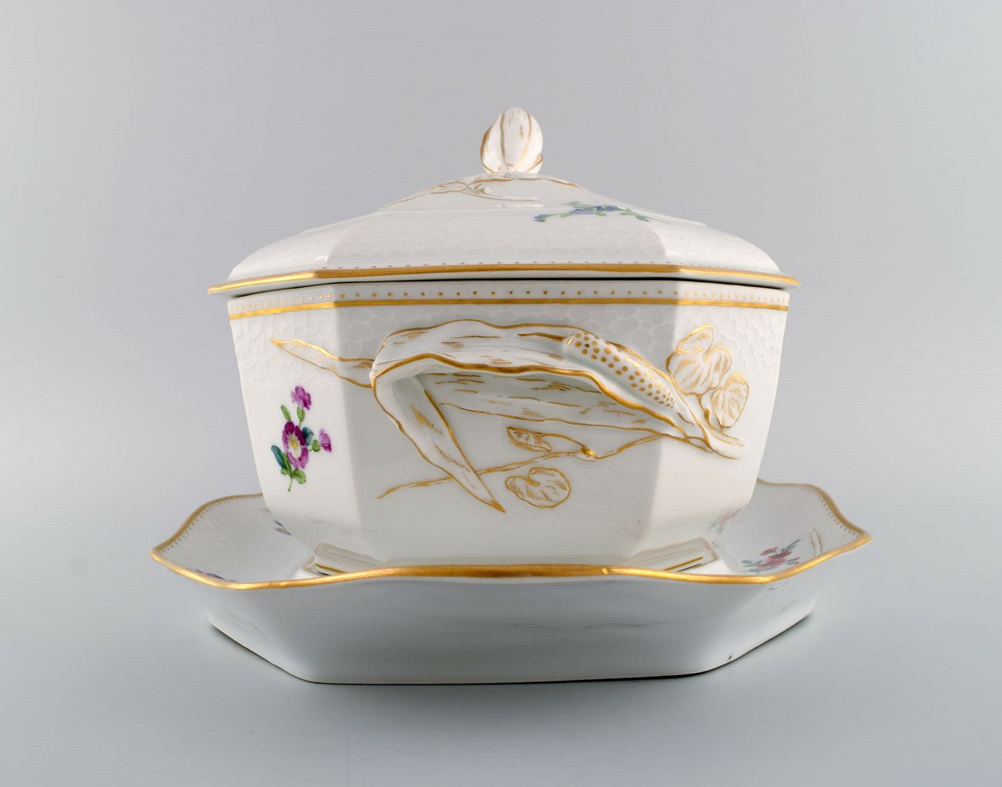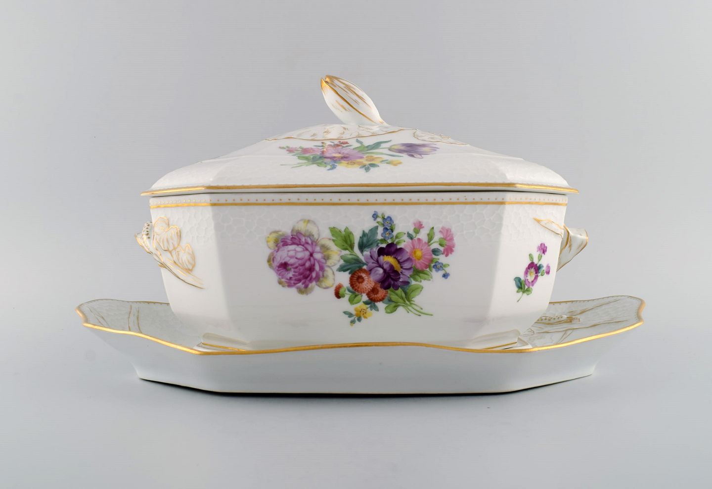 Royal Copenhagen Saksisk Blomst speciel version. Stor og sjælden lågterrin med underfad. Låg og hanke modelleret som bladværk. Håndmalede blomster og gulddekoration. Ca. 1900.