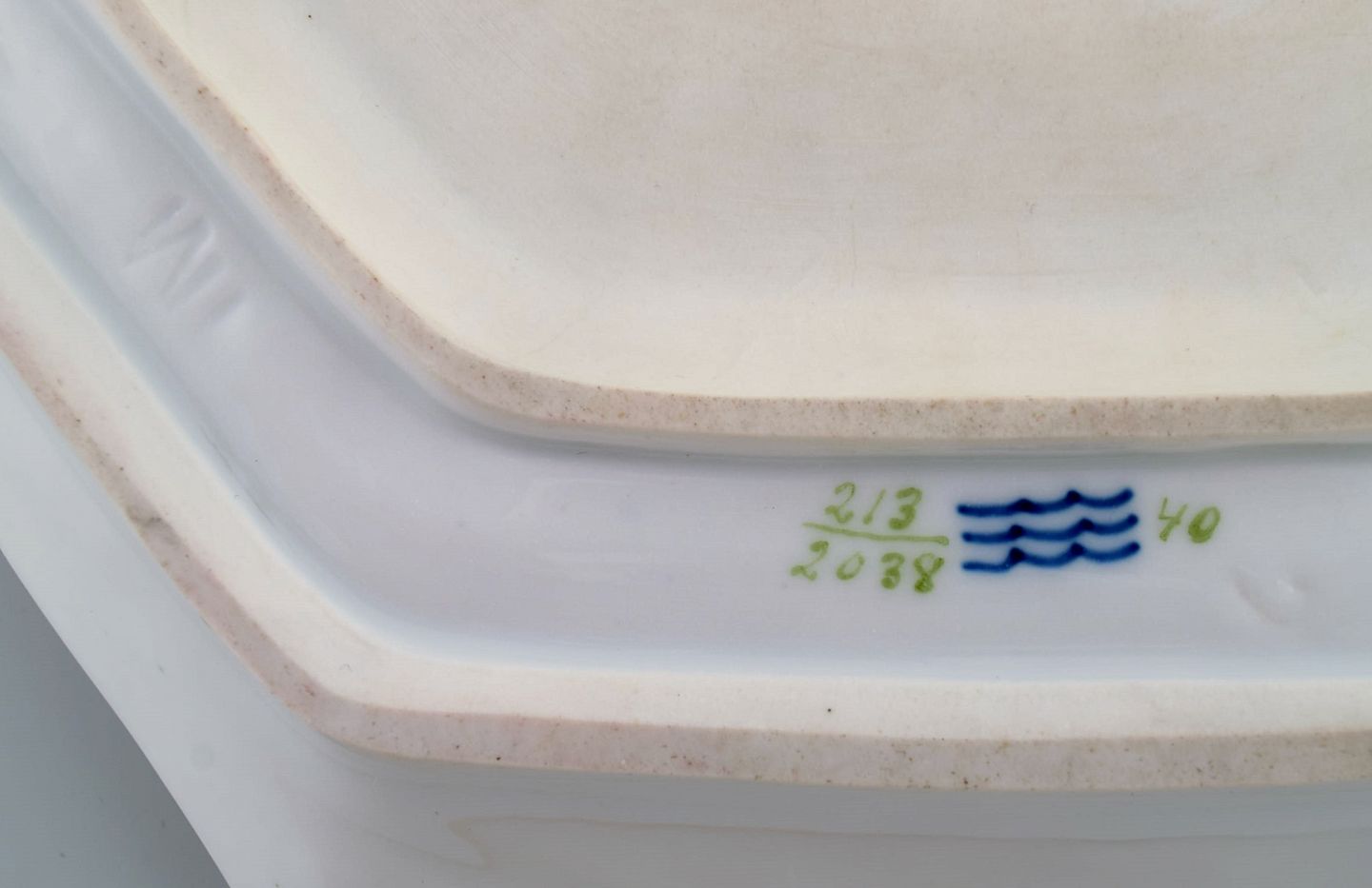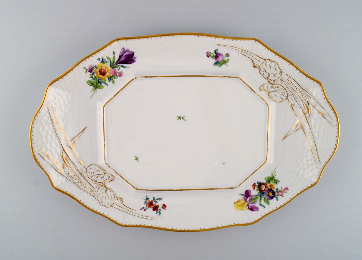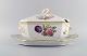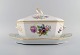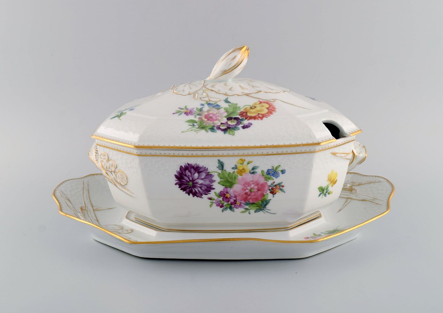 Royal Copenhagen Saksisk Blomst speciel version. Stor og sjælden lågterrin med underfad. Låg og hanke modelleret som bladværk. Håndmalede blomster og gulddekoration. Ca. 1900.