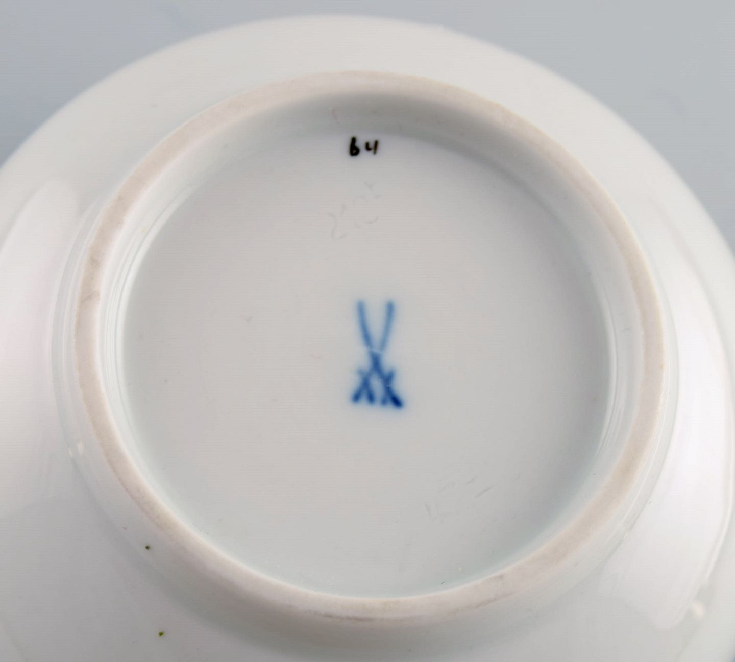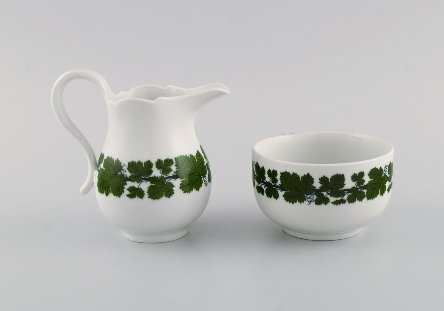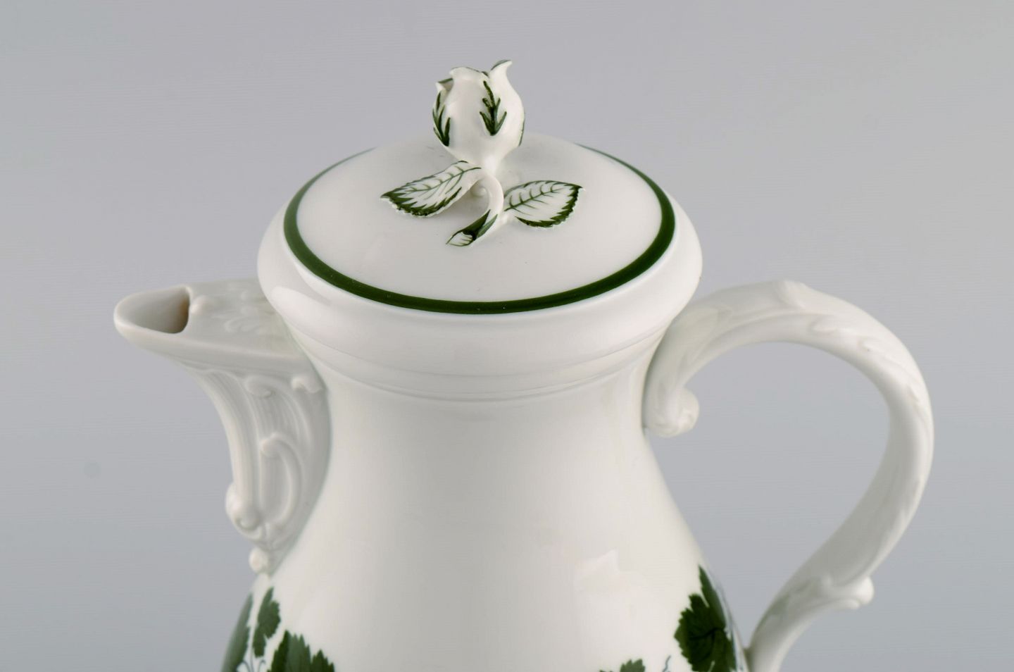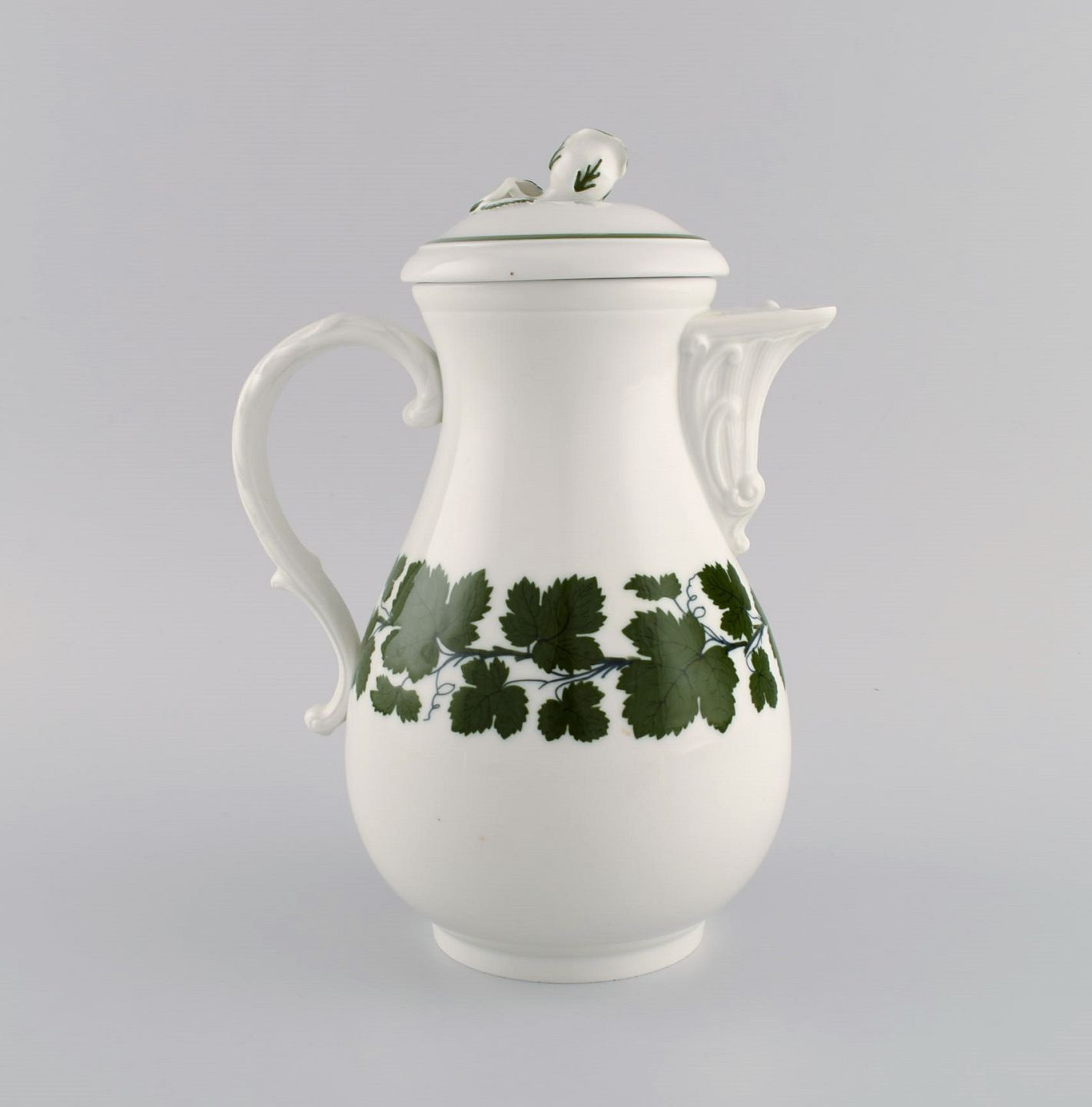 Meissen Green Ivy Vine. Kaffekande, sukkerskål og flødekande i håndmalet porcelæn. Låg modelleret med rosenknop. 1940'erne.
