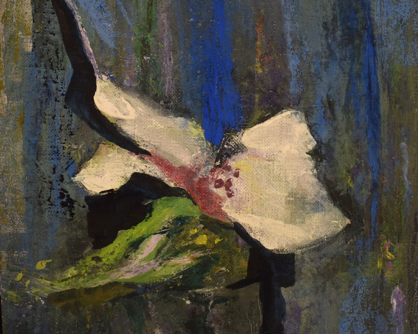 Olof Arén (b. 1918), Swedish artist. Oil on board. Modernist still life with orchid. Mid 20th century.