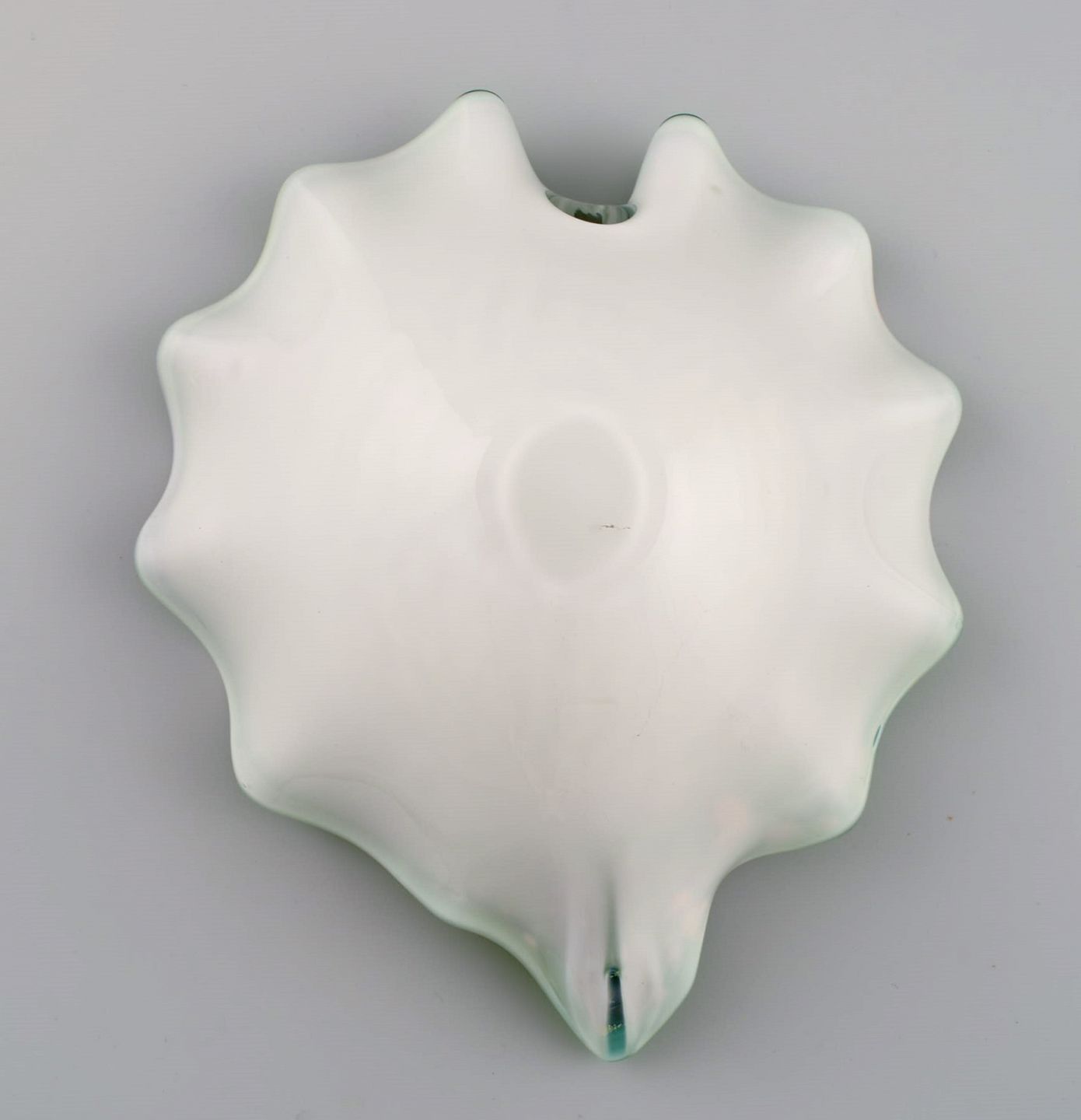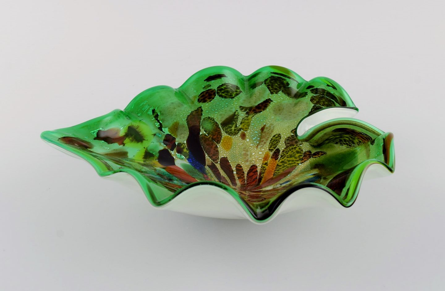 Bladformet Murano skål i polykromt mundblæst kunstglas. Grøn baggrund. Italiensk design, 1960'erne. Måler: 22,5 x 6,5 cm I flot stand.