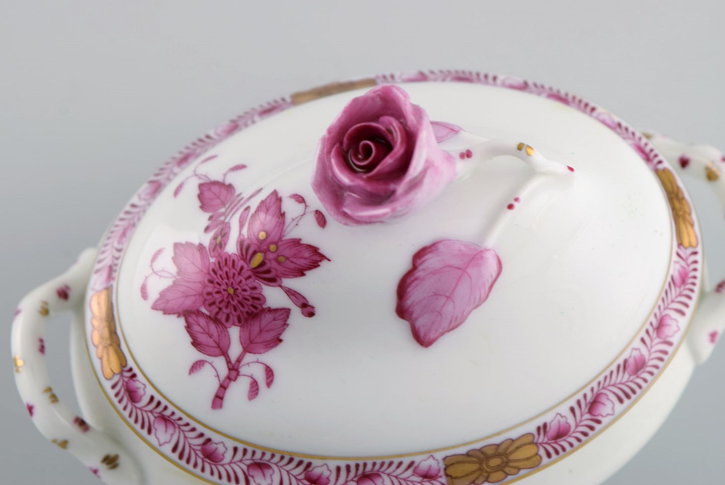 Herend lågskrin i porcelæn med håndmalede lilla blomster og gulddekoration. Låg modeleret med rosenknop. Midt 1900-tallet.