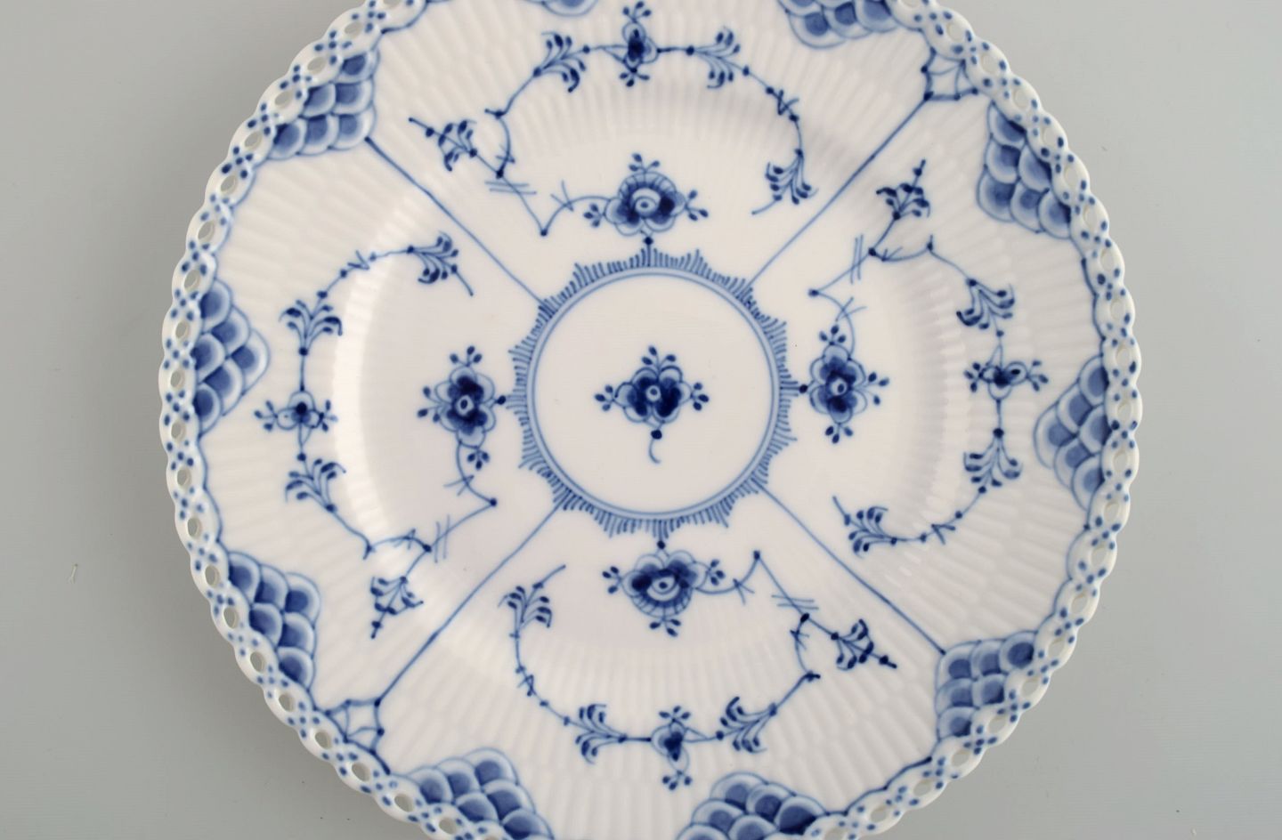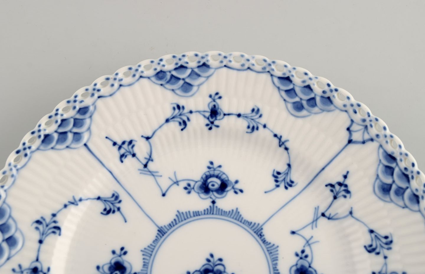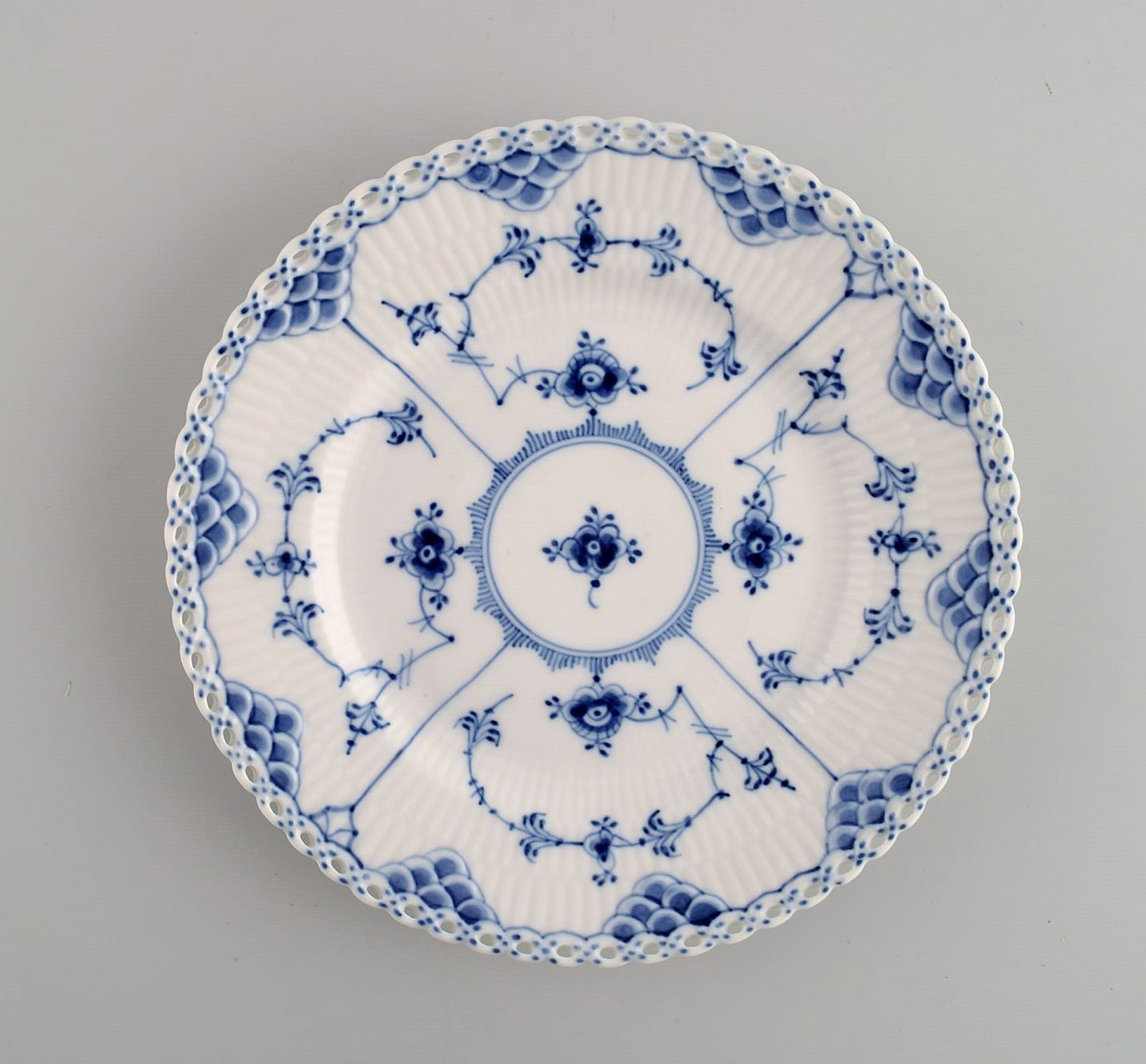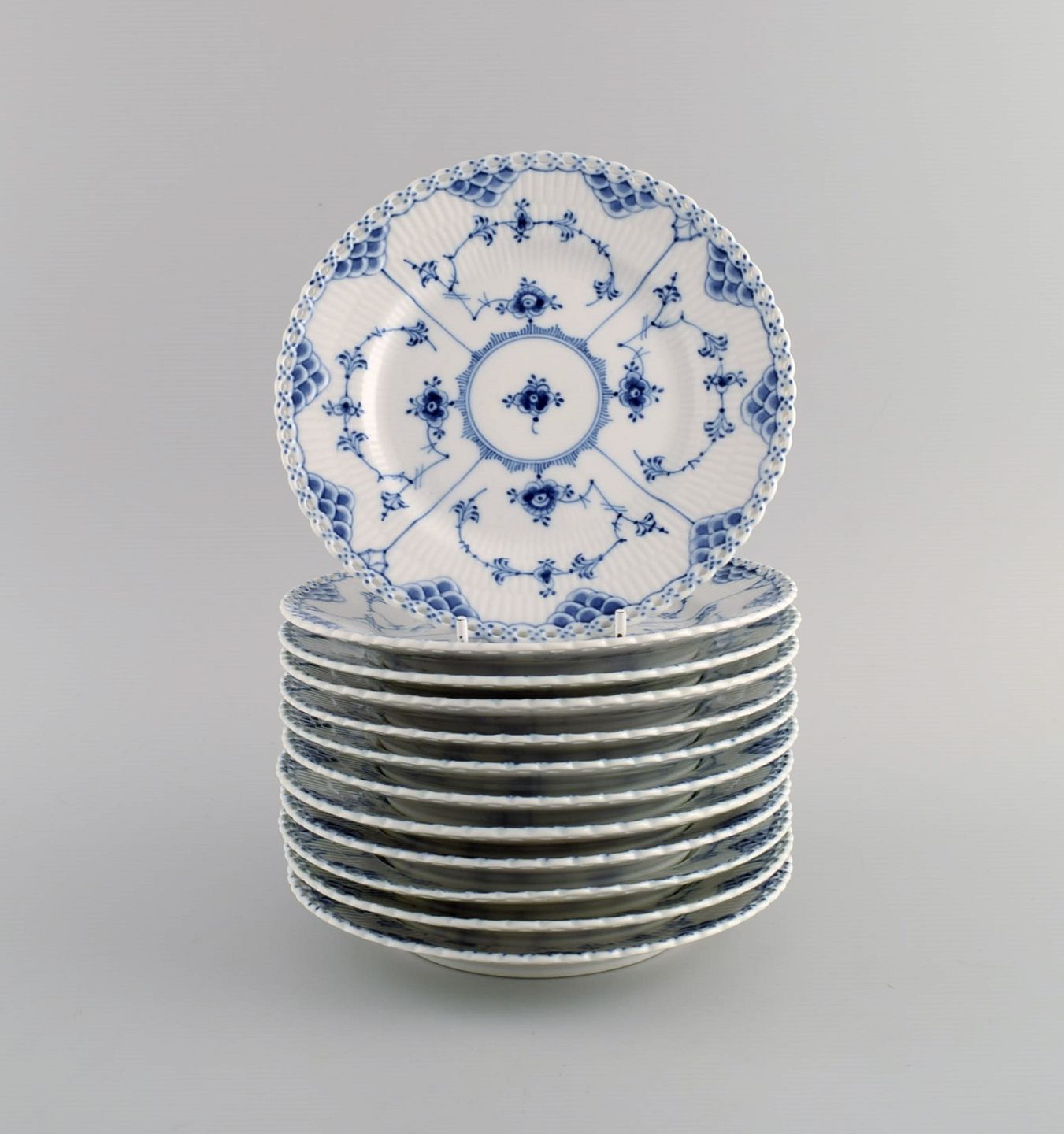 12 Royal Copenhagen Blue Fluted Full Lace Plates. Model number 1/1087. Mid 20th century. Diameter: 17.5 cm. In excellent condition. Stamped. 1st factory quality.