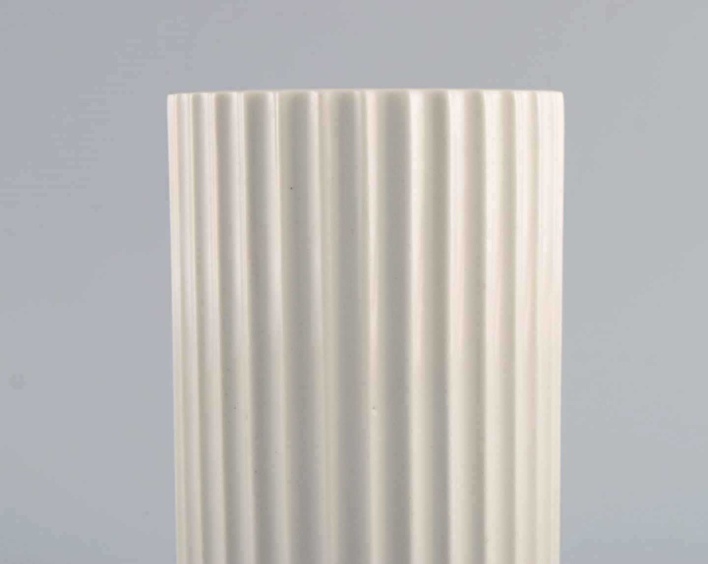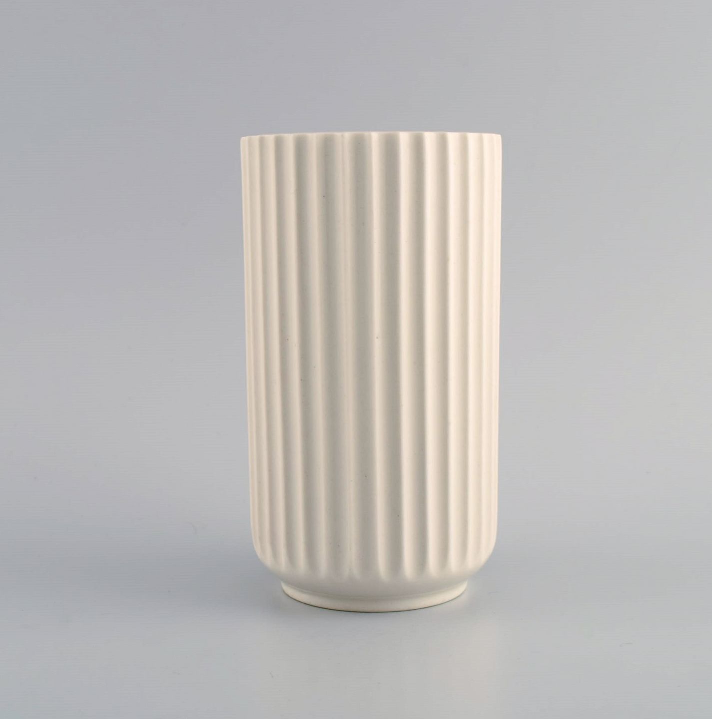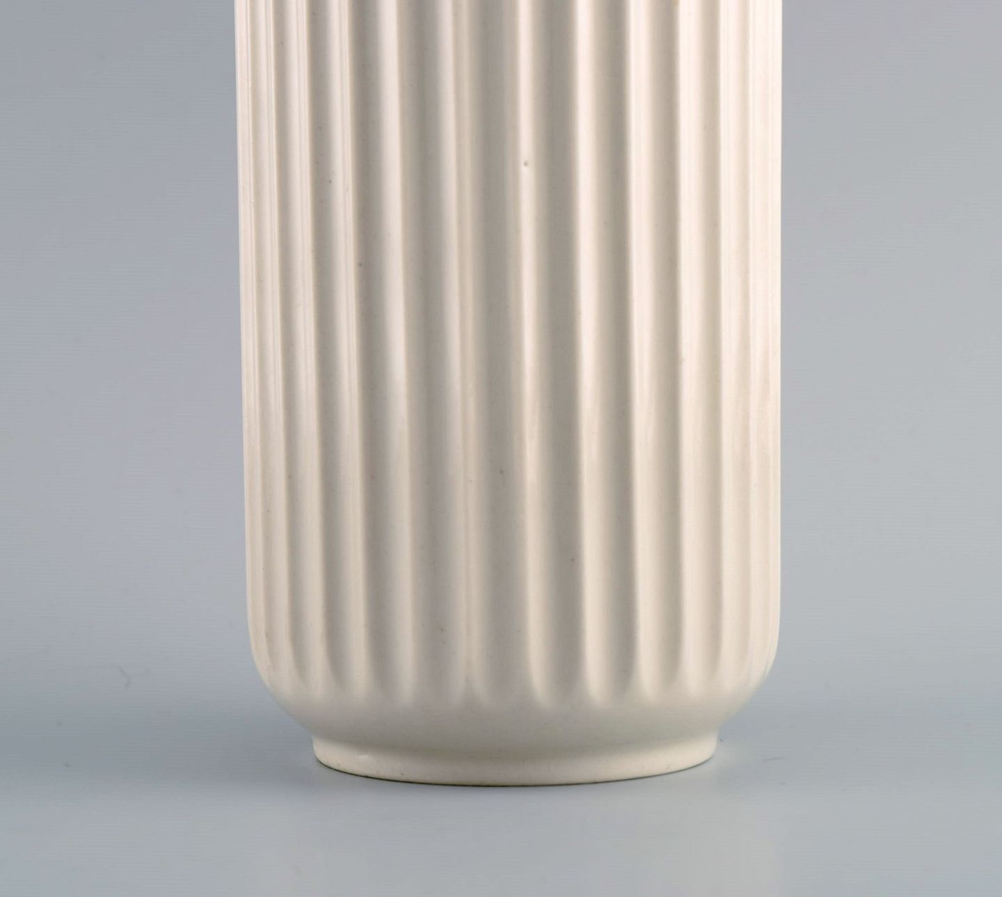 Tidlig Lyngby porcelænsvase med kanneleret korpus. Dateret 1936-1940. Måler: 15,3 x 8,5 cm. I flot stand. Stemplet.