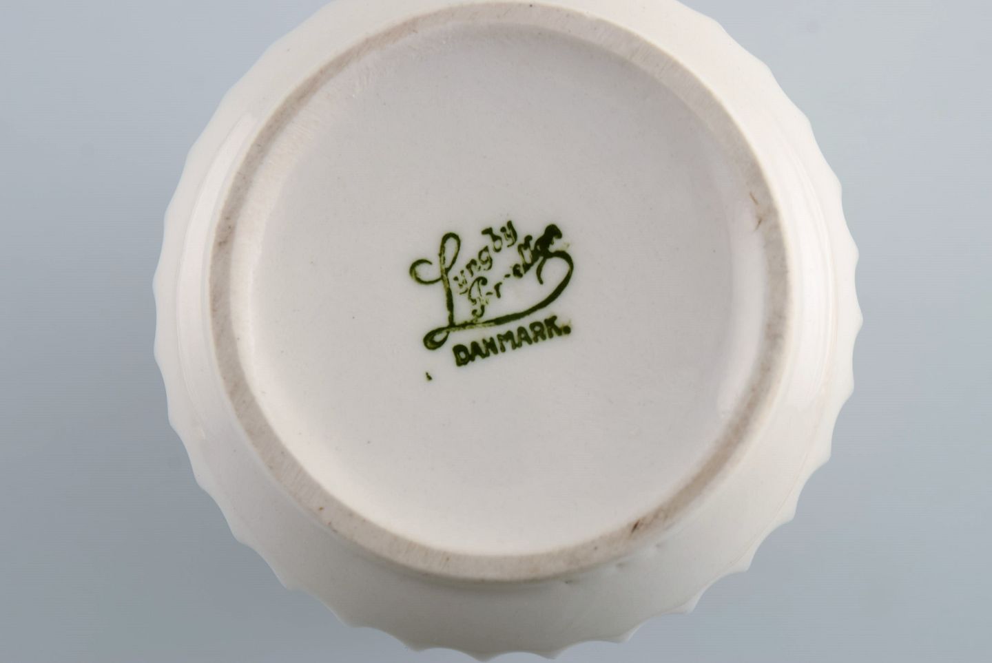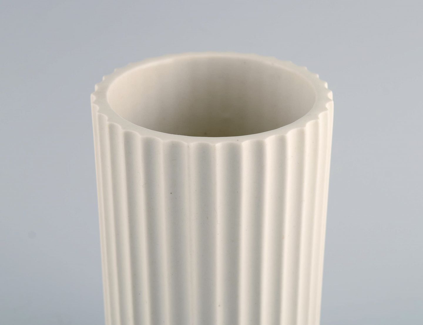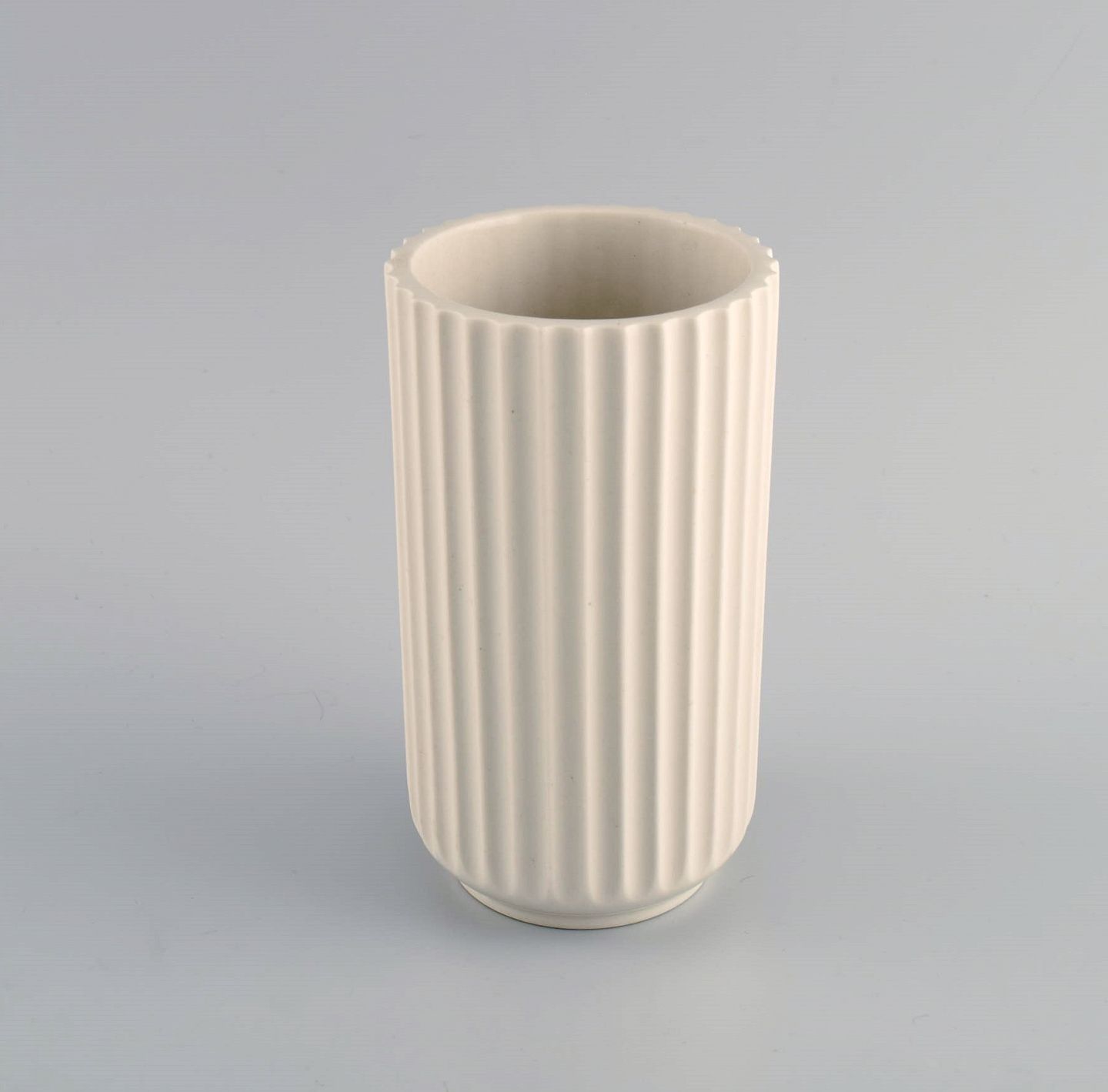 Tidlig Lyngby porcelænsvase med kanneleret korpus. Dateret 1936-1940. Måler: 15,3 x 8,5 cm. I flot stand. Stemplet.