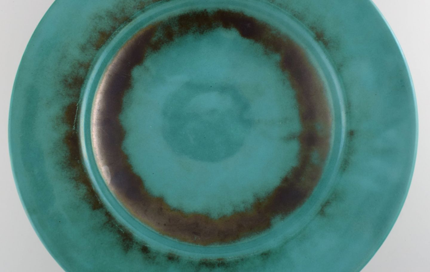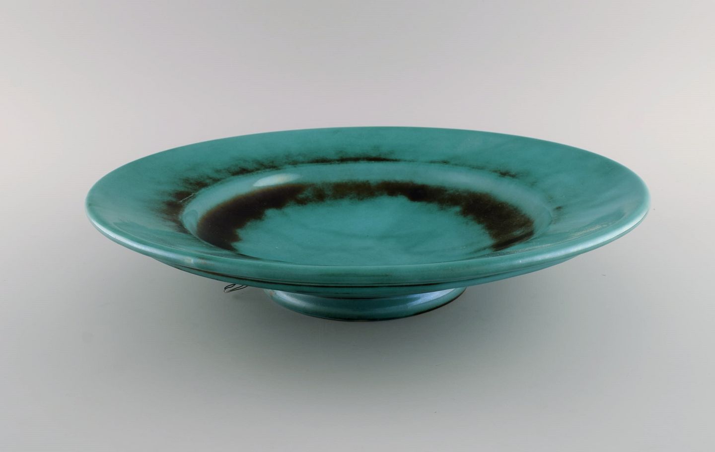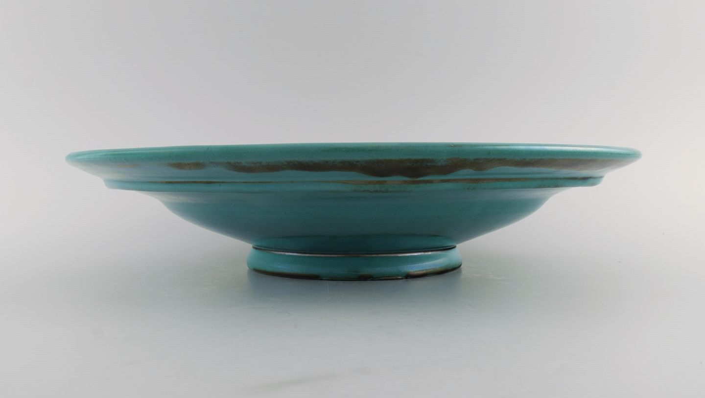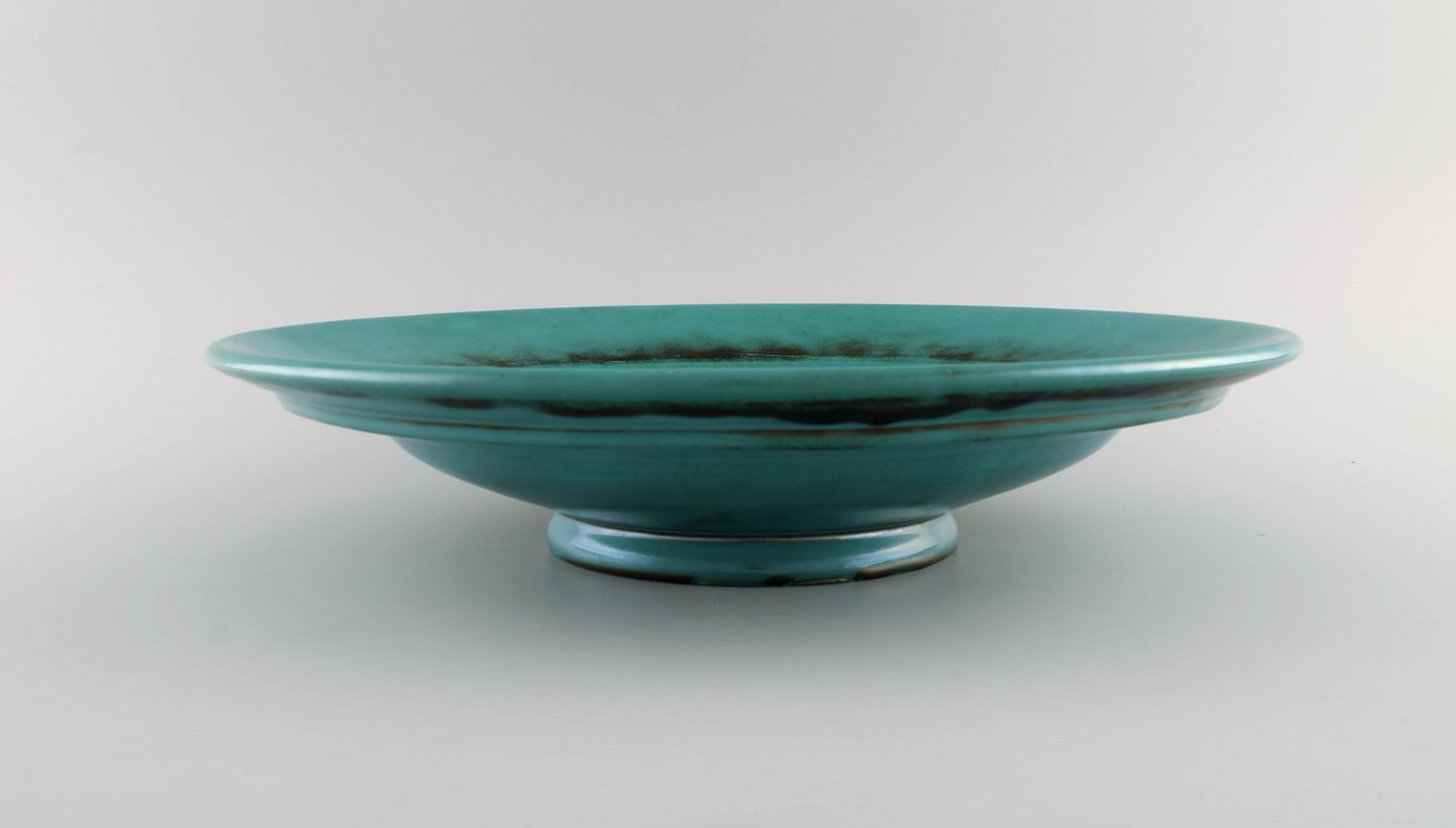 St. Erik, Upsala. Stor art deco skål / fad i glaseret keramik. Smuk glasur i grønne nuancer. 1930'erne. Måler: 37 x 8 cm. I flot stand. Stemplet.