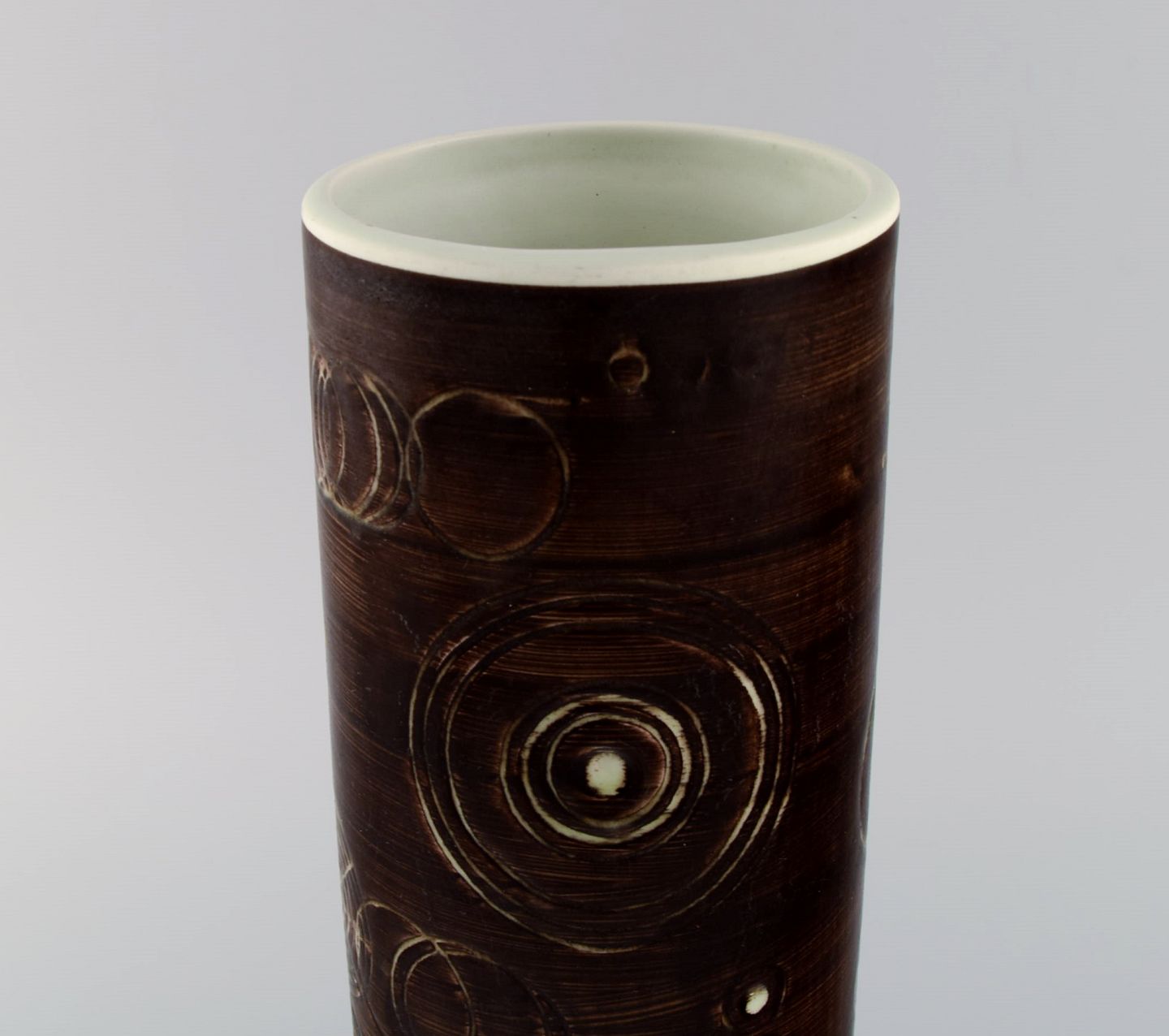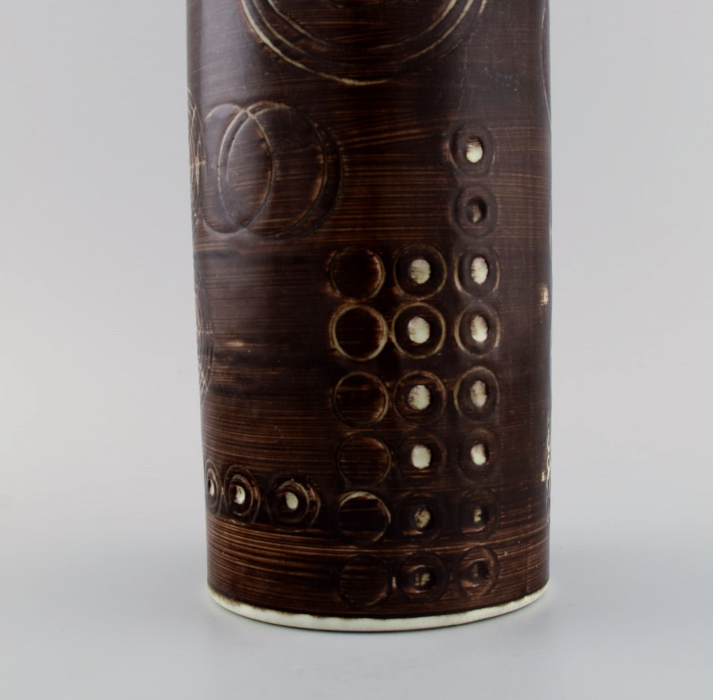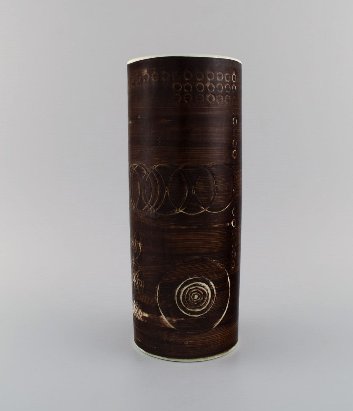 Olle Alberius for Rörstrand. Stor cylindrisk Sarek vase i håndmalet og glaseret keramik med geometriske mønstre. Svensk design, 1960/70'erne.