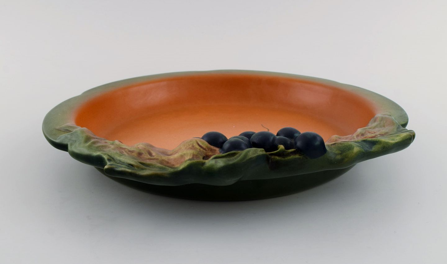 Ipsens enke, Danmark. Art nouveau fad i håndmalet keramik modelleret med vinranke og bladværk.