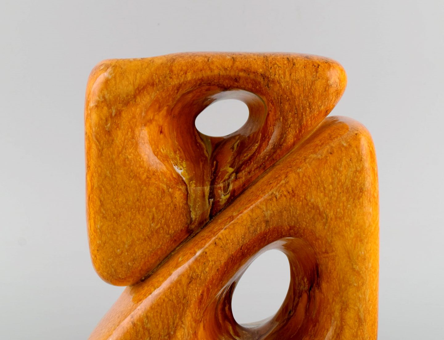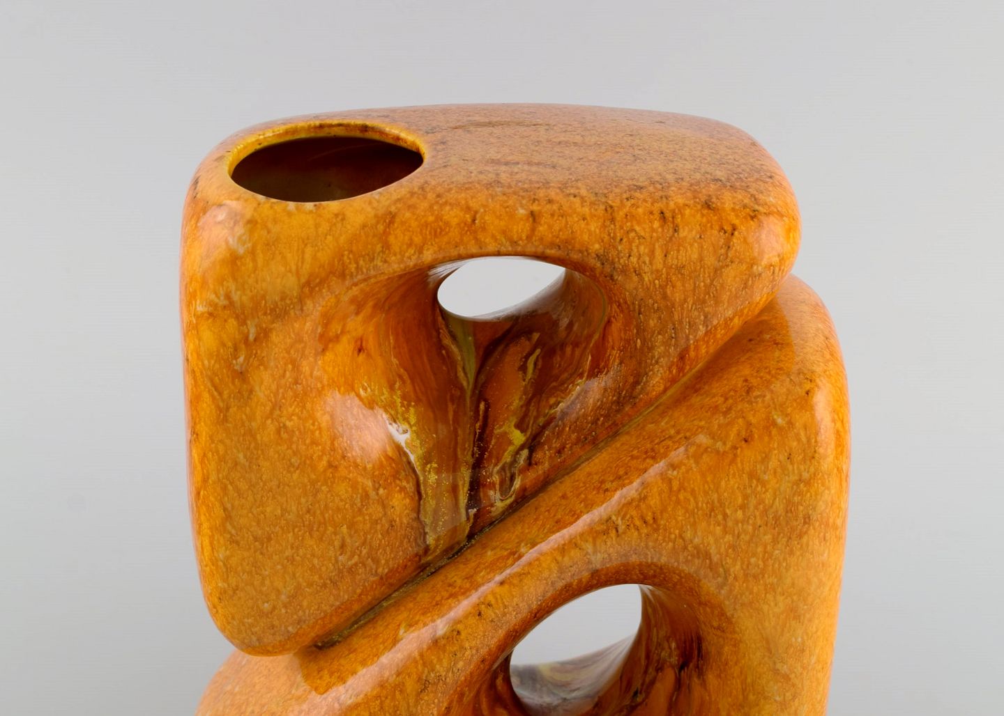 Organisk formet freeform vase i glaseret stentøj. Smuk glasur i sennepsgule nuancer. Italiensk design, 1970'erne.
