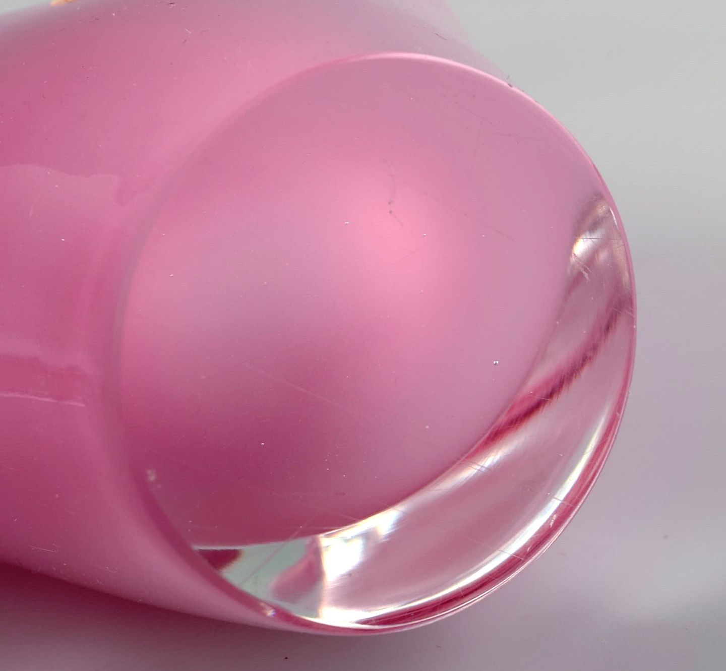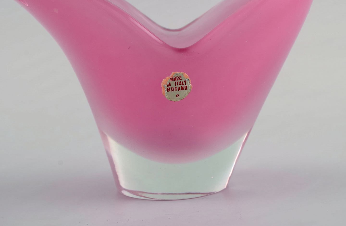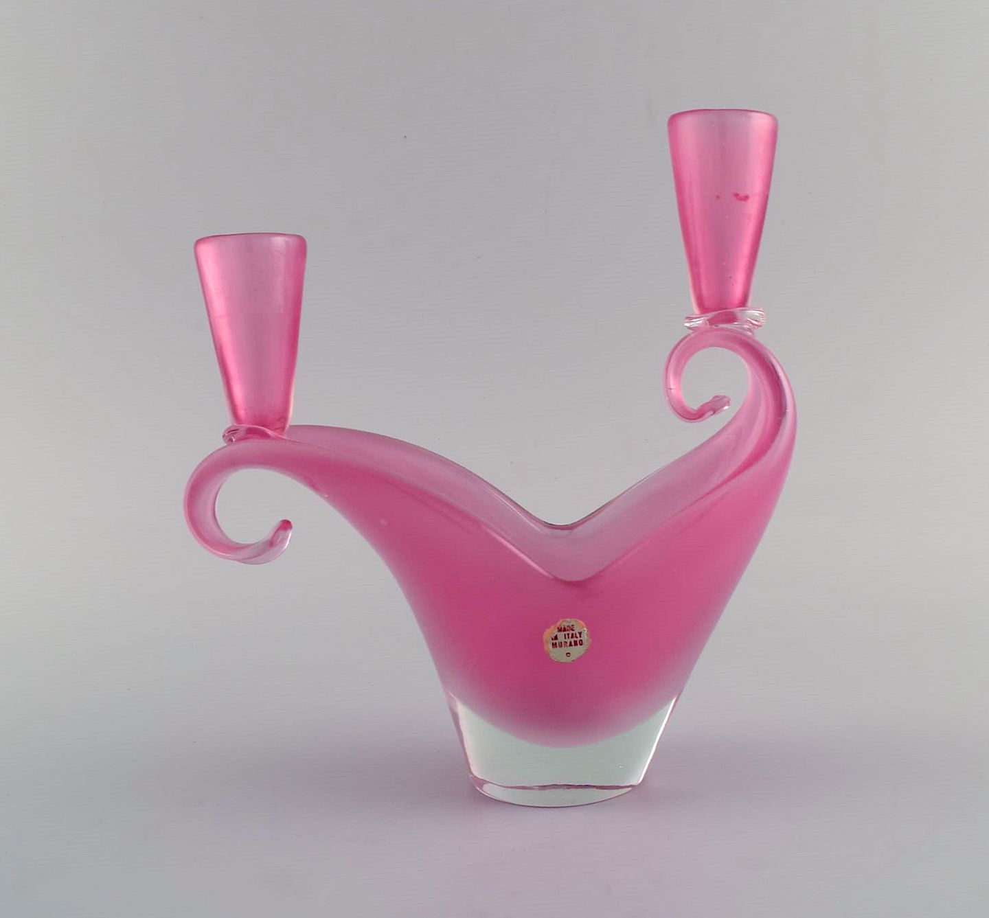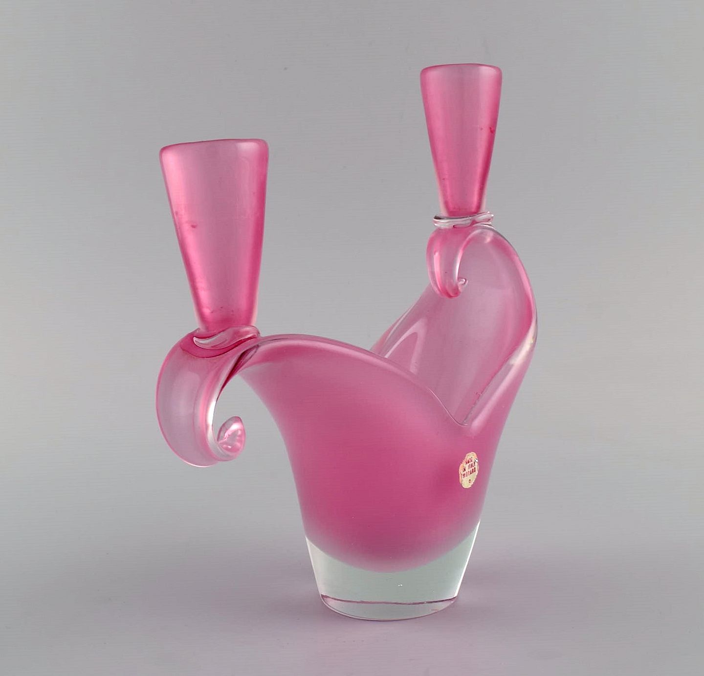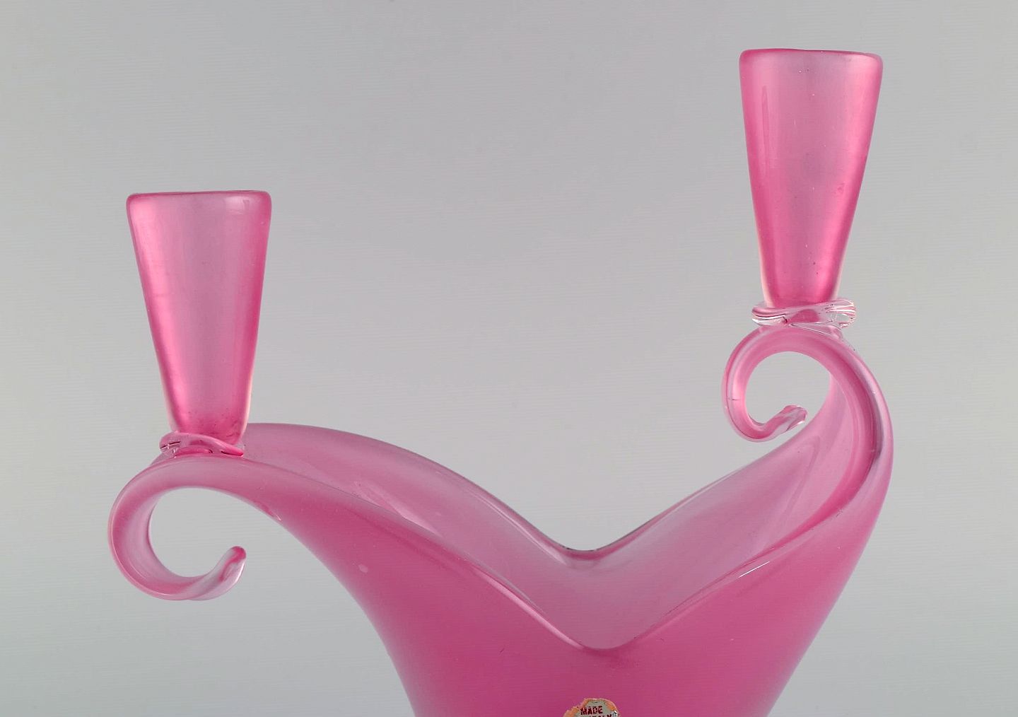 To armet Murano lysestage i lyserødt mundblæst kunstglas. Italiensk design, 1960'erne. Måler: 20 x 19 cm. I flot stand. Mærkat.