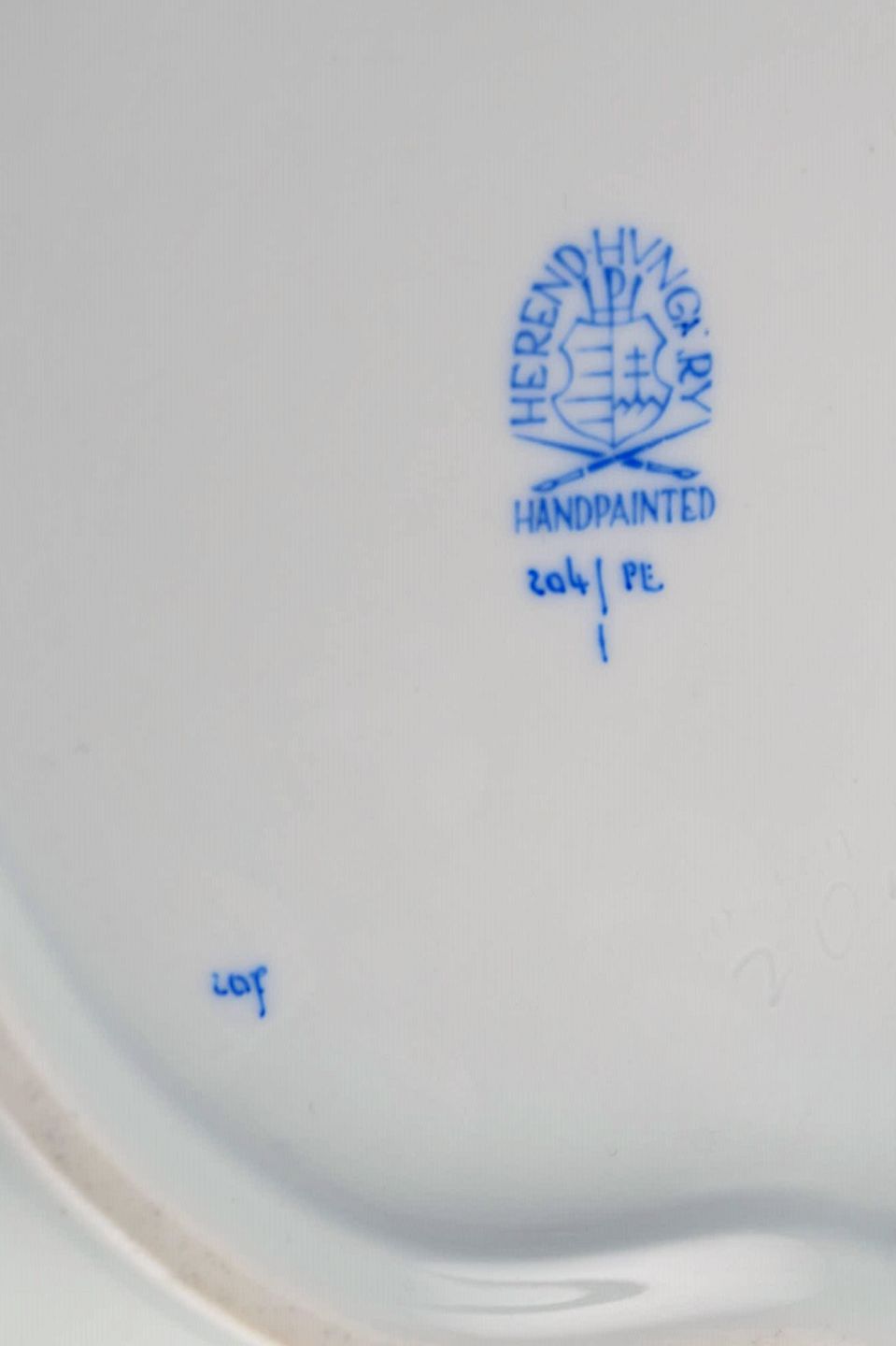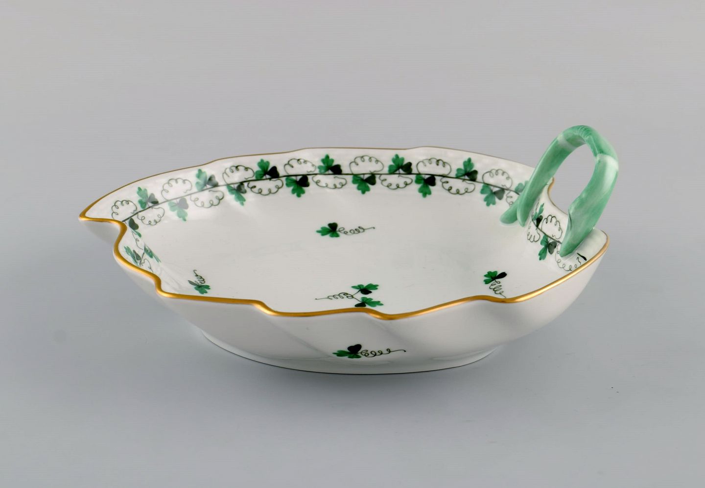 Herend bladformet skål i håndmalet porcelæn med gulddekoration. Midt 1900-tallet.