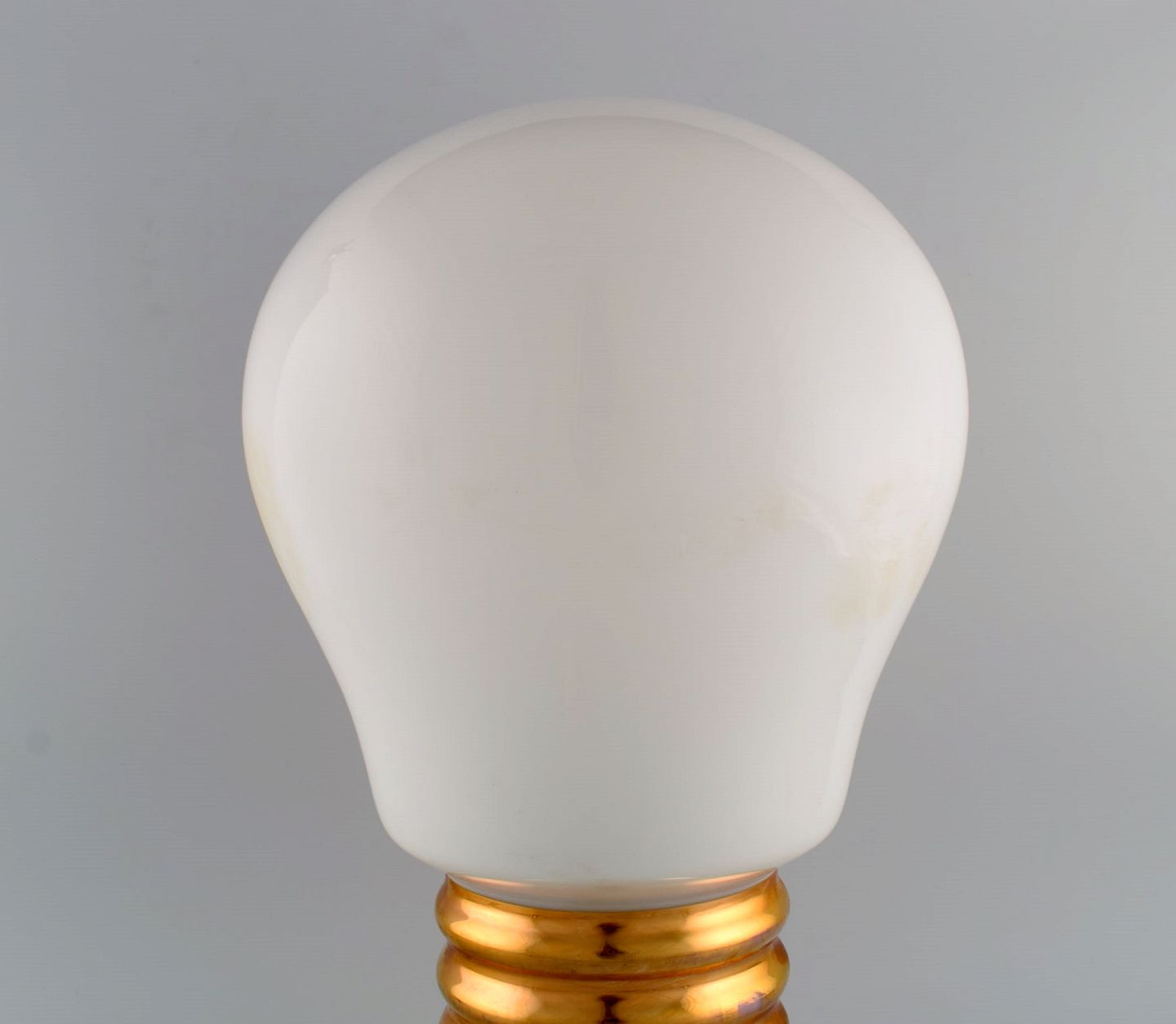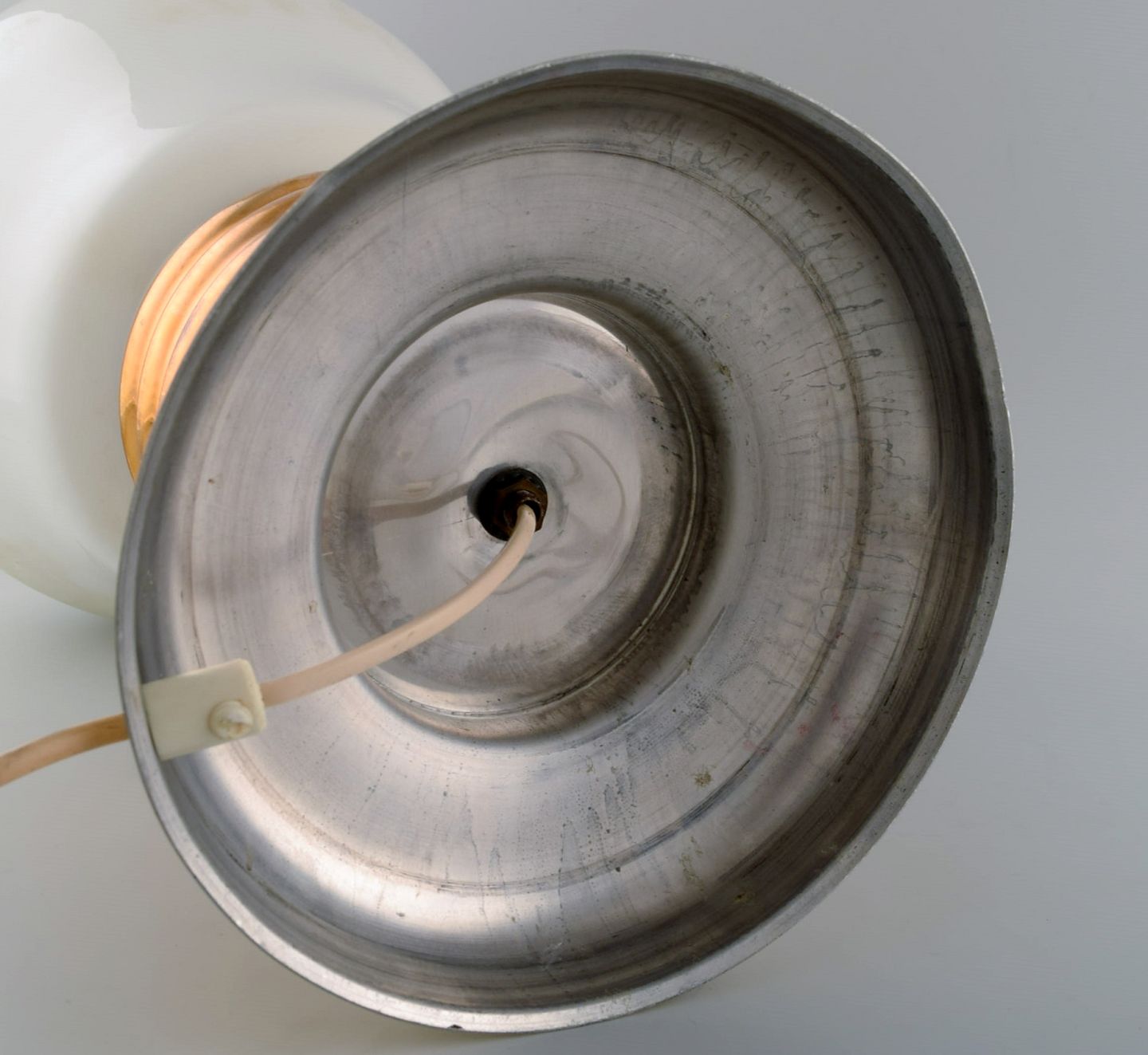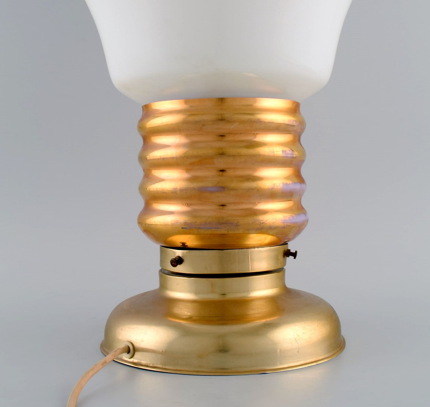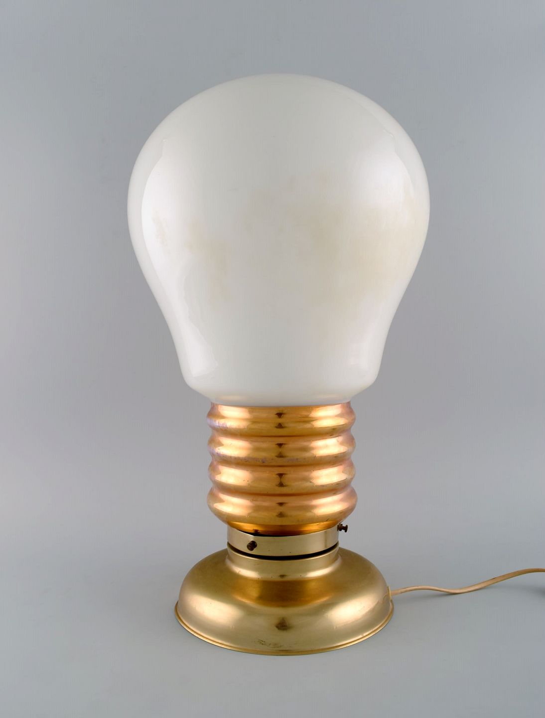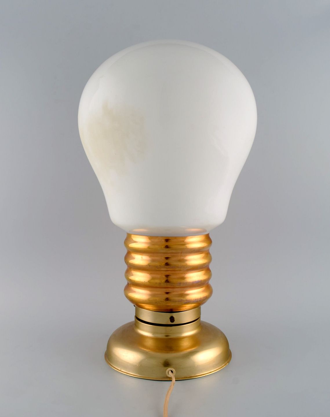 Stor bordlampe i messing og opalglas formet som elpære. 1960'erne.
