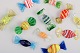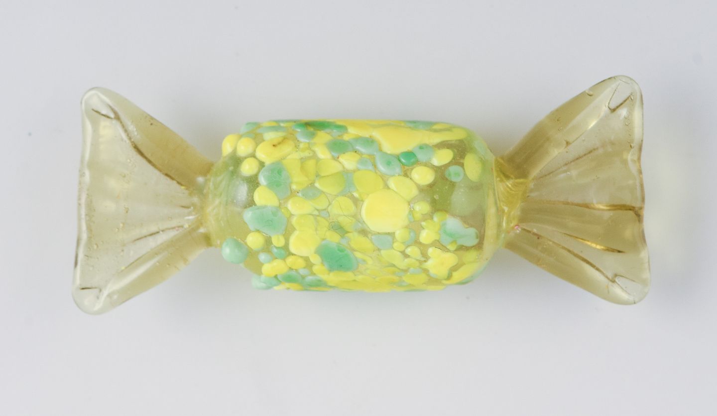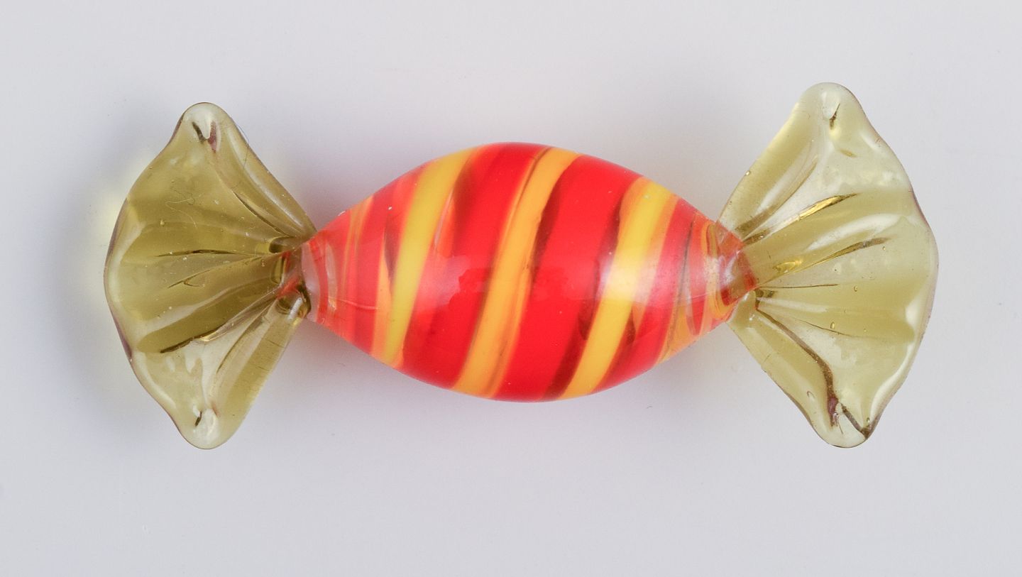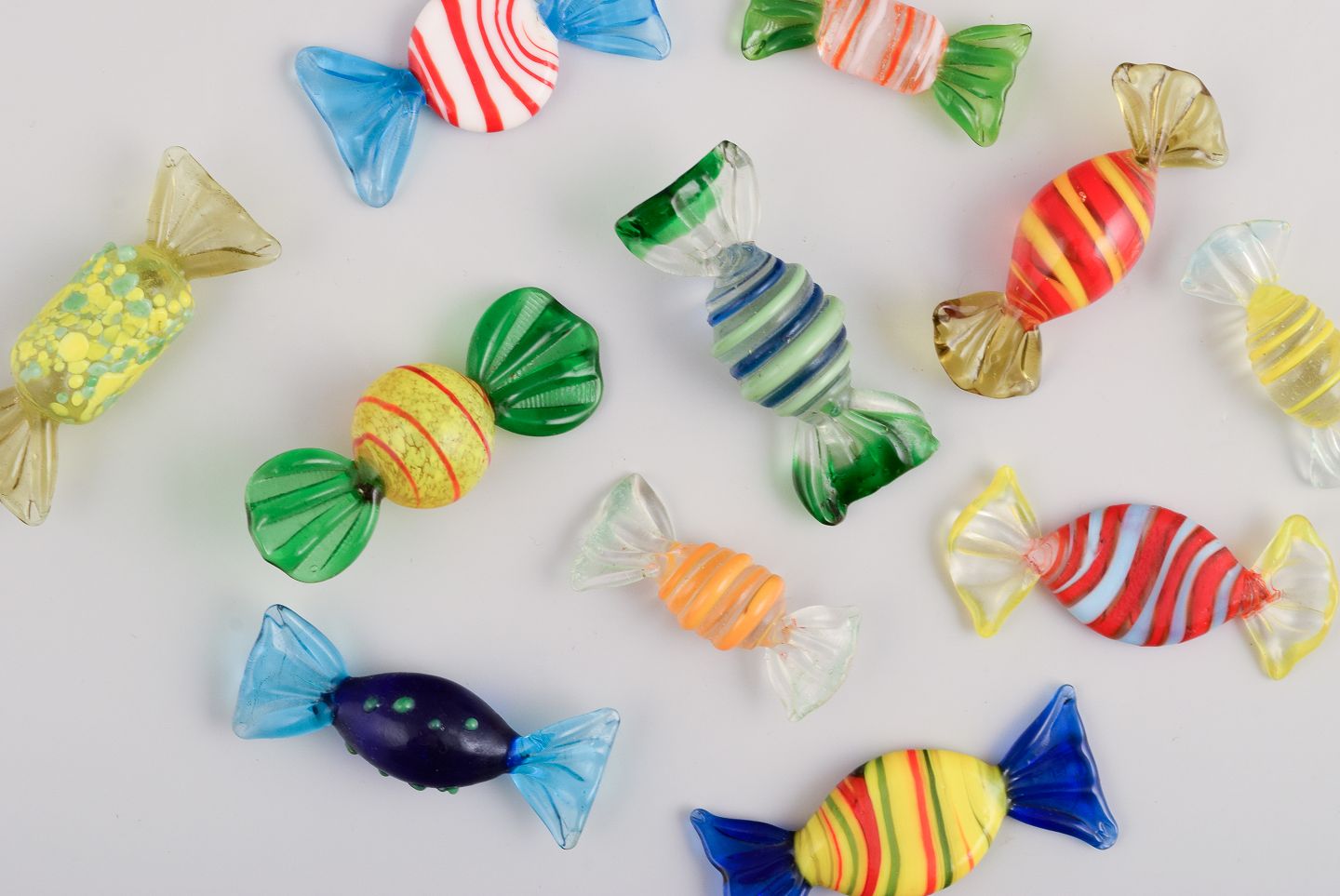 En samling på elleve stk. Murano kunstglas, farverige, stribede bolsjer.