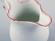 Meissen flødekande i hvidt porcelæn med rød dekoration. Cirka 1930. Kanden måler H 12 cm. x D 11 cm. inklusiv hank. Stemplet. I god stand, med mikroskår i tuden.