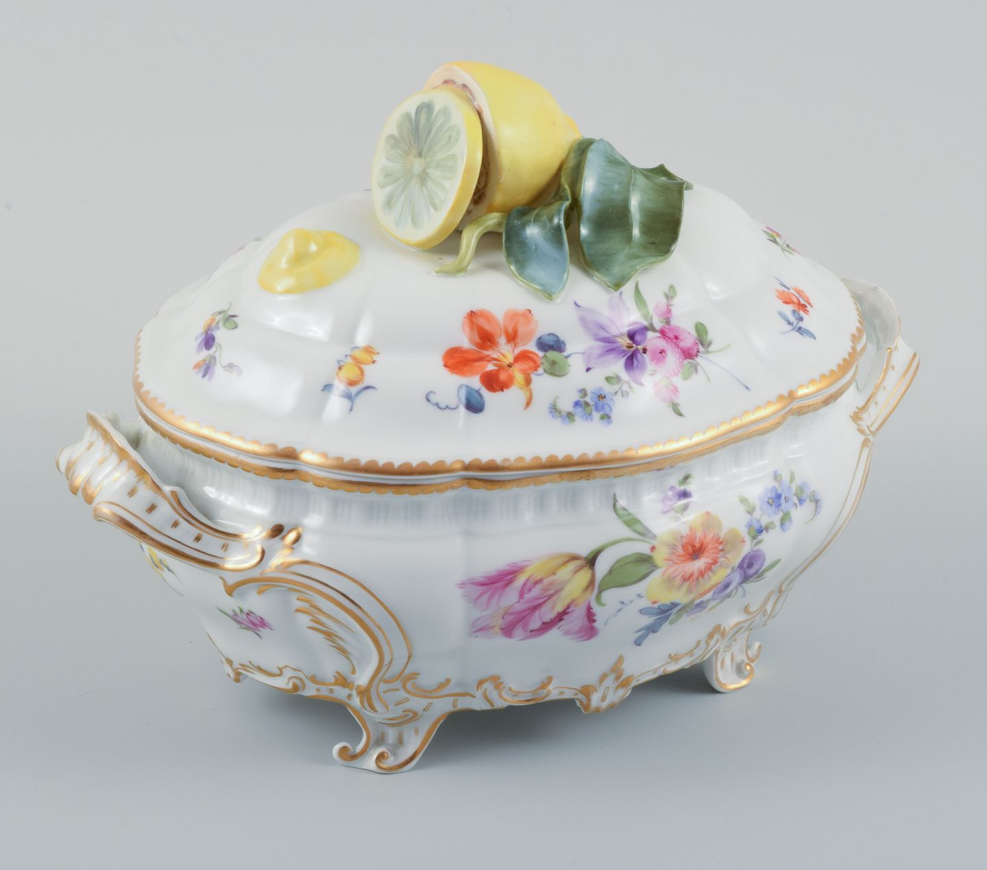 Nymphenburg, Tyskland, håndmalet lågterrin i porcelæn med polykrome blomster, lågknop i form af citron.