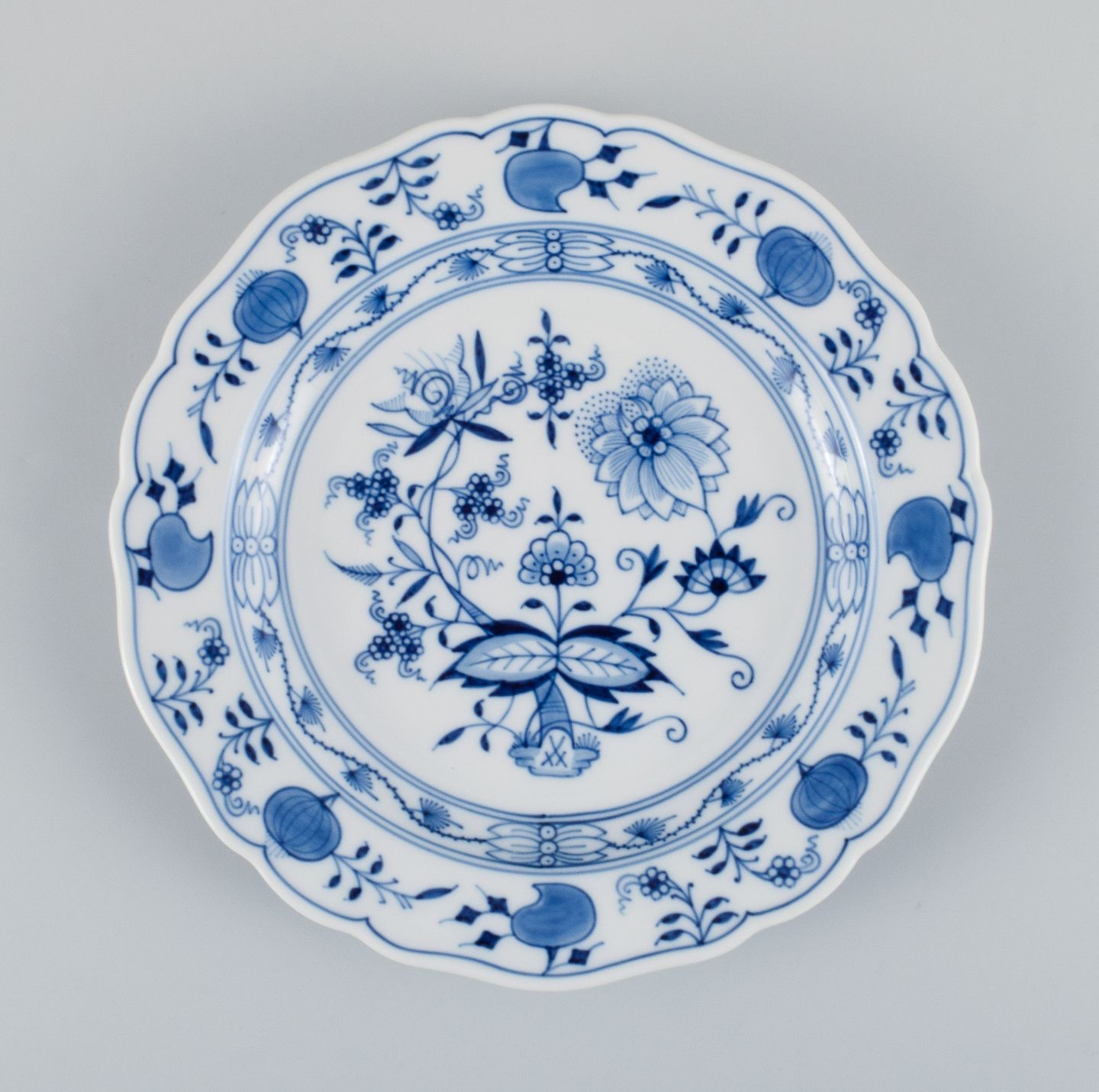 Seks antikke Meissen Løgmønstret frokosttallerkener i håndmalet porcelæn. Tidlig 1900-tallet. Mål: 22,0 cm. x 3,5 cm. Stemplet. Blandede sorteringer: Fire styk i første sortering, to styk i anden sortering.