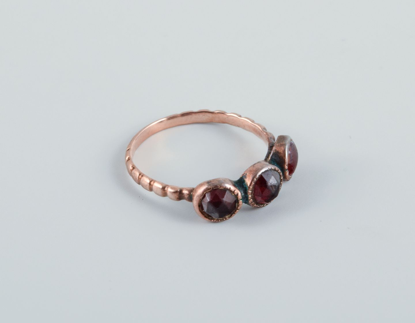 Skandinavisk guldsmed, ældre guldring prydet med tre rød sten. 1920/30erne. Ustemplet. Målt til 14 karat. Ringstørrelse 15mm.