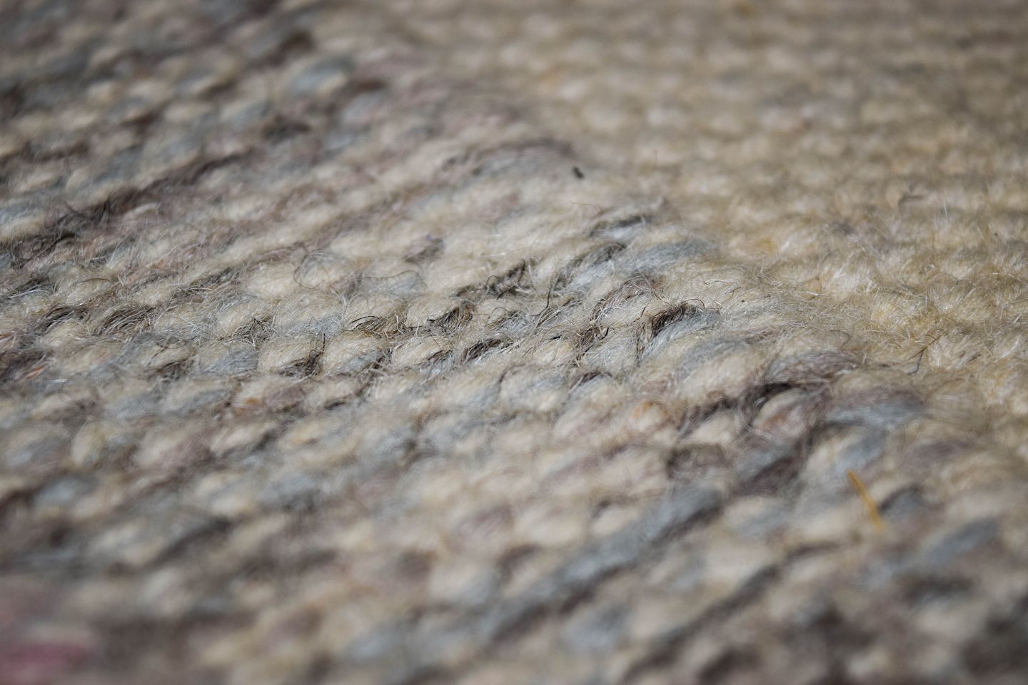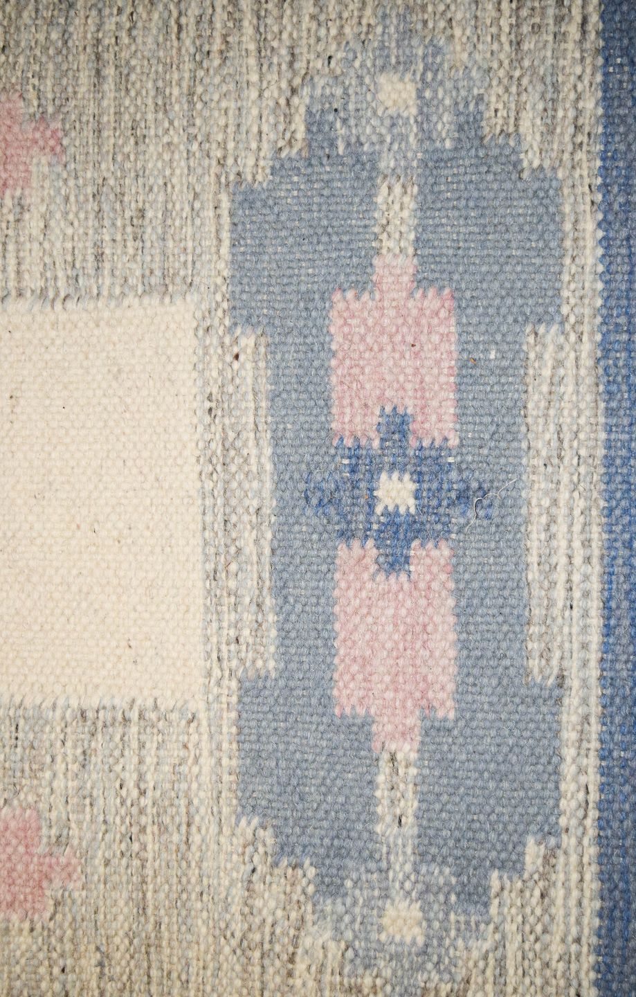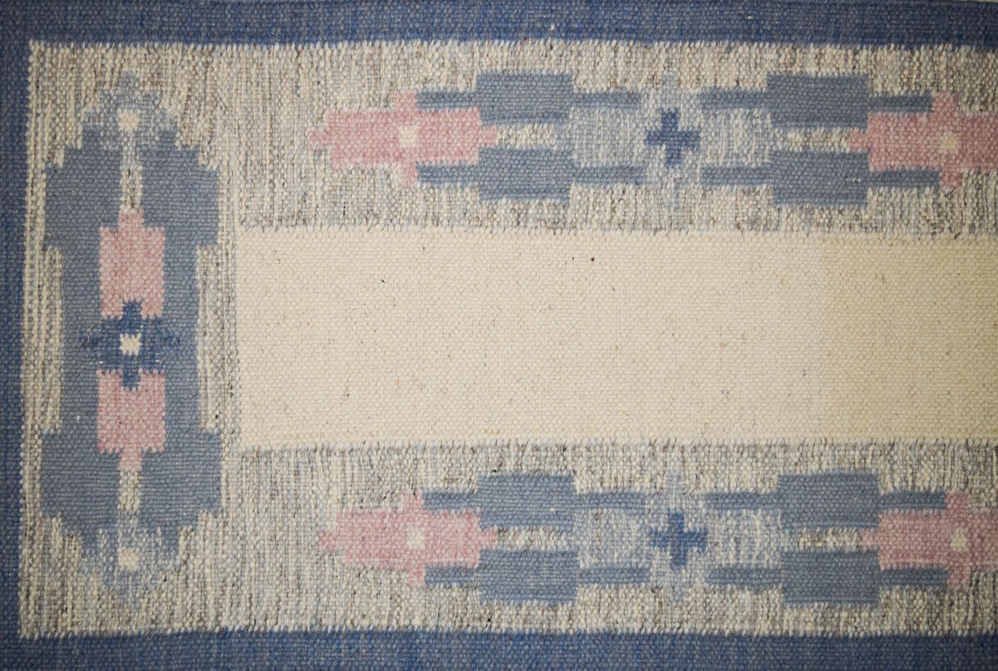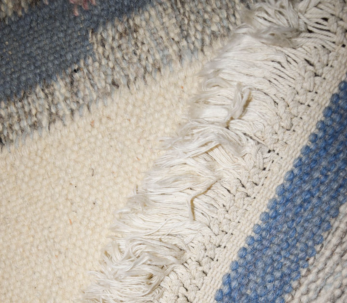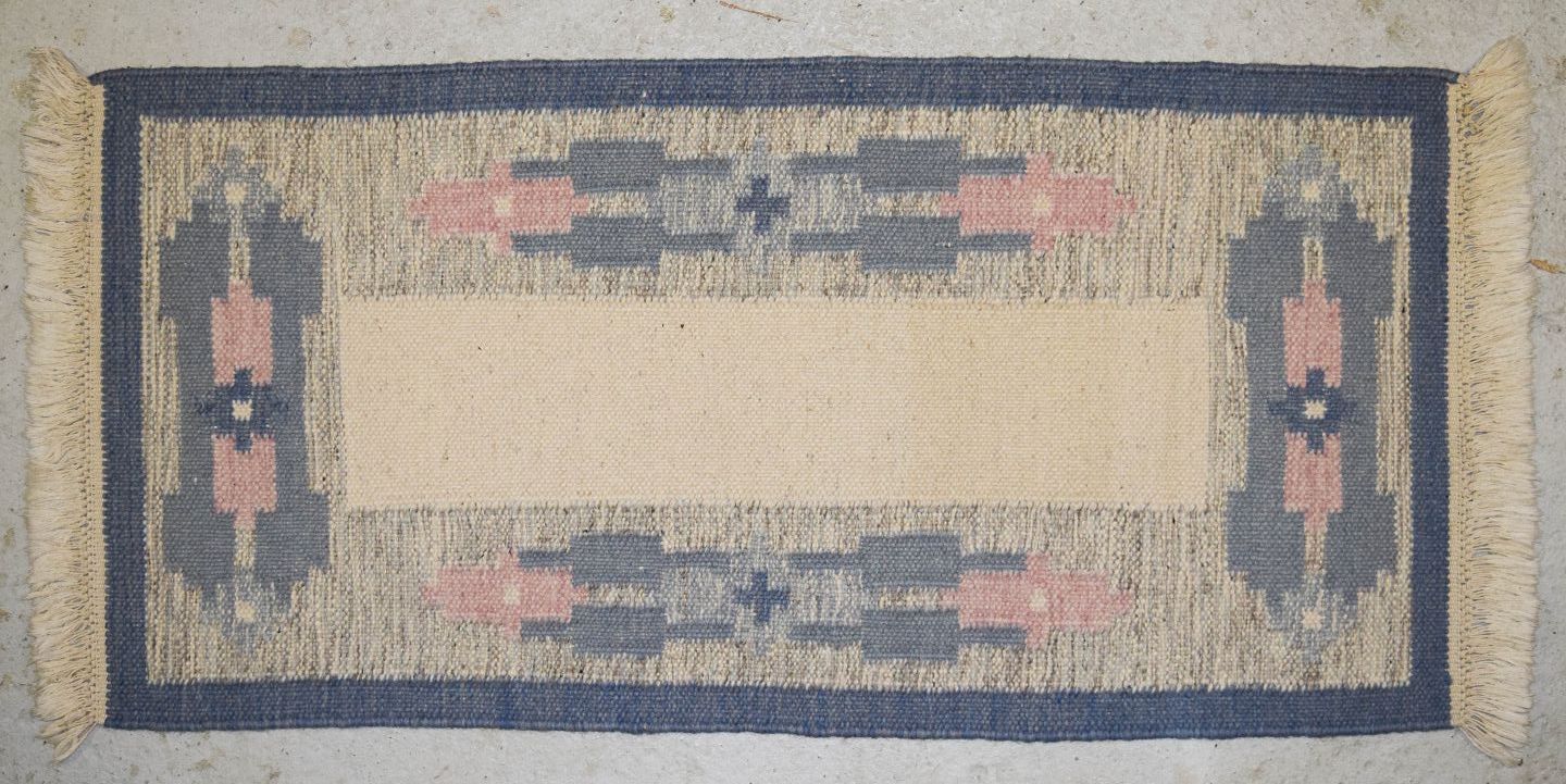 Håndvævet tæppe af uld med frynser i "Rölakan" teknik.