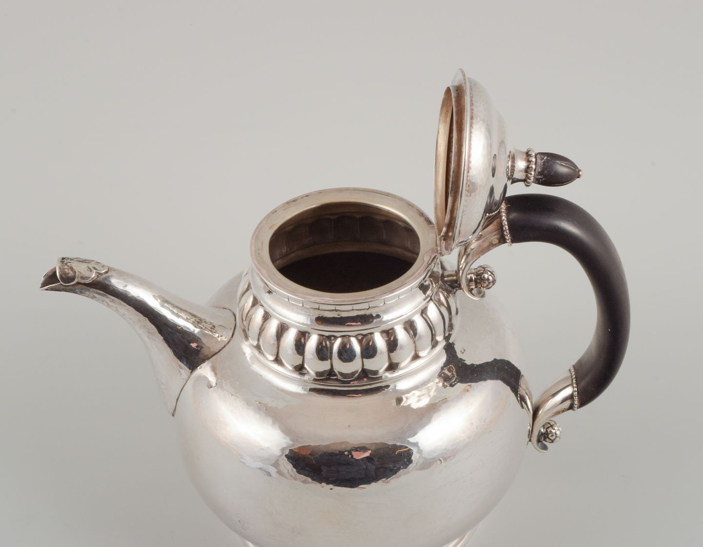 Sjælden Georg Jensen tekande i tretårnet sølv. Hank og lågknop af udskåret ibenholt. Med hængslet låg. Stemplet med 1915–1930 stempel. Dessin 49. Franske importstempler. I flot stand. Måler: H 20,0 cm.