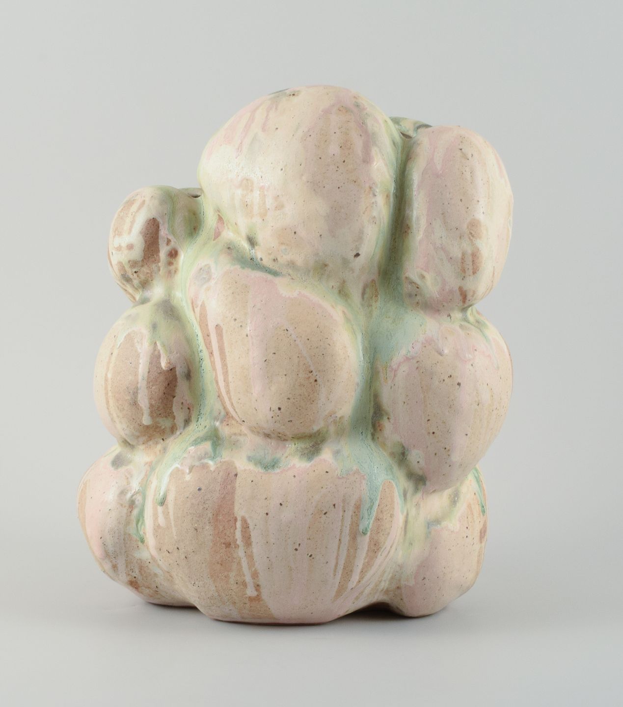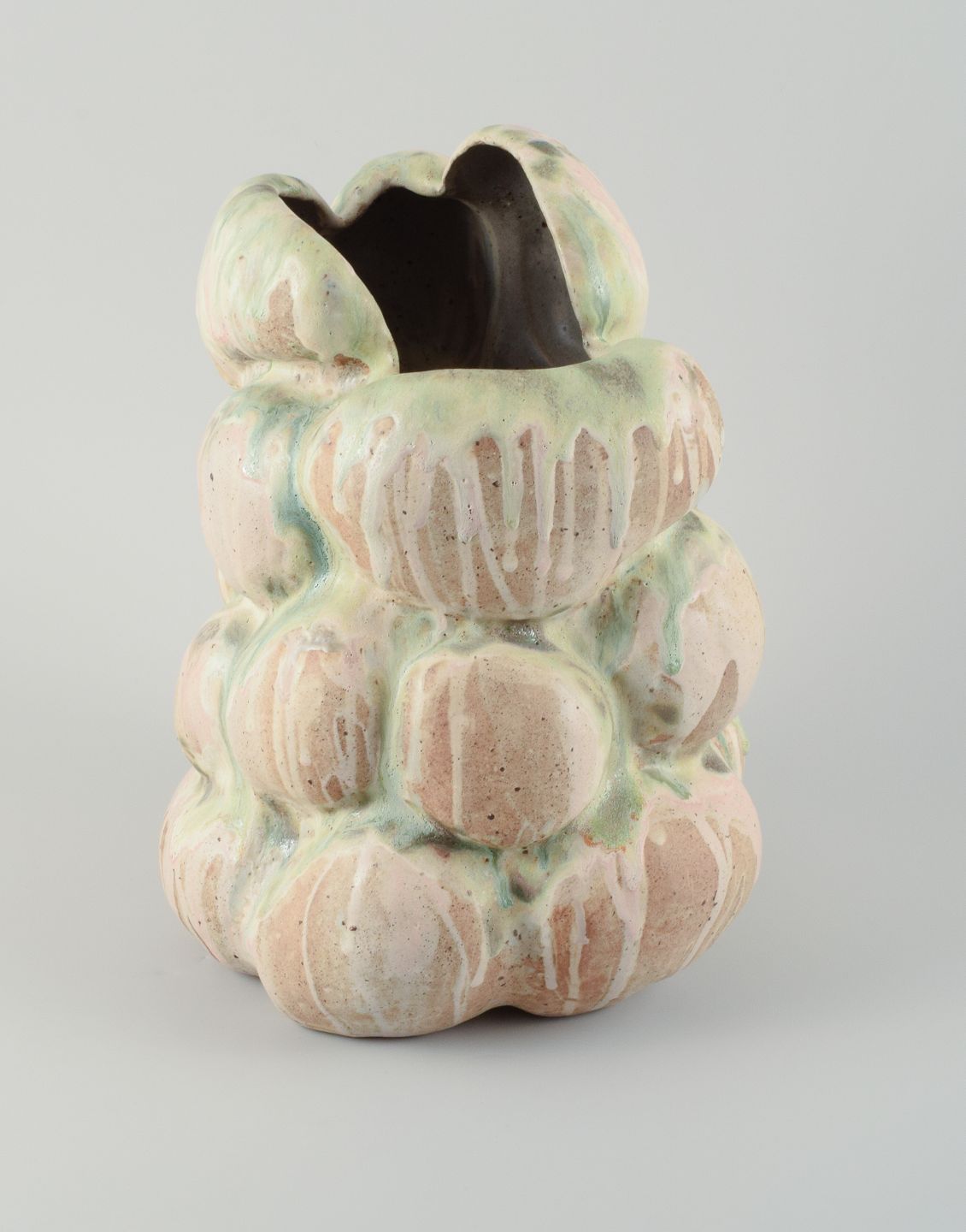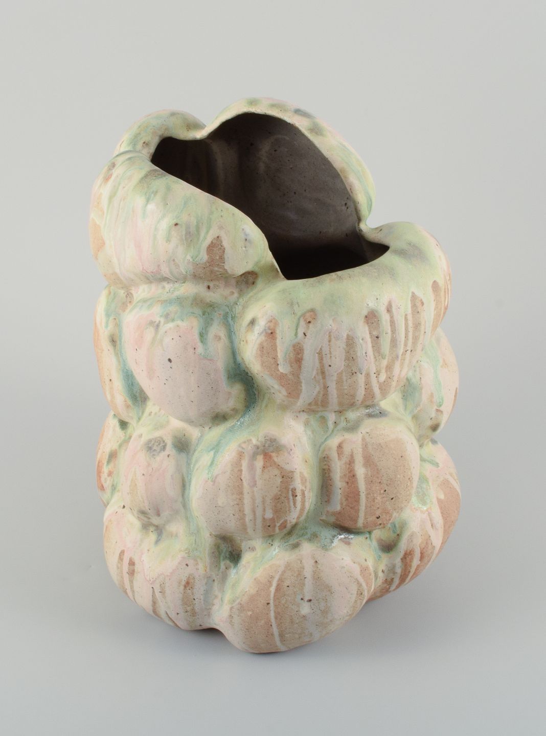 Monumental organically shaped sculpture. This piece is covered in multicolored pastel glaze, the clay showing between glaze runs.