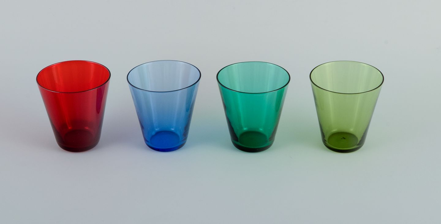 Lennart Rosén for Reijmyre, fire farvede ”Lorry” vodkaglas. Kunstglas. Svensk design. 1970'erne. I perfekt stand. Mål: D 6,5 x H 7,0 cm.