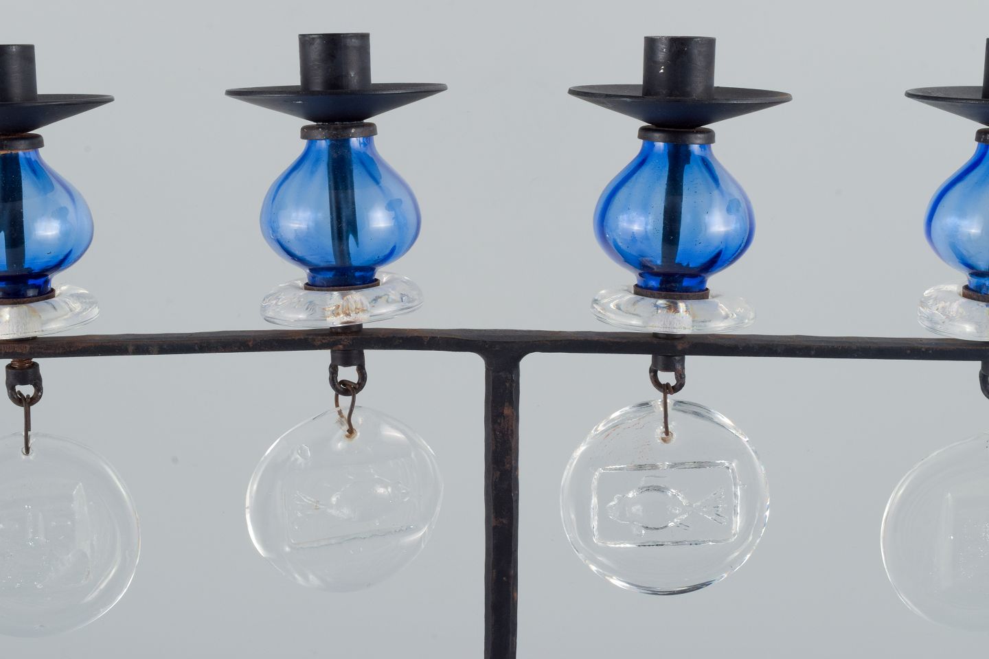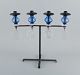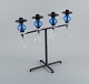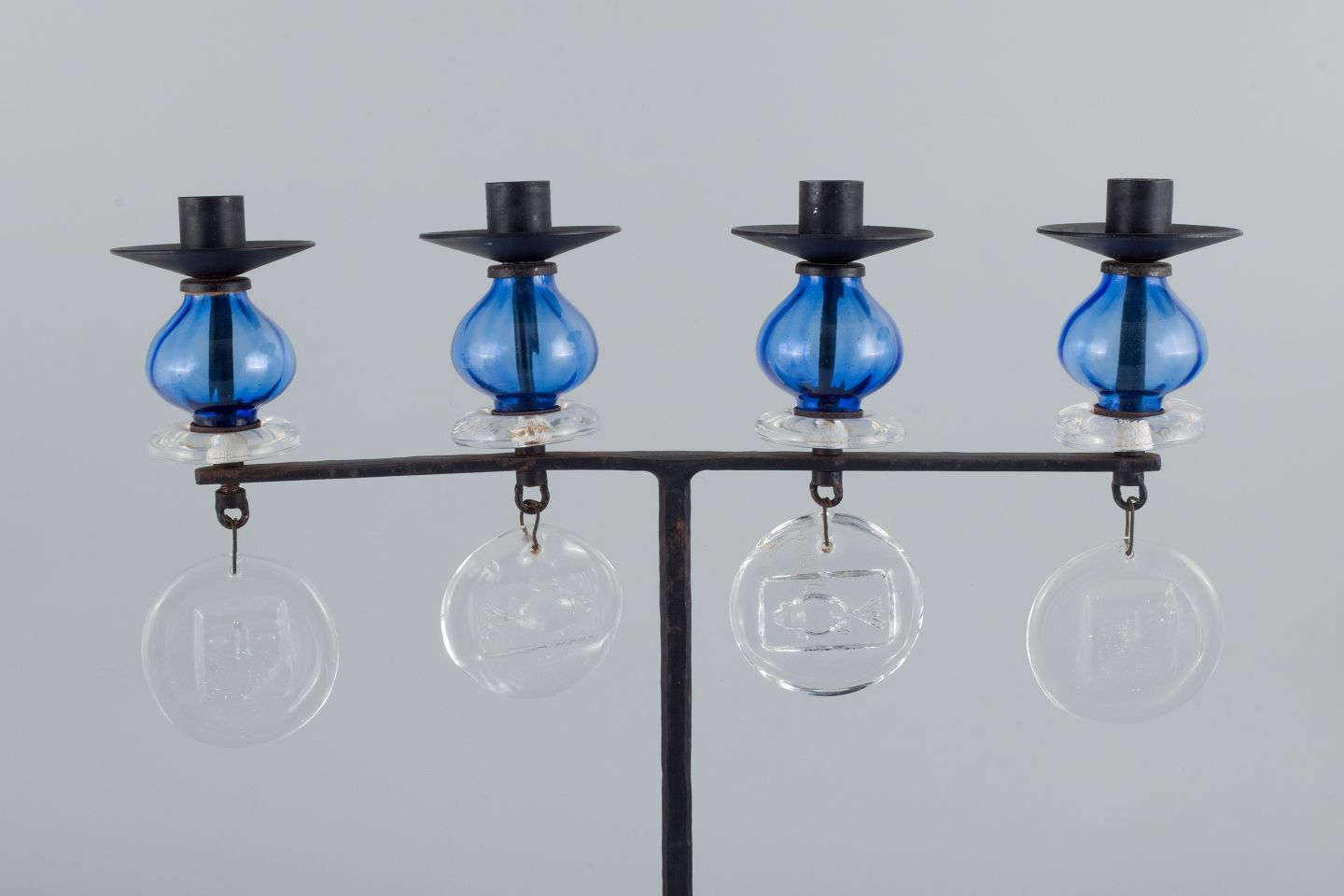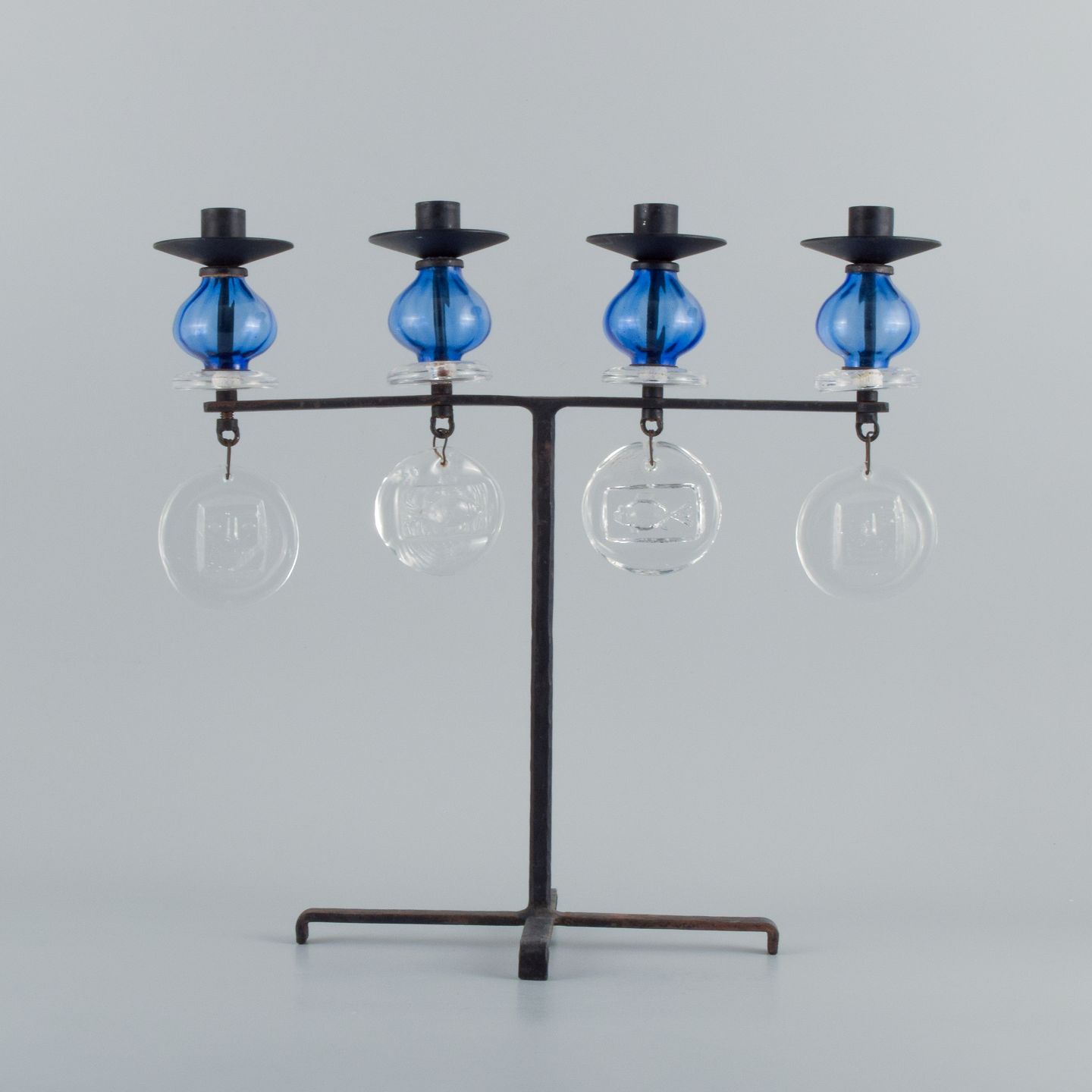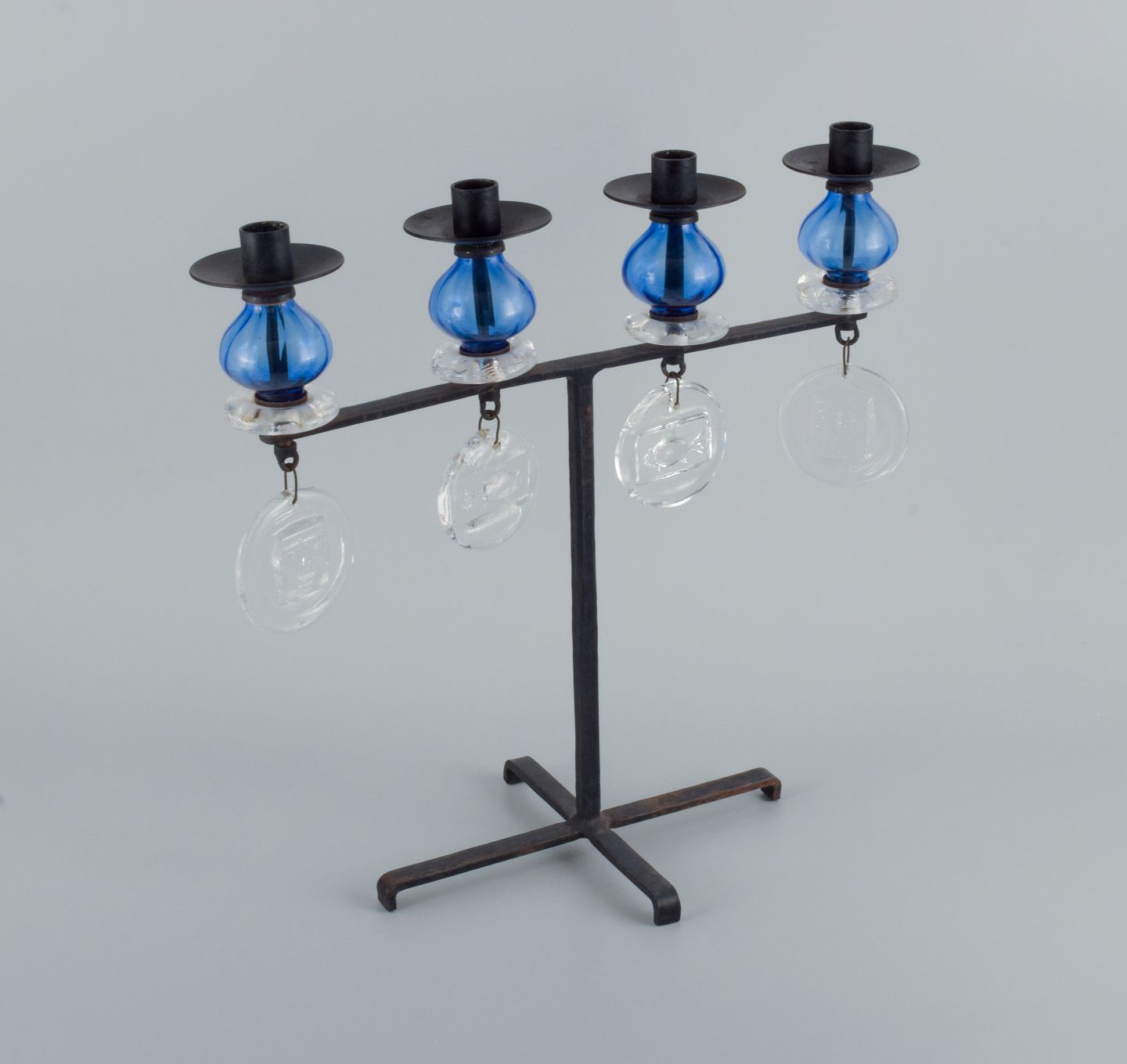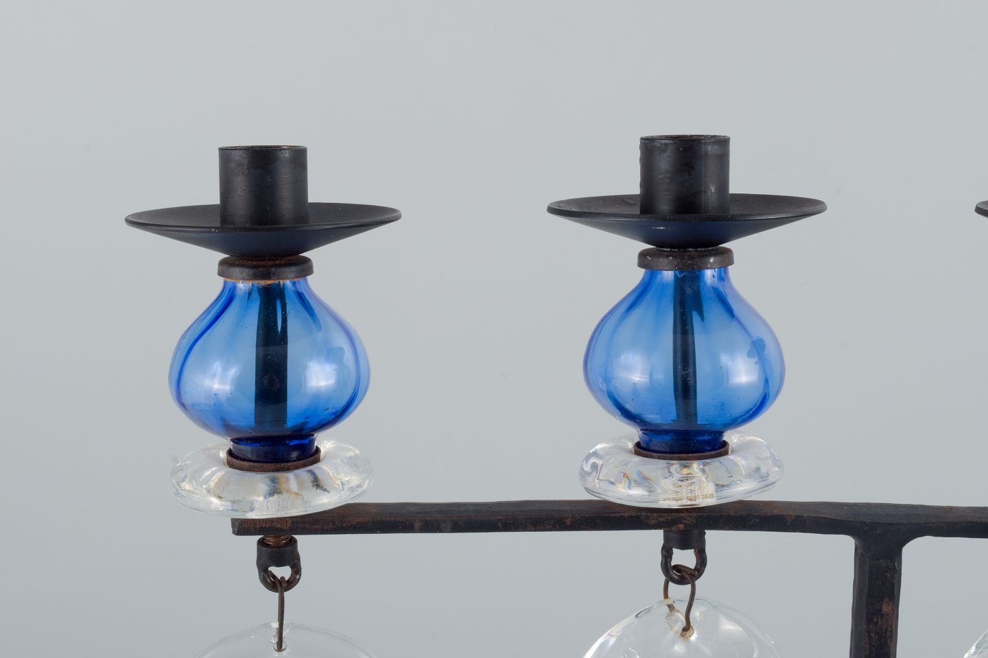 Erik Höglund for Kosta Boda, stor lysestage i støbejern med mundblæste glas. Midt 1900-tallet. I flot stand. Mål: B 43,0 x H 40,0 cm.