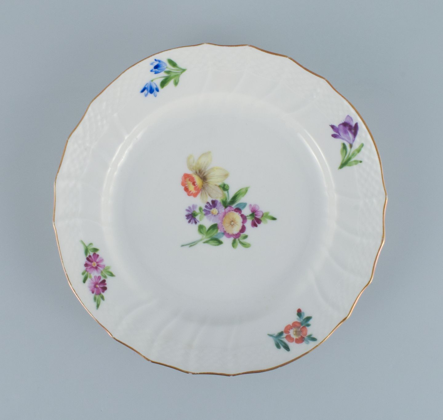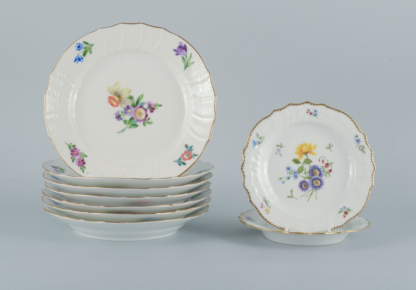 Royal Copenhagen, Saksisk blomst, ni tallerkner bestående af syv frokosttallerkner og to mindre tallerkner.