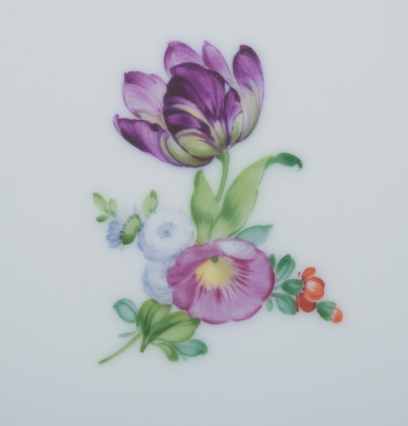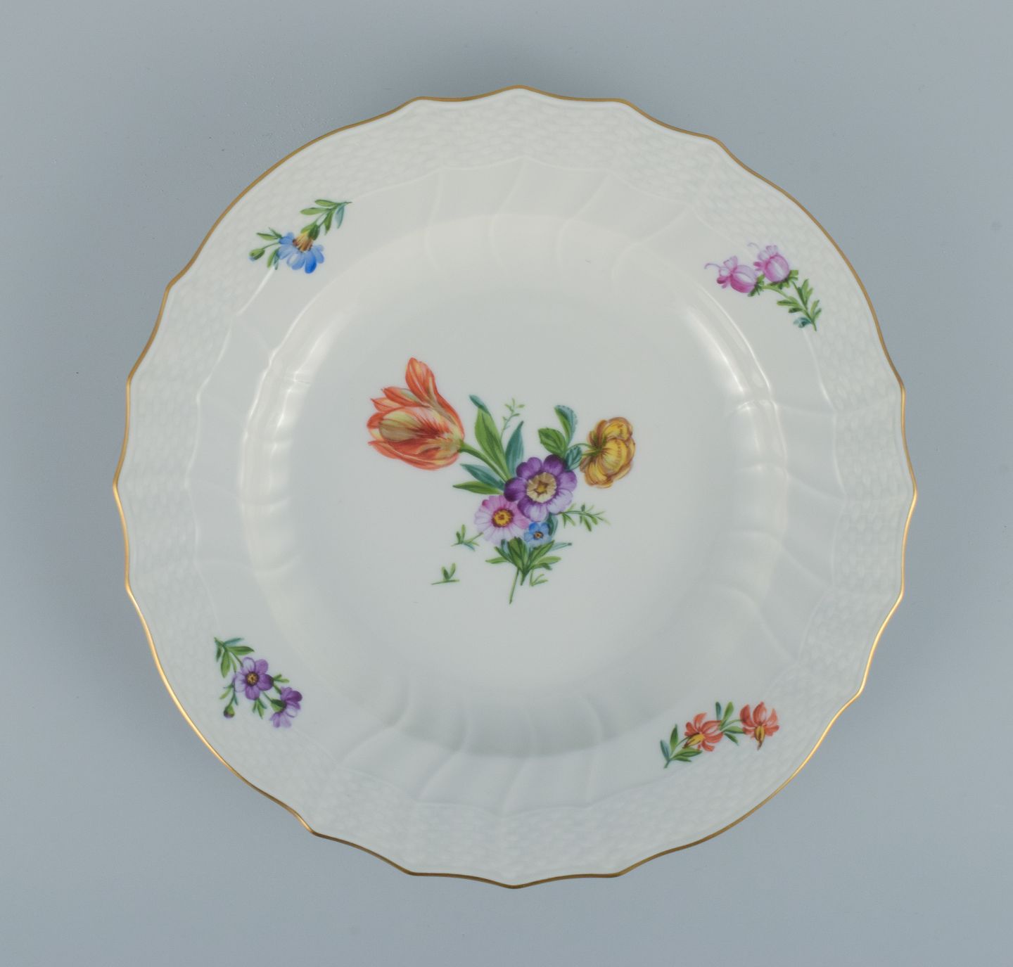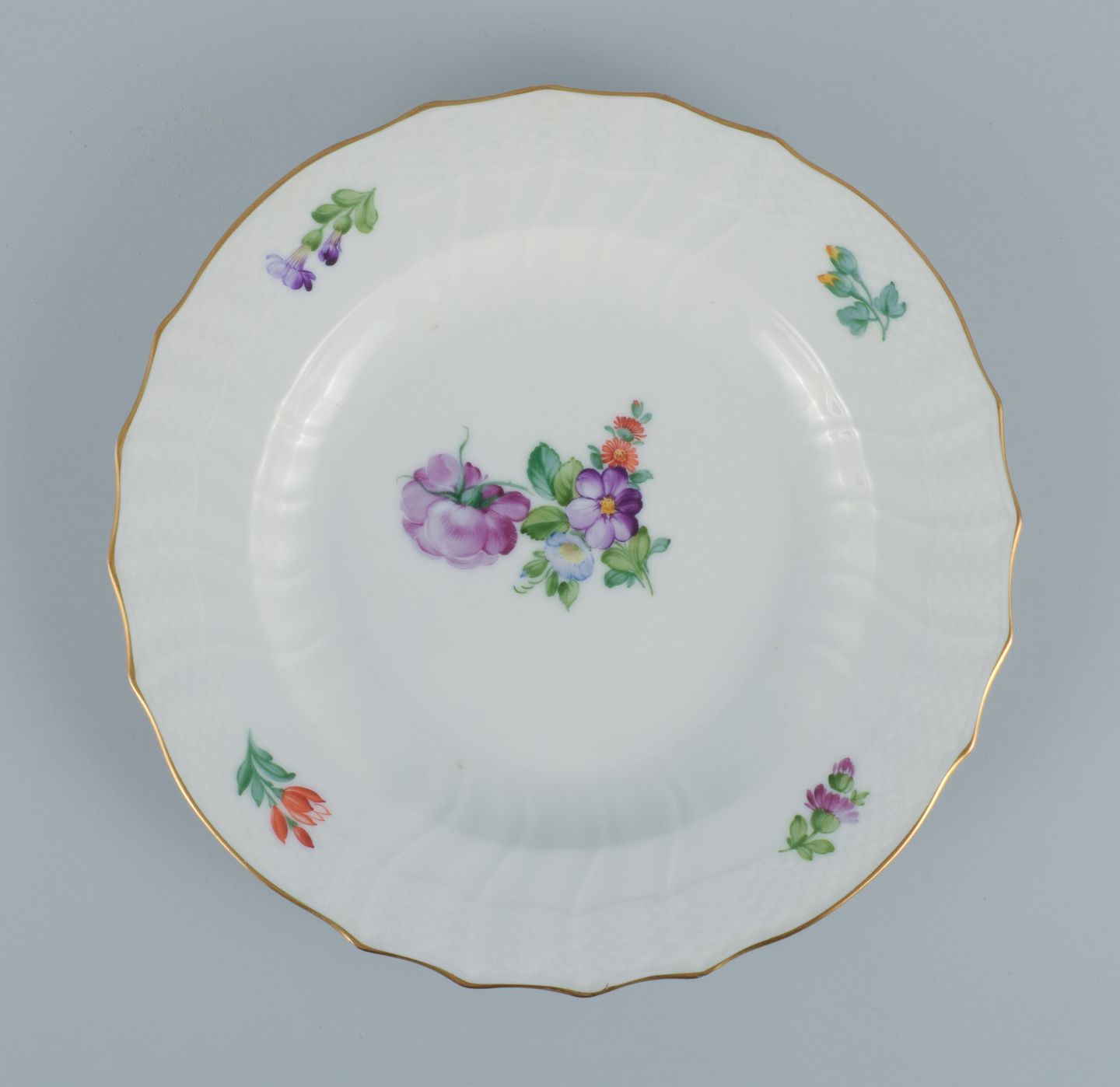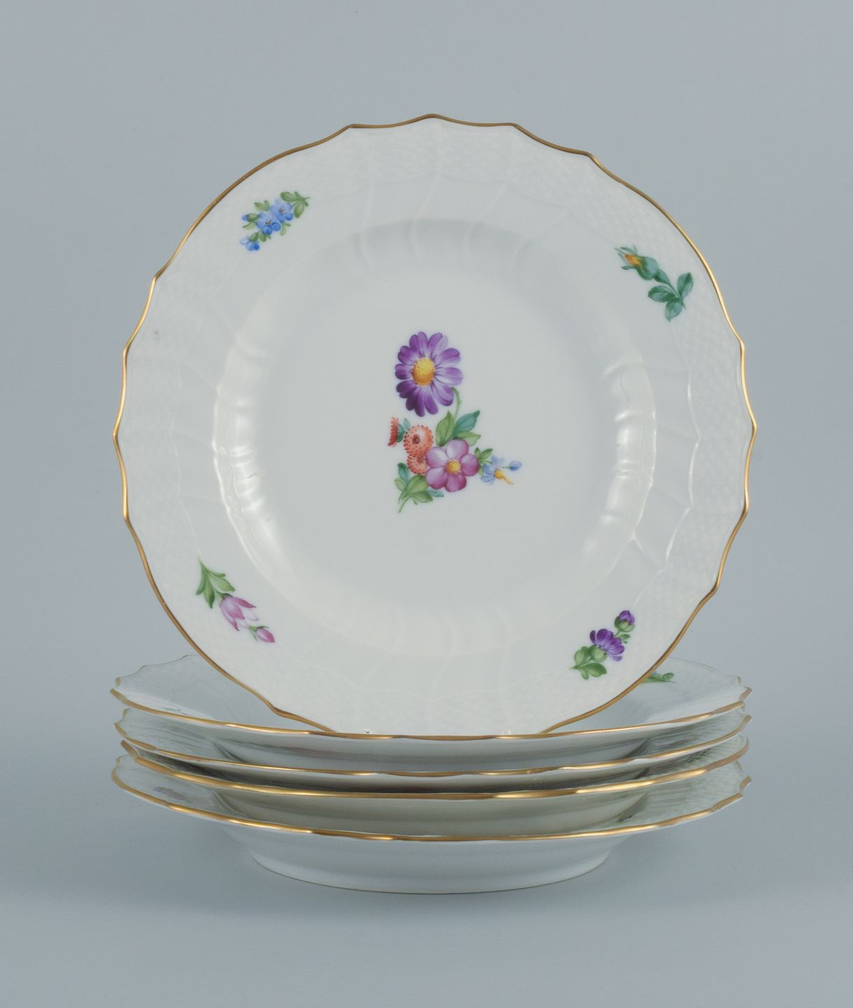 Royal Copenhagen Saksisk Blomst. Fem middagstallerkener i håndmalet porcelæn med blomster og gulddekoration. Modelnummer 493/1621. I flot stand. Stemplet. Anden sortering. Mål: D 25,5 cm.