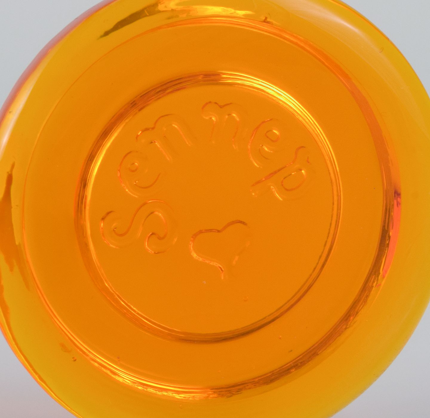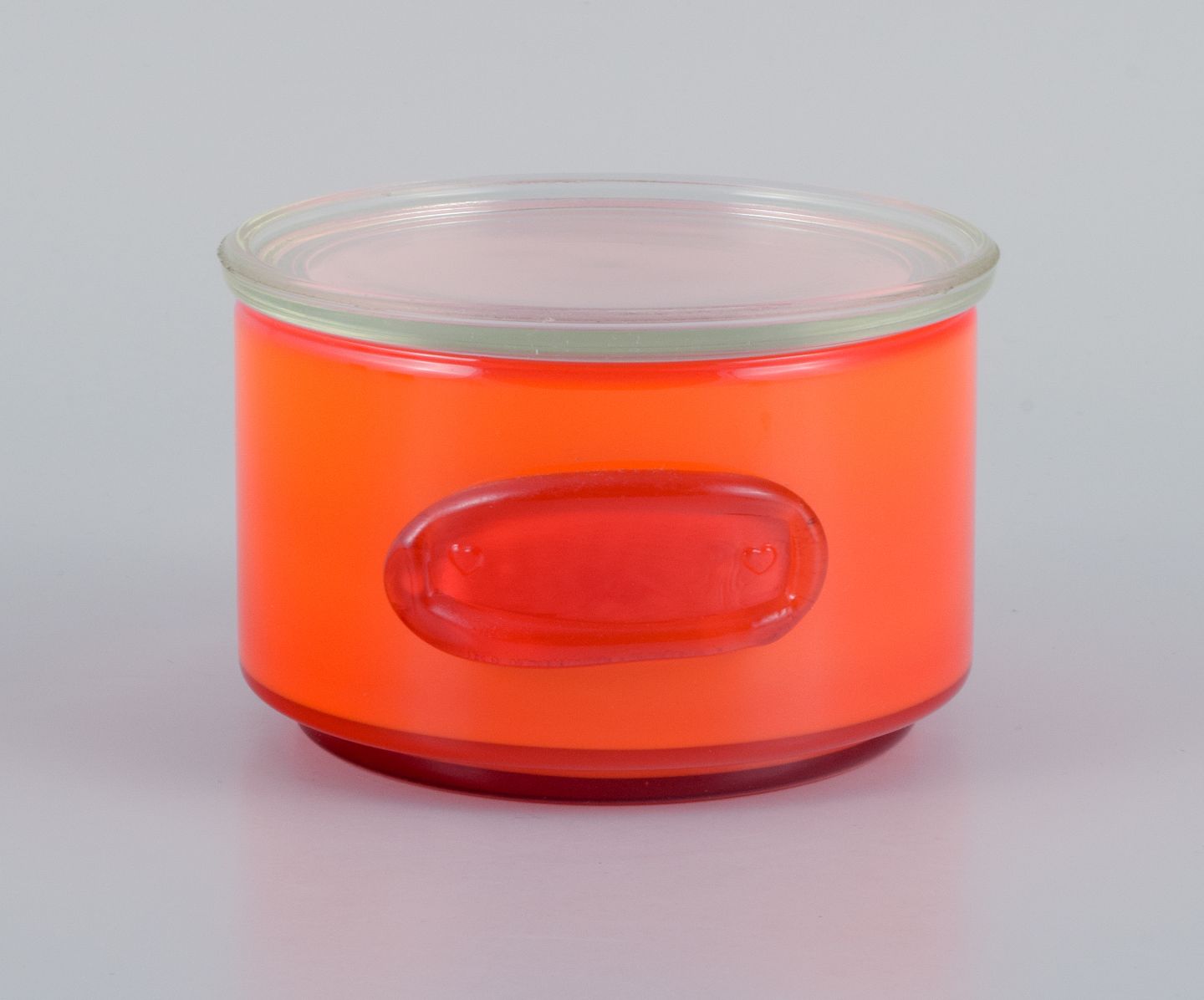 Tre skåle i orange og hvidt kunstglas. To med tilhørende låg.