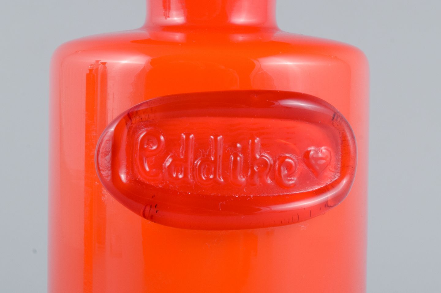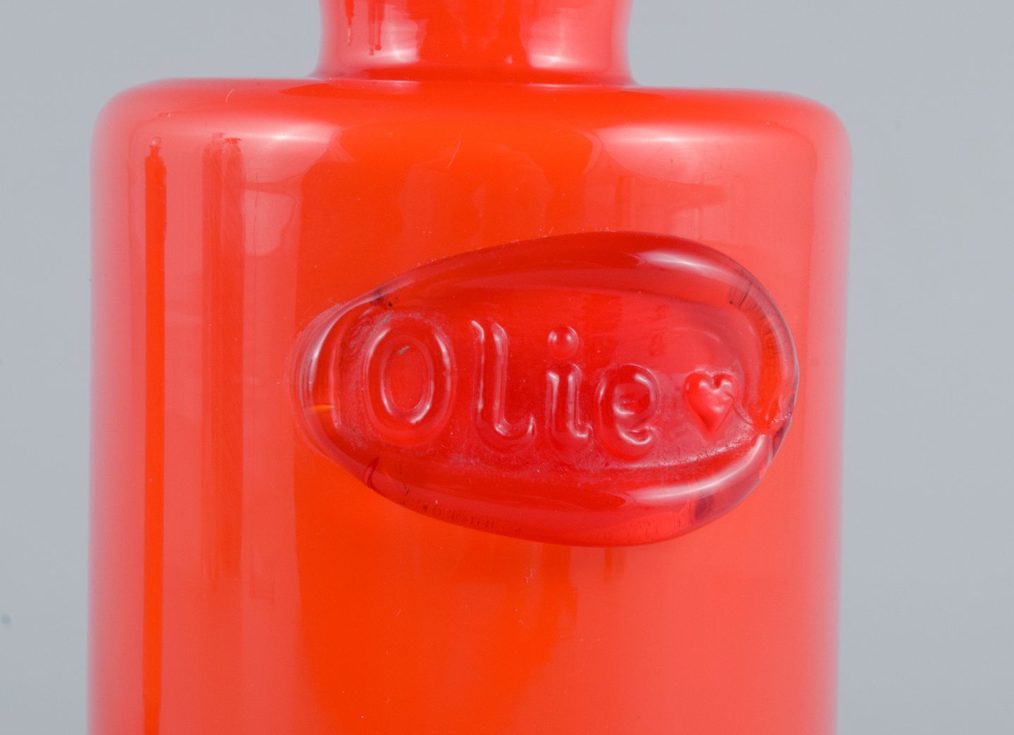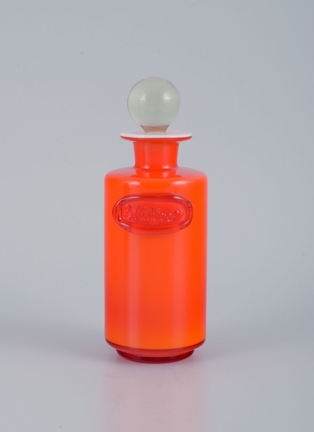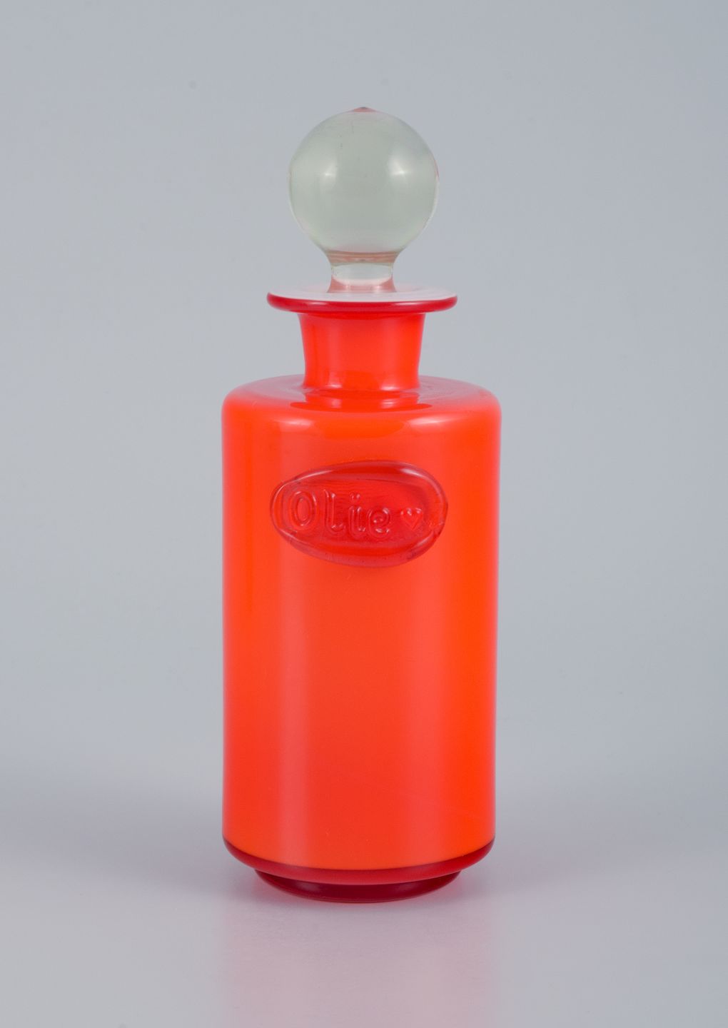 Michael Bang for Holmegaard. Olie og eddike beholdere i orange og hvidt kunstglas. 1960'erne. I perfekt stand. Mål: D 5,5 x H 14,5 cm.