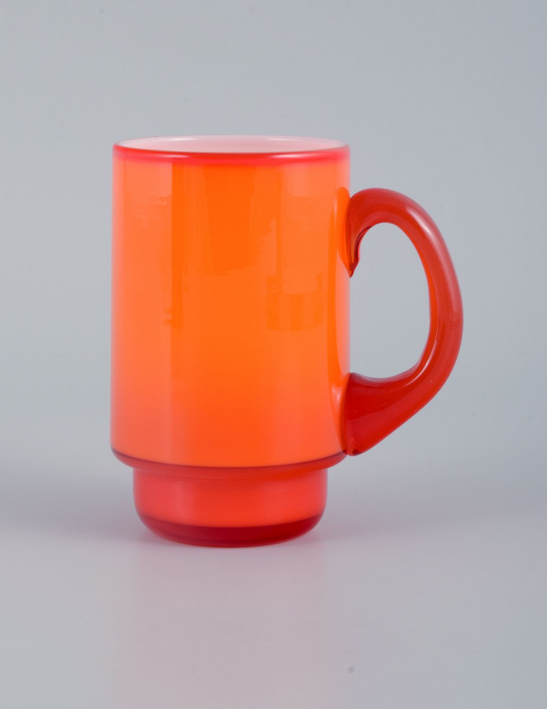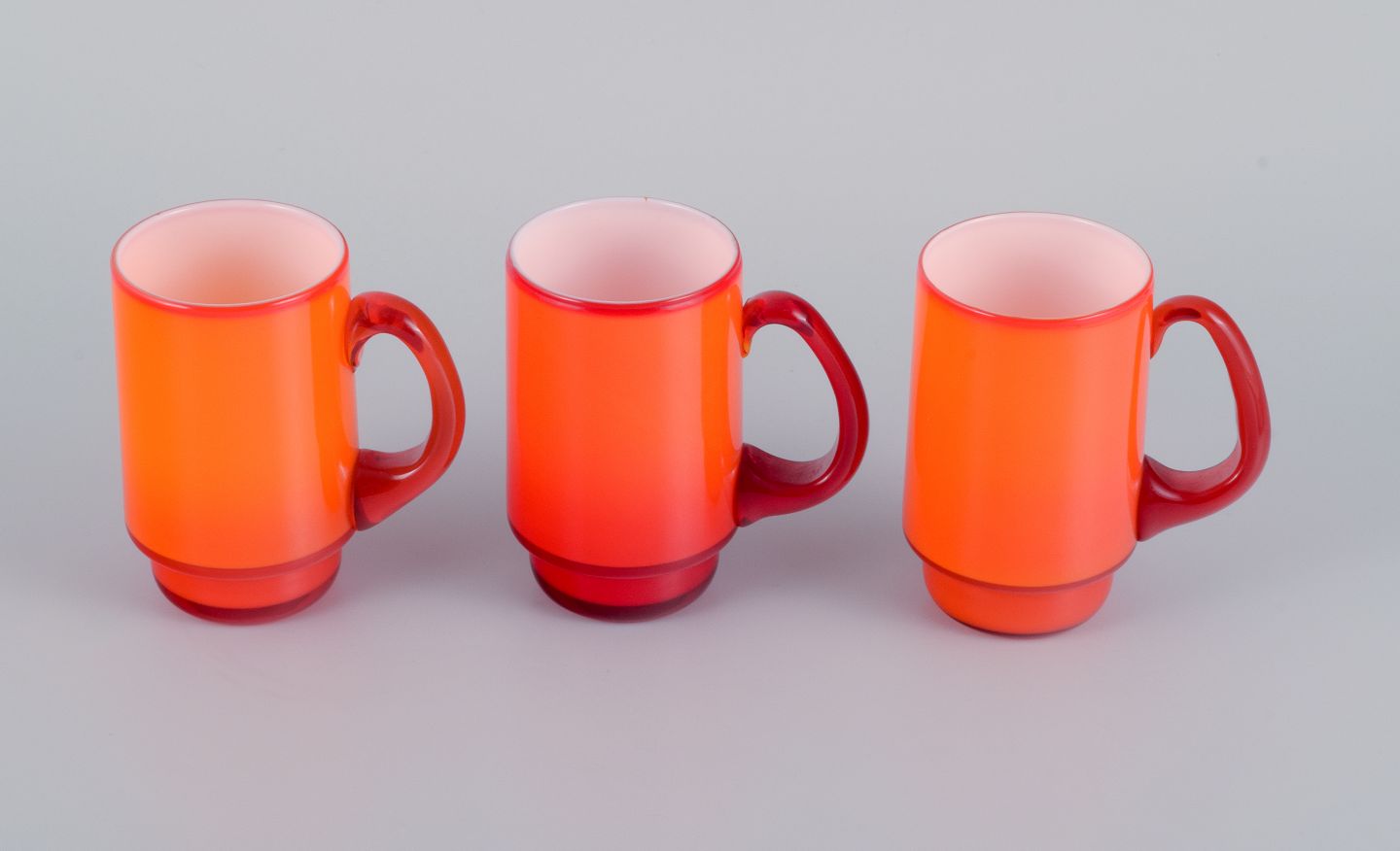 Michael Bang for Holmegaard. Tre krus i orange og hvidt kunstglas. 1960'erne. I perfekt stand. Mål: B 9,0 (med hank) x H 10,5 cm.