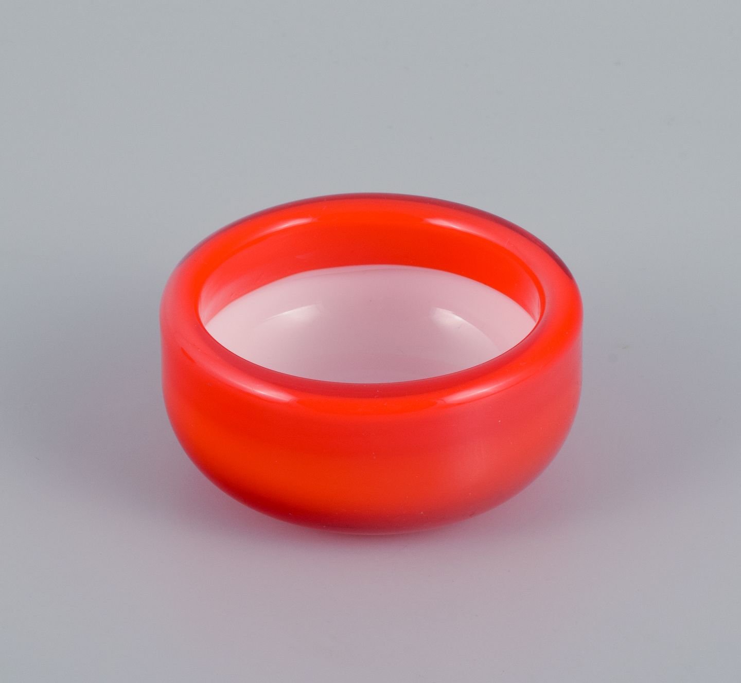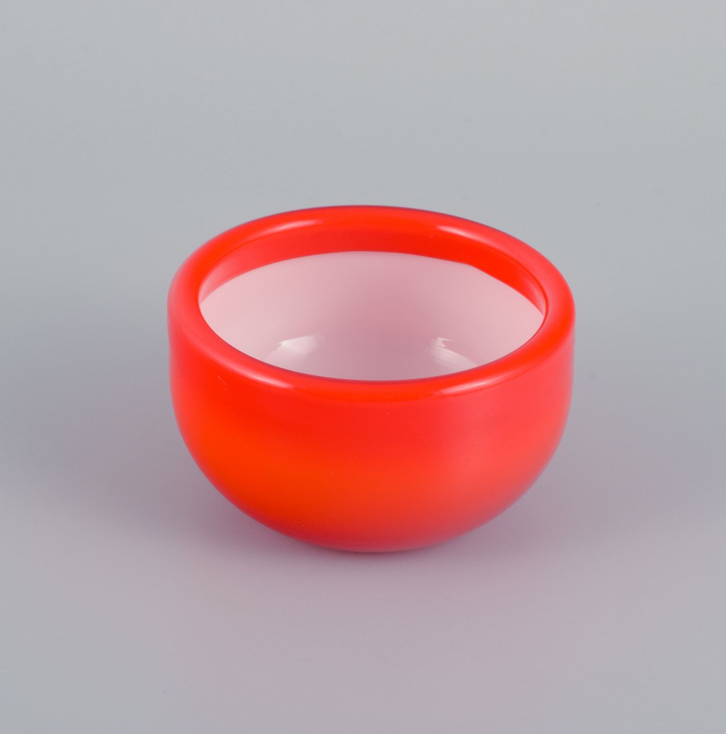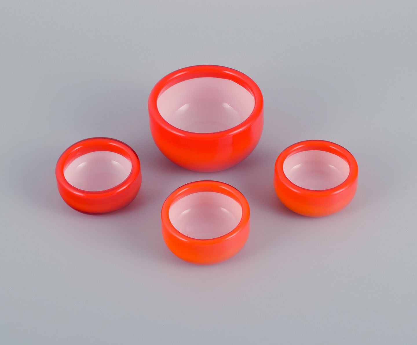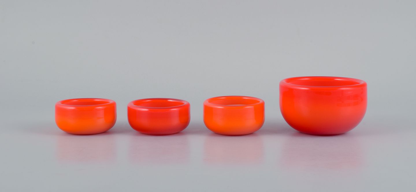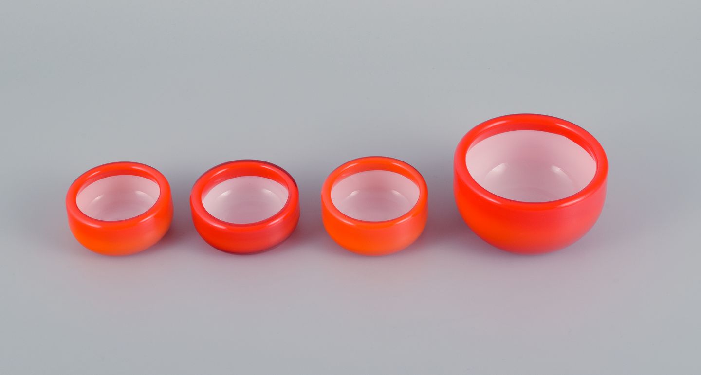 Michael Bang for Holmegaard. Fire glasskåle i orange og hvidt kunstglas. 1960'erne. I perfekt stand. Mål: D 9,0 x H 5,5 cm. Mål: D 6,5 x H 3,5 cm.