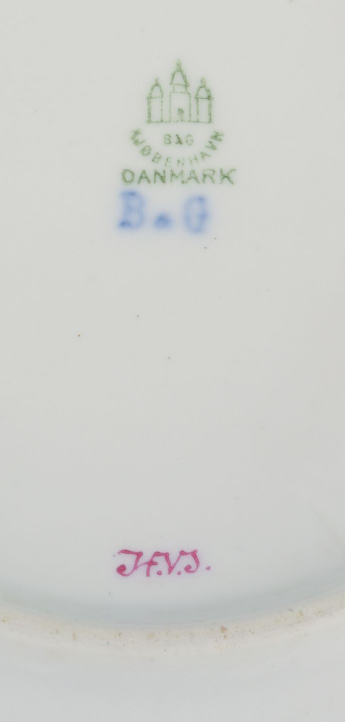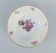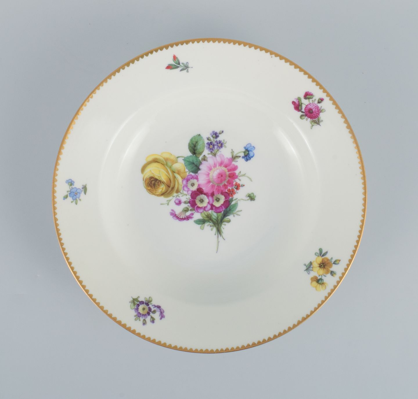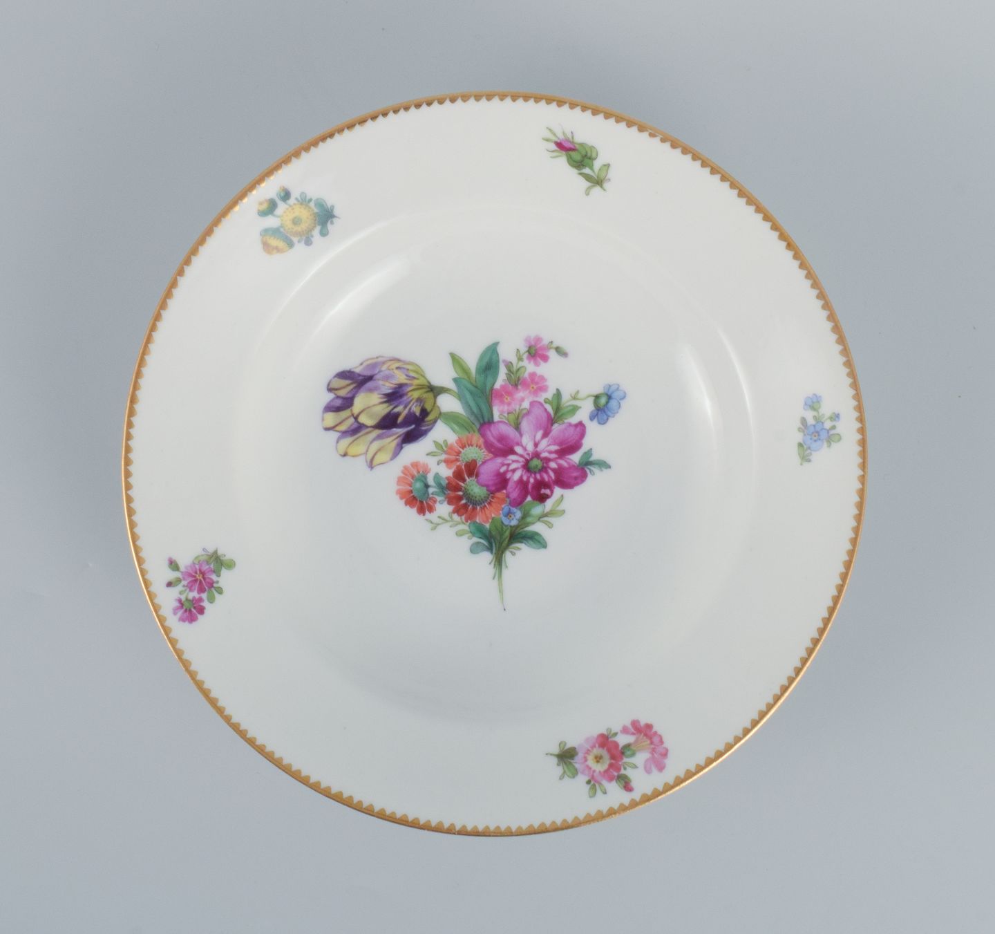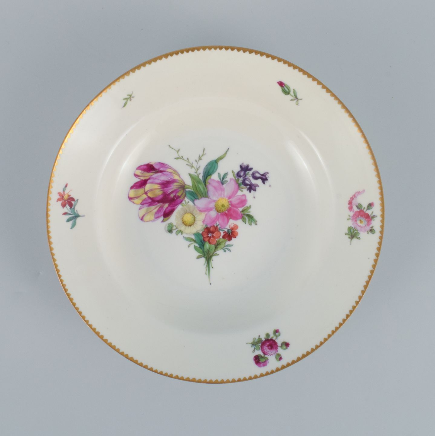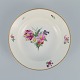 Tre dybe tallerkner dekoreret med blomster og guldkant.