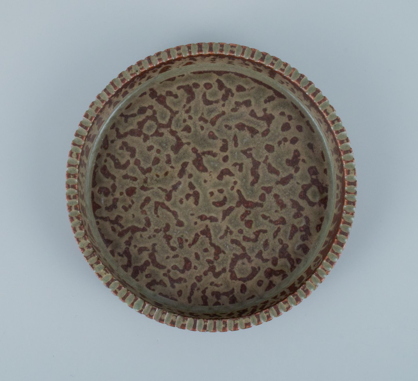 Arne Bang (1901-1983), Danmark. Lav skål med kanneleret kant i glaseret keramik. Smuk spættet glasur i lyse jord nuancer.