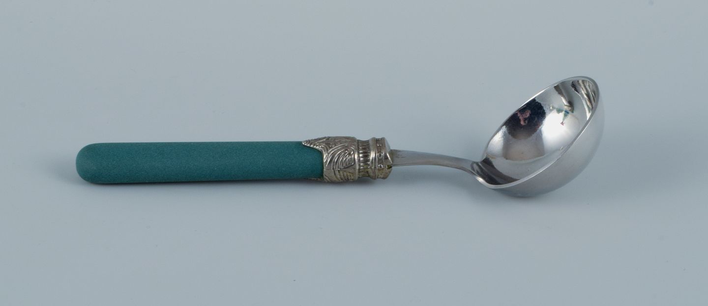 Ti knive, ti gafler, ti skeer og ti teskeer, salatbestik samt serveringsske.