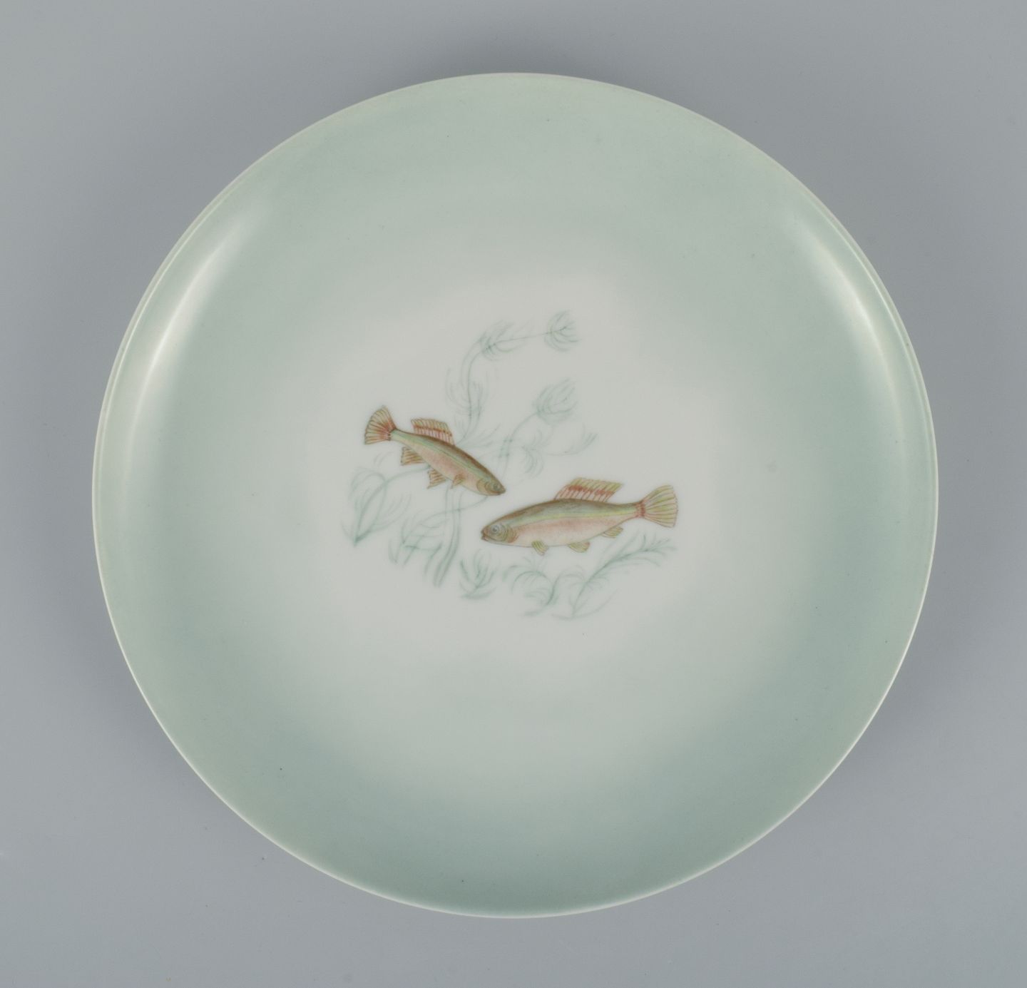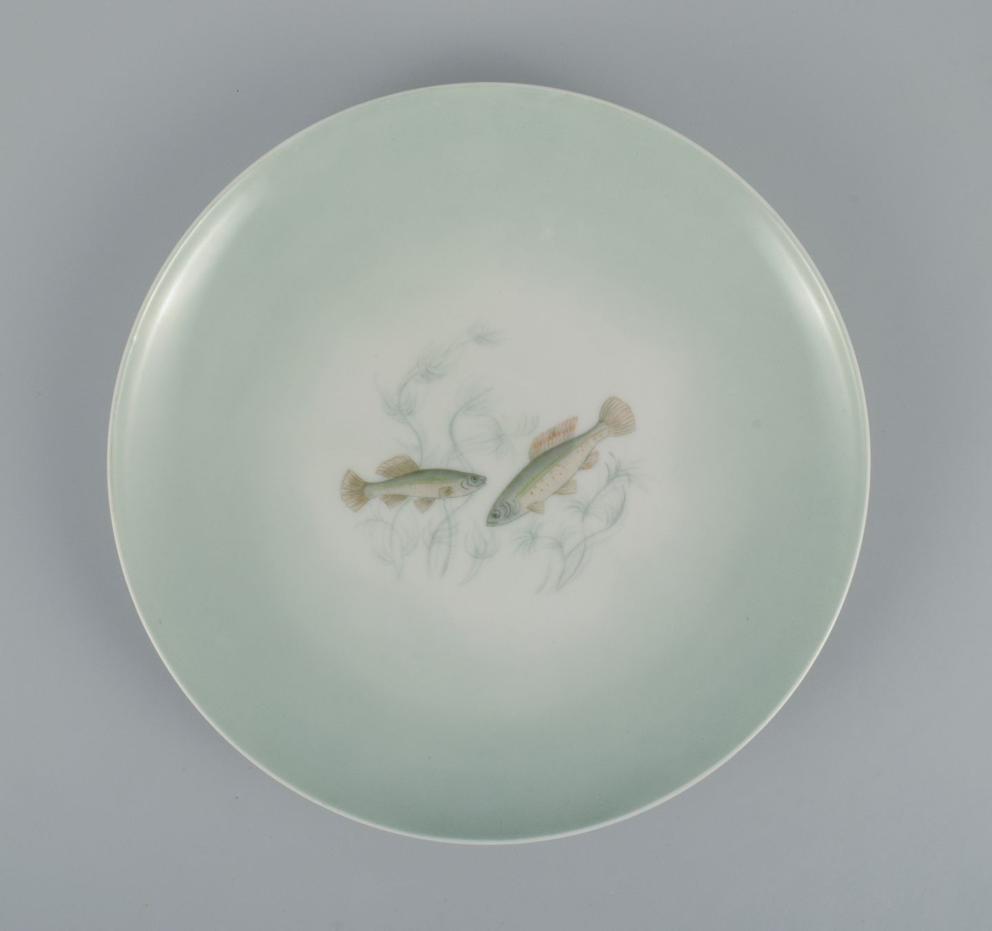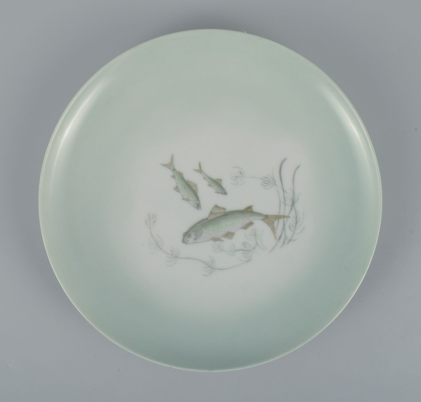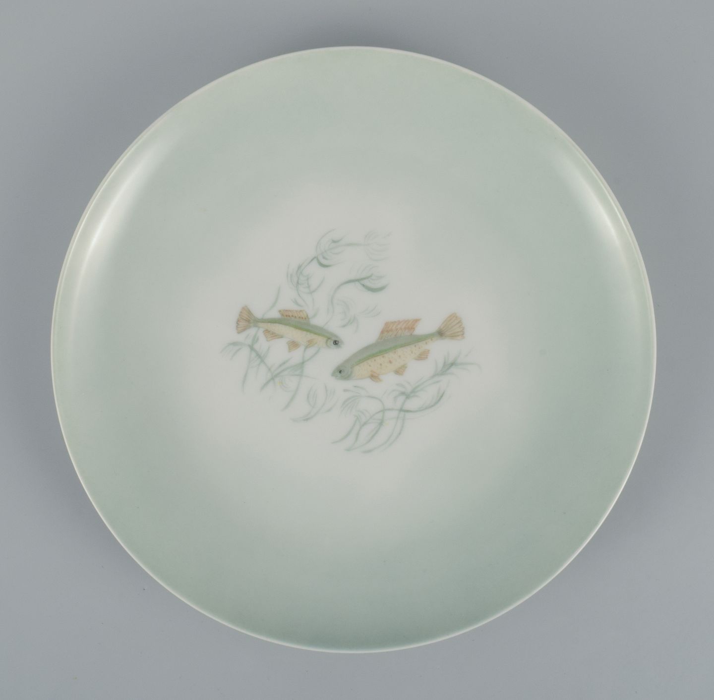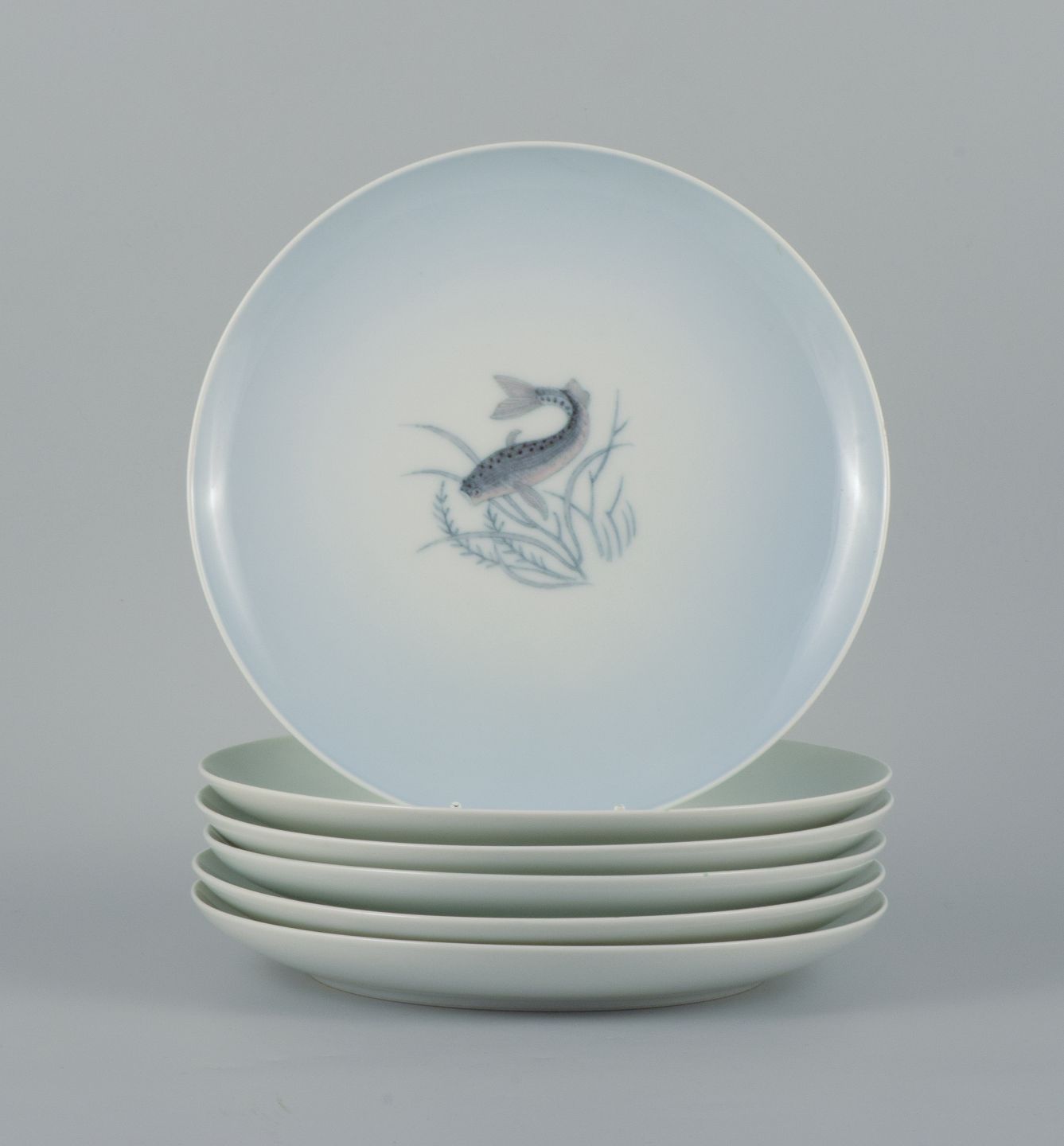 Th. Karlinder for Bing & Grøndahl. Seks håndmalet middagstallerkner med fiskemotiver. 1956. I flot stand. Første sortering. Stemplet. Mål: 23,5 cm.