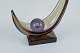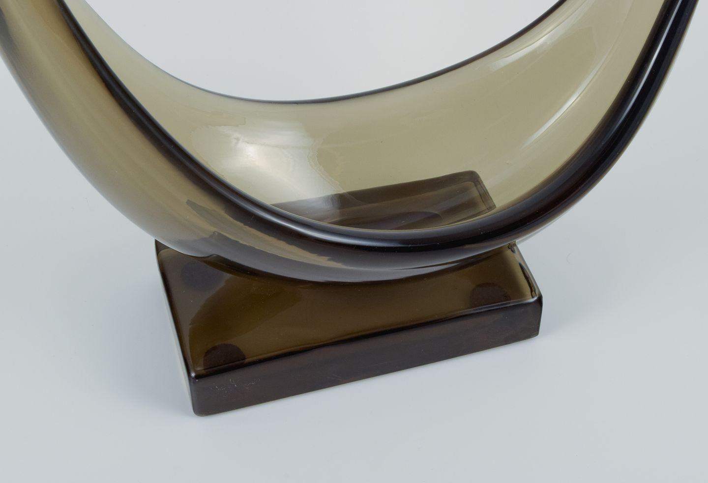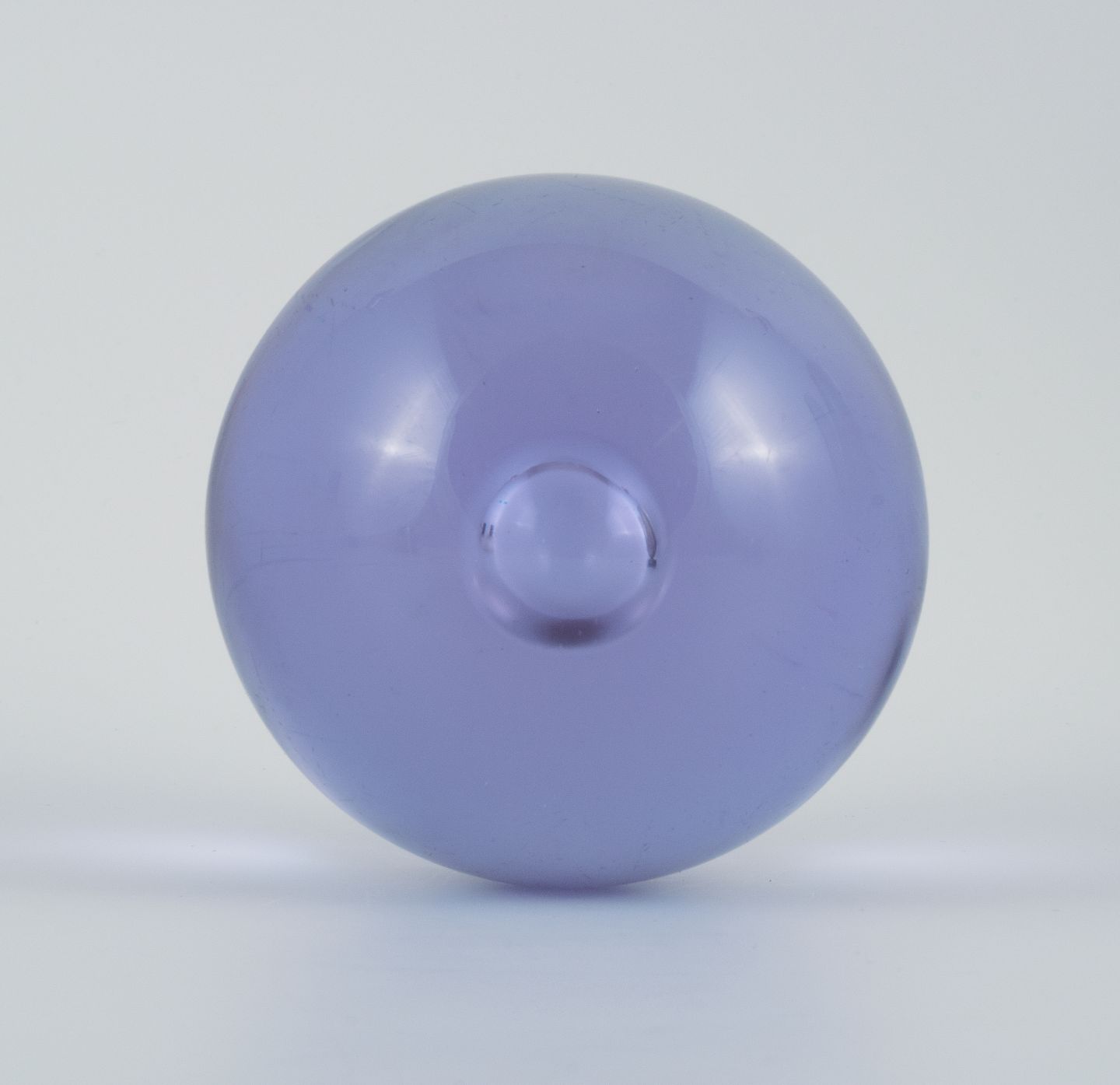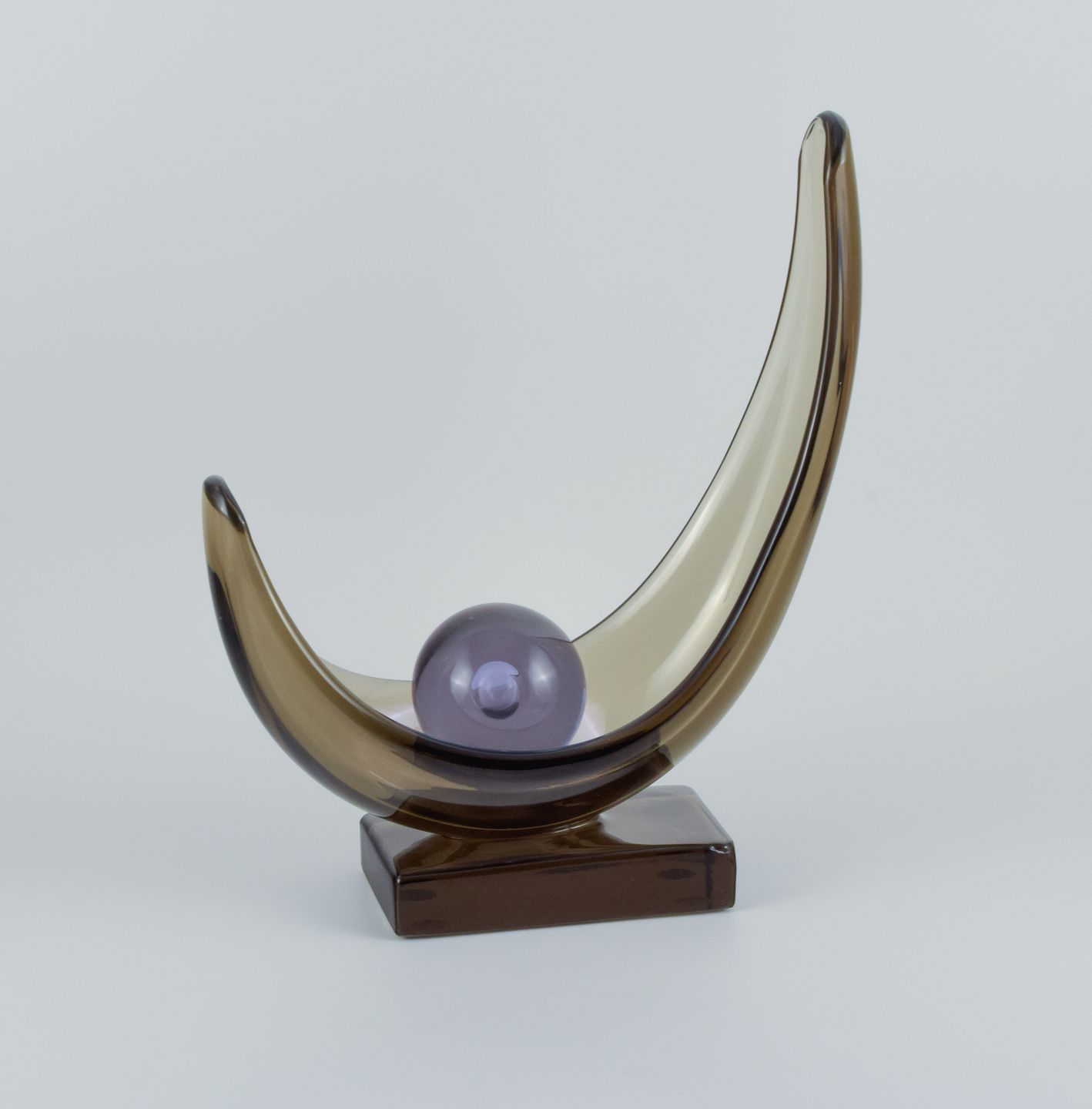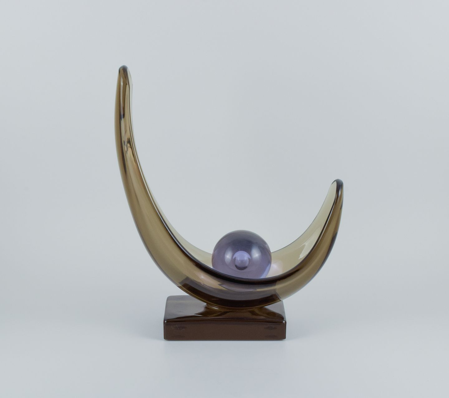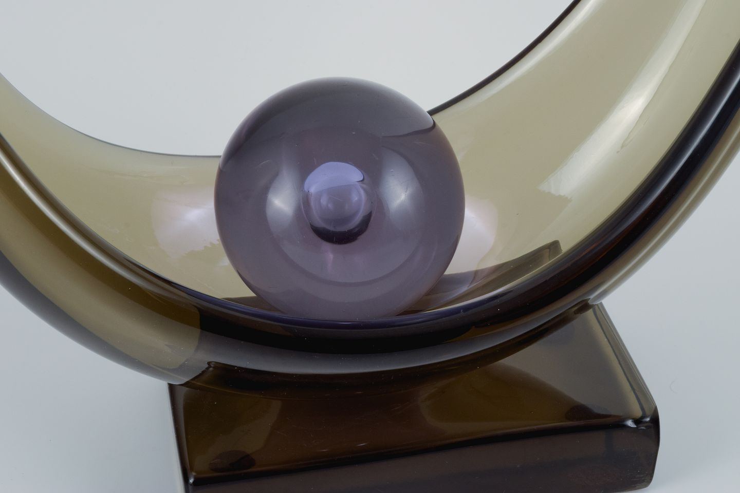 Livio Seguso, Murano, kolossal og imponerende kunstglasskulptur i røgfarvet glas på sort fod og glaskugle i lyslilla.