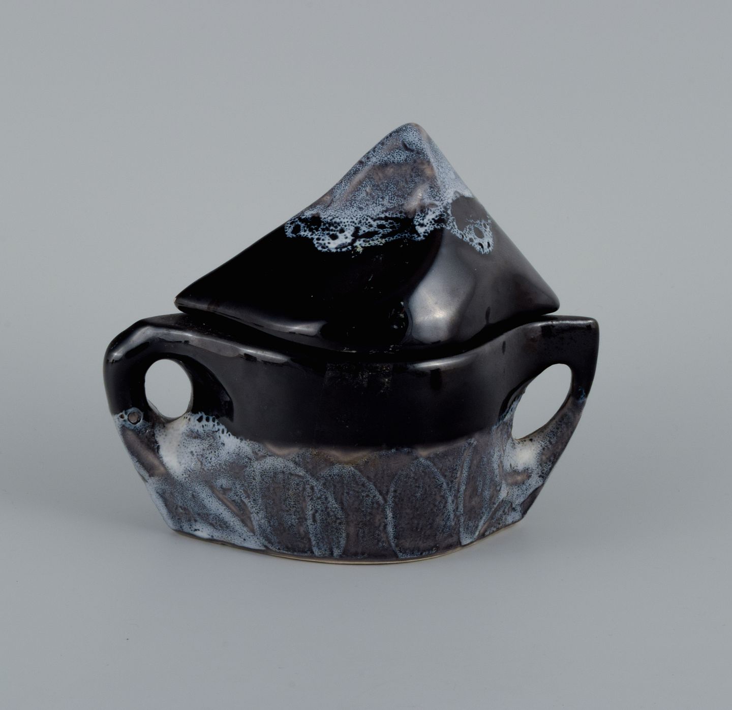 Et modernistisk fire personers kaffeservice i keramik bestående af fire kaffekopper med tilhørende underkopper, kaffekande, flødekande, sukkerskål samt tre små tallerkner.