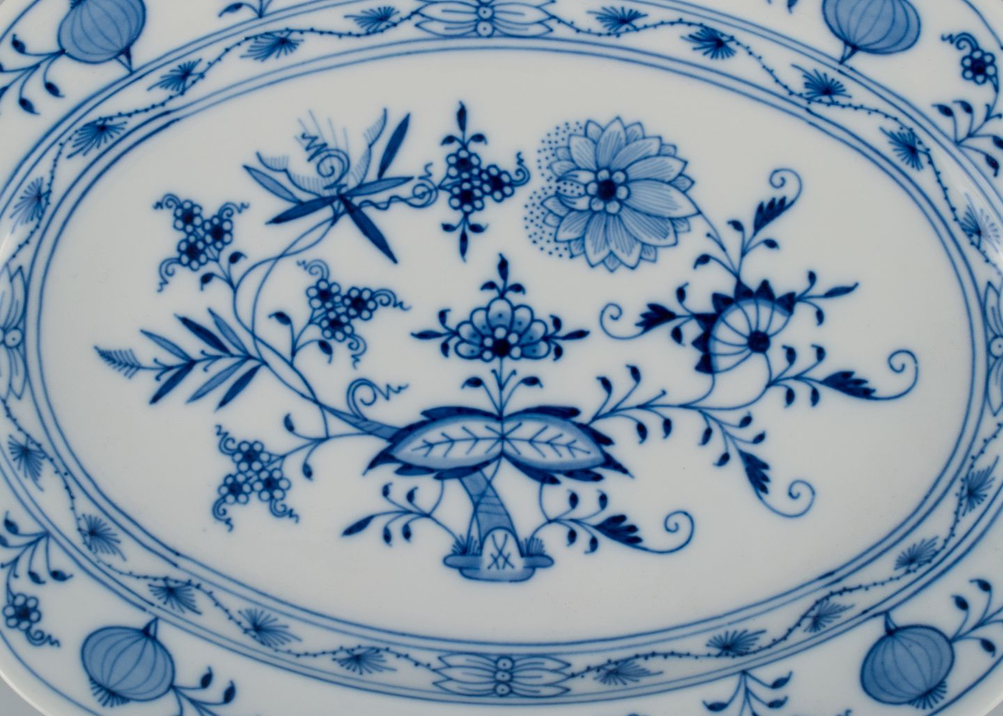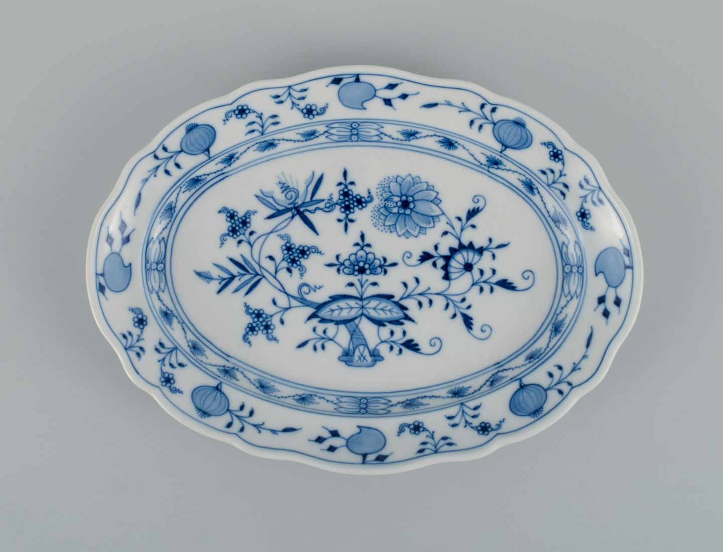Meissen, Blue Onion oval dish. Approx. 1900. Fourth factory quality. Perfect condition. Marked. Dimensions: L 30,0 x D 22,0 x H 3,5 cm.