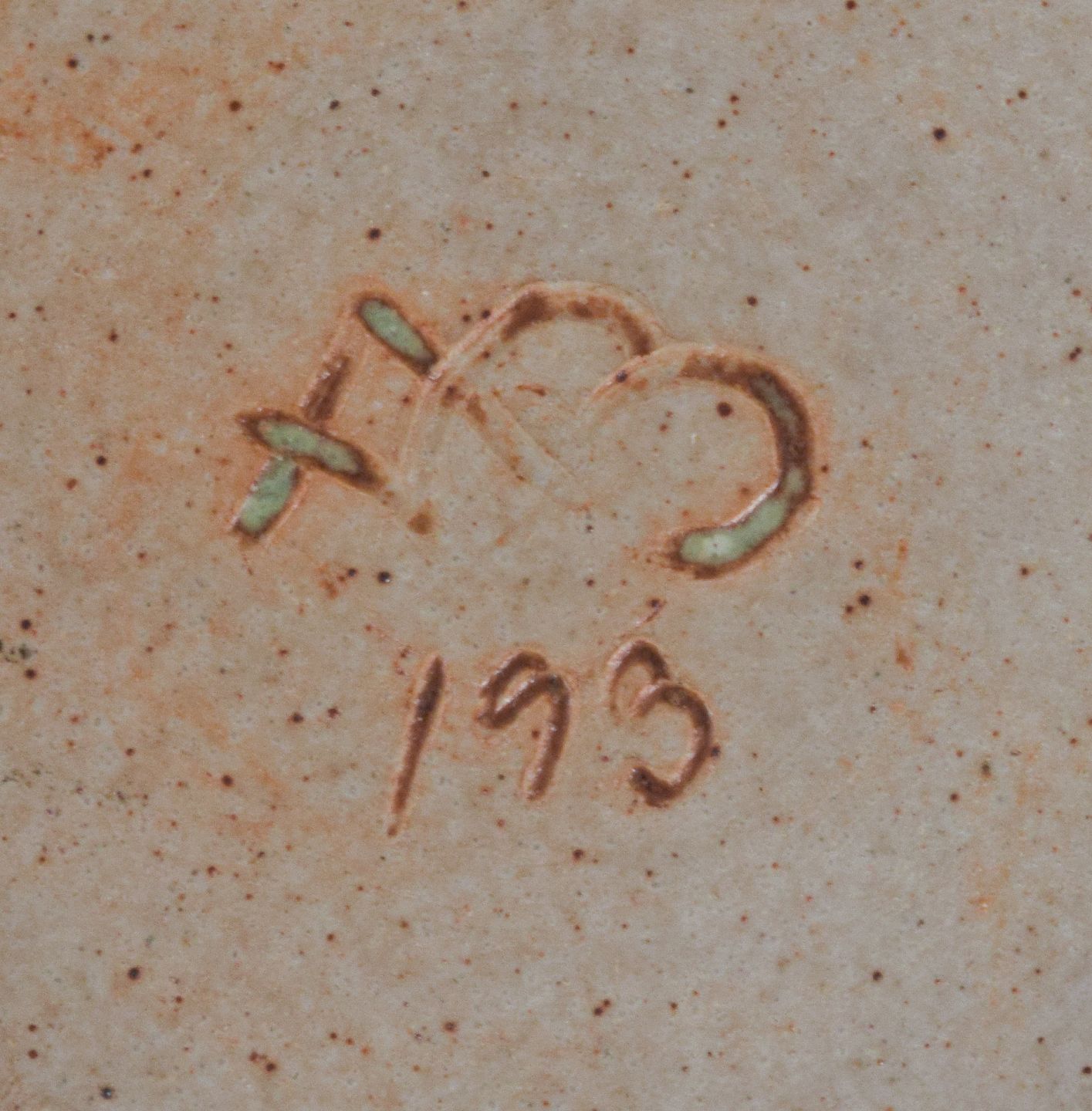 Rare Arne Bang, low bowl with flower bud in relief, glaze in shades of green.