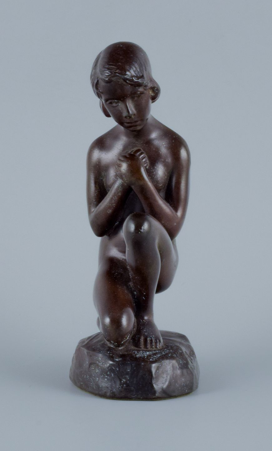 Borch for Just Andersen. Art Deco skulptur af ung nøgen kvinde. I flot stand med mindre brugspræg. Flot patina. 1940’erne. Modelnummer D2017 Stemplet. Mål: H 17,0 x B 9,0 x D 6,0 cm.