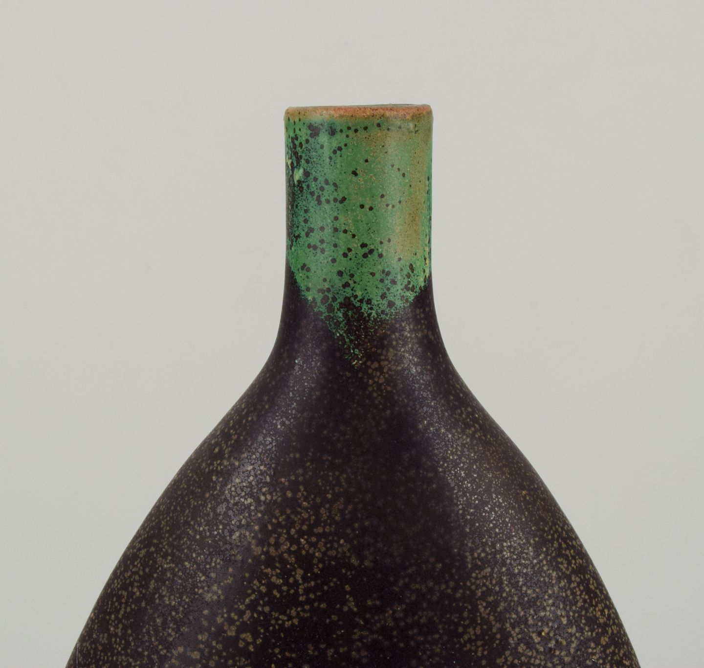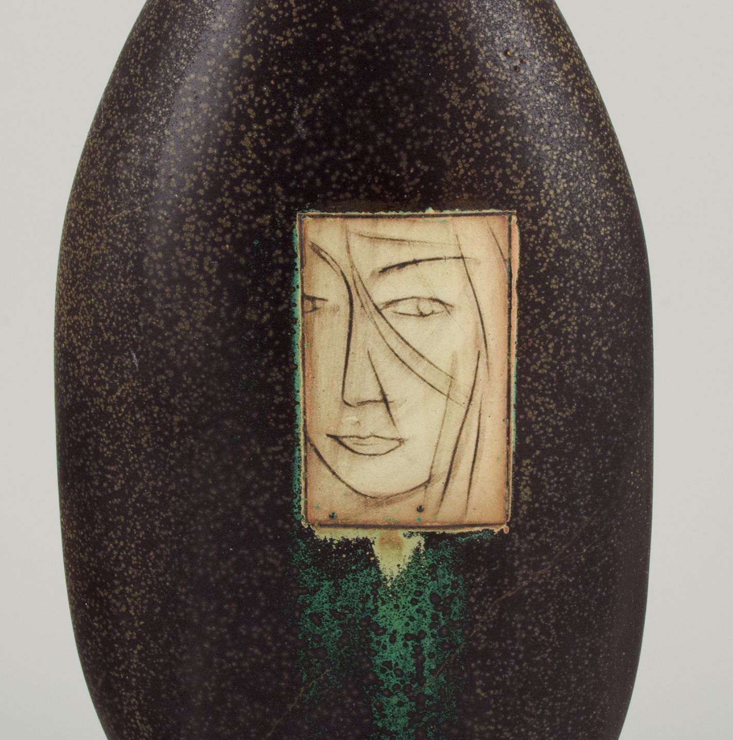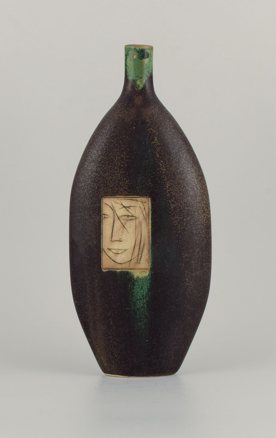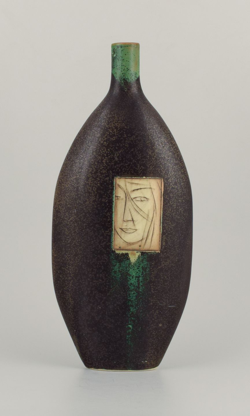 Pirjo Nylander, Finnish ceramist, tall unique ceramic vase with motif of a woman's face. Approx. 1960s/70s. Signed. In excellent condition. Dimensions: H 37.0 x W 16.0 cm.