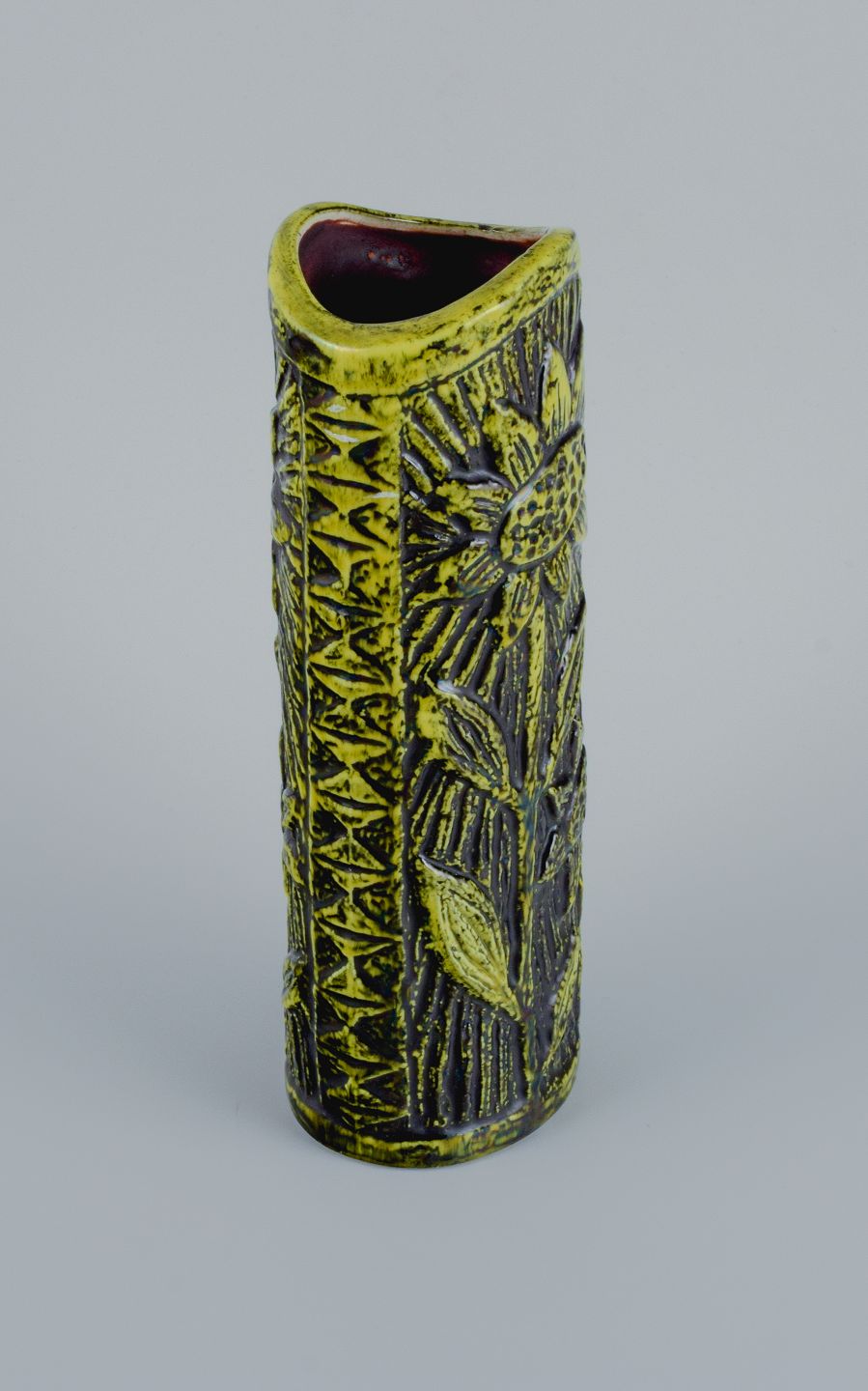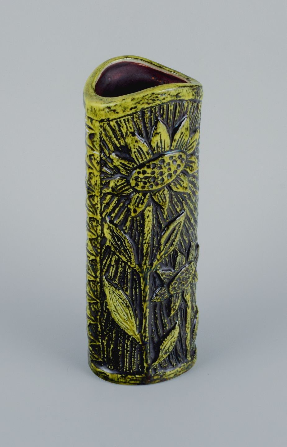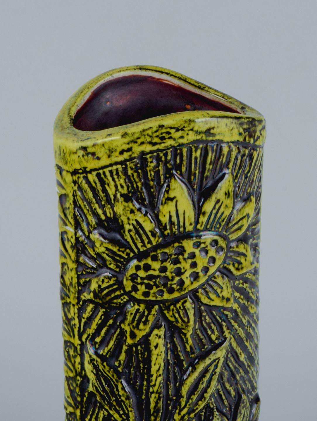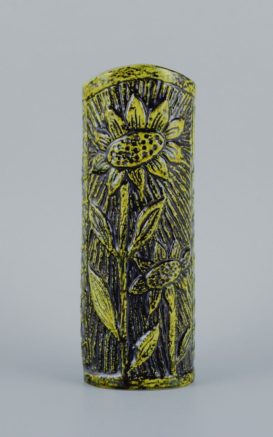 Gunnar Nylund (1904-1997) for Rörstrand. Keramikvase hånddekoreret med solsikker i sort og grøngul glasur. 1960’erne. I perfekt stand. Stemplet. Mål: H 23,5 x D 9,0 cm.