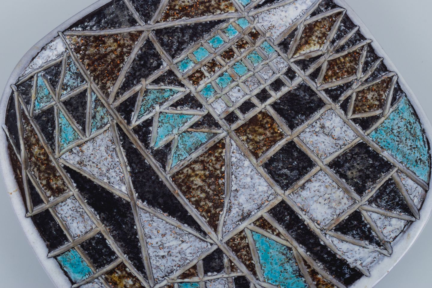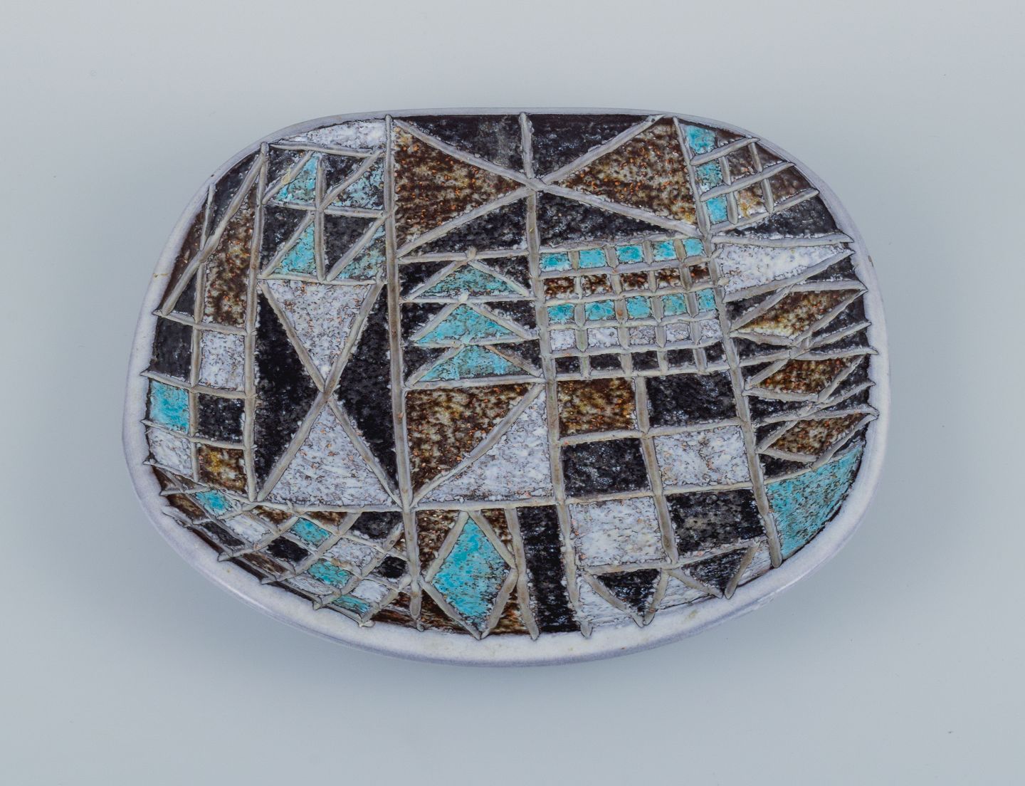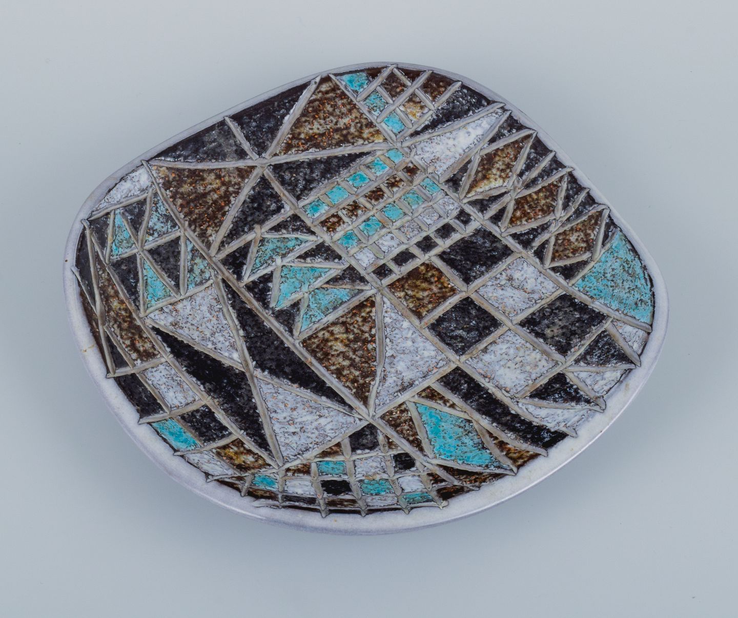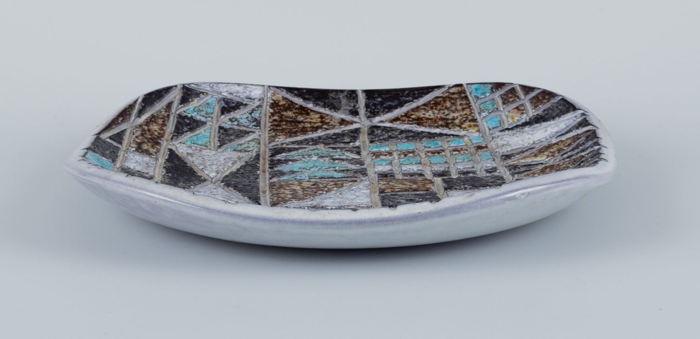Ingrid Atterberg for Upsala-Ekeby, keramikfad håndmalet med geometriske felter. Modelnummer 2671. Ca. 1960. Stemplet. Perfekt stand. Mål: D 25,5 cm.