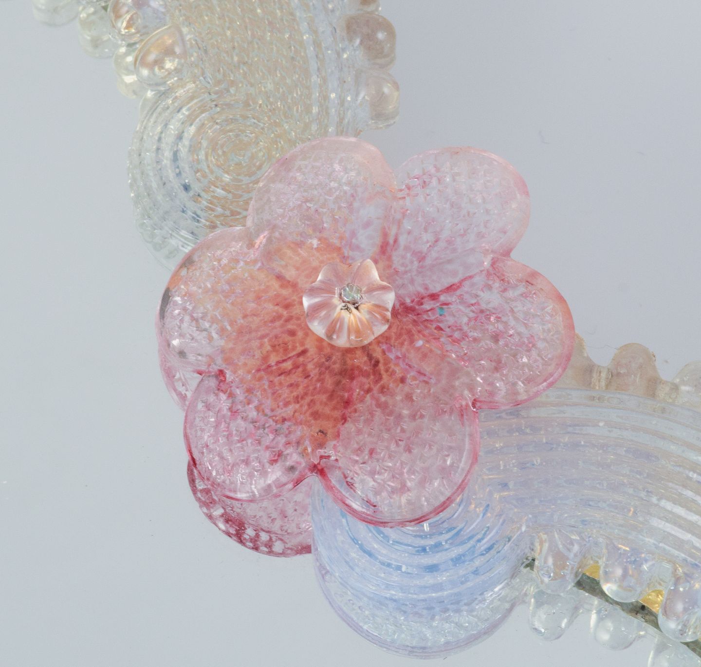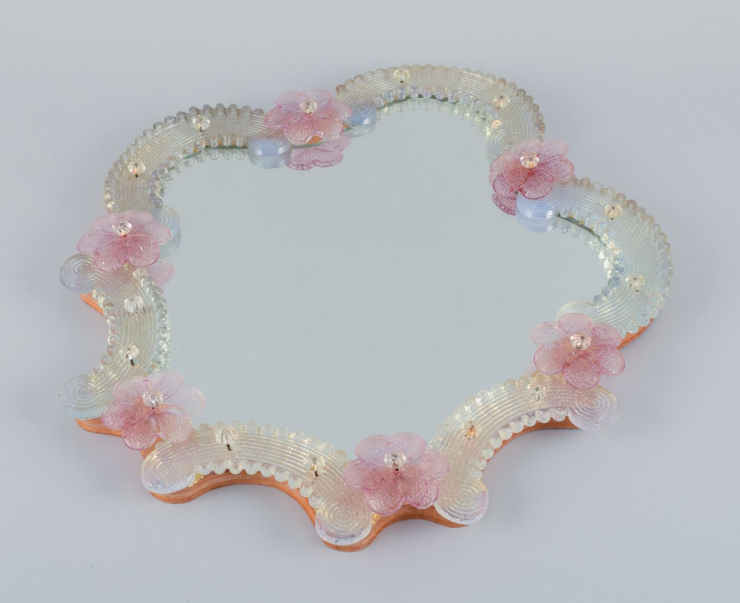 Murano, Venedig, yndigt spejl i kunstglas med guld og rosa dekoration.