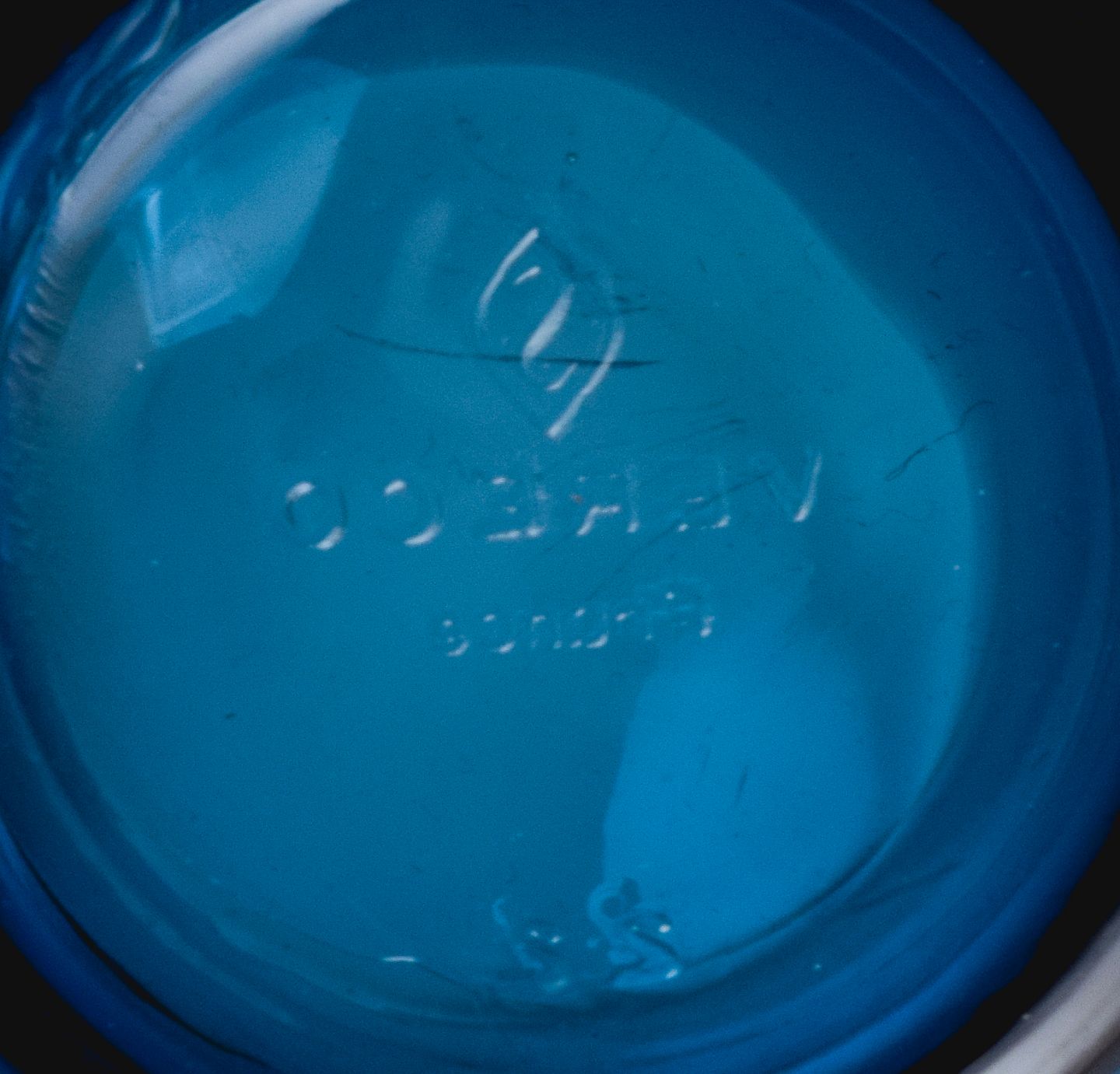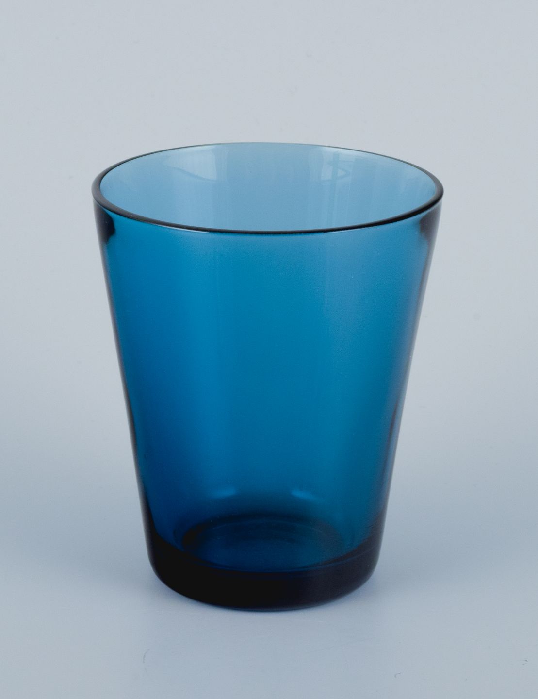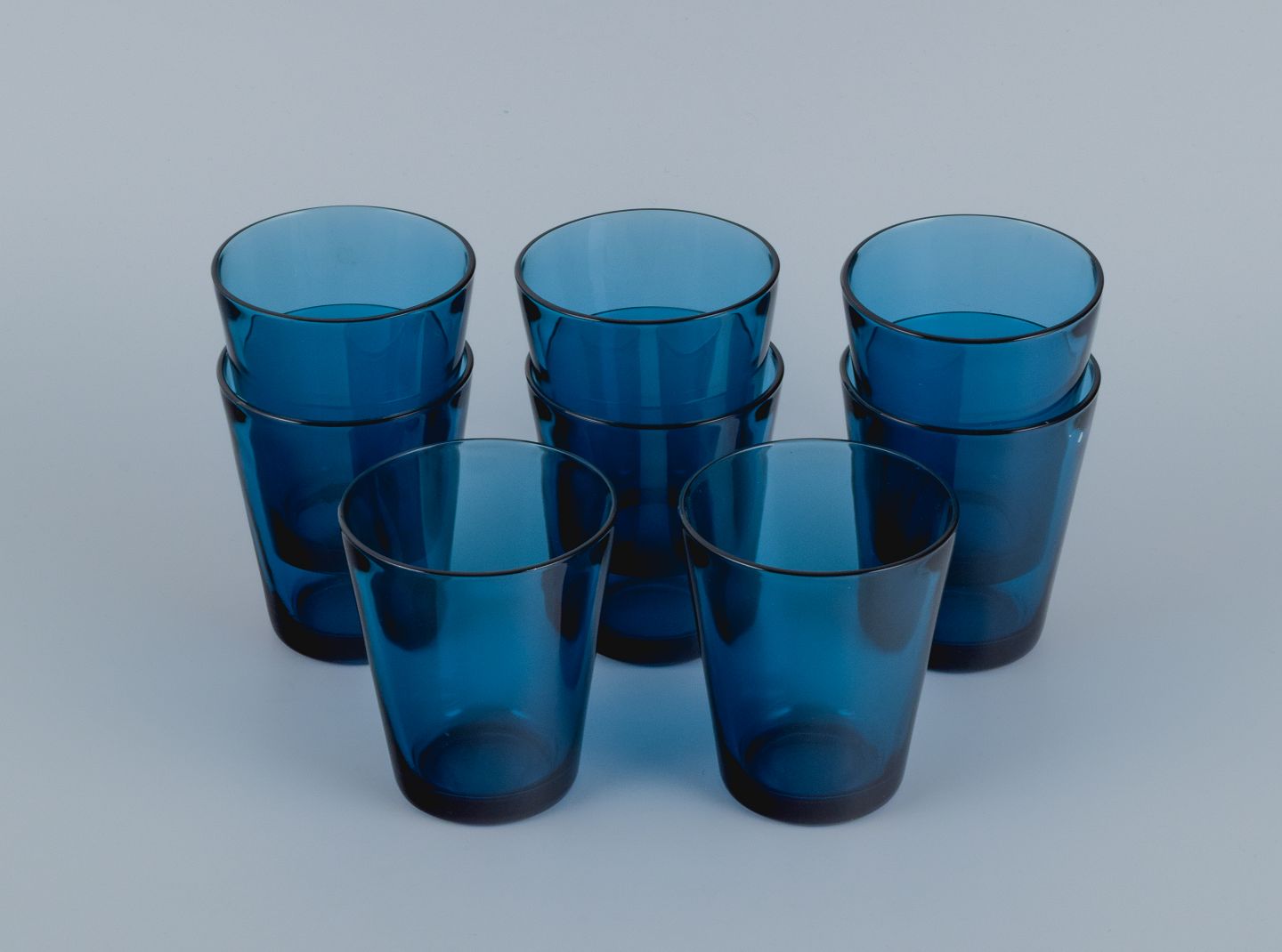 Vereco, Frankrig, et sæt på otte vandglas i blåt kunstglas. Ca. 1970'erne. I perfekt stand. Stemplet. Mål: H 9,0 x D 7,5 cm.