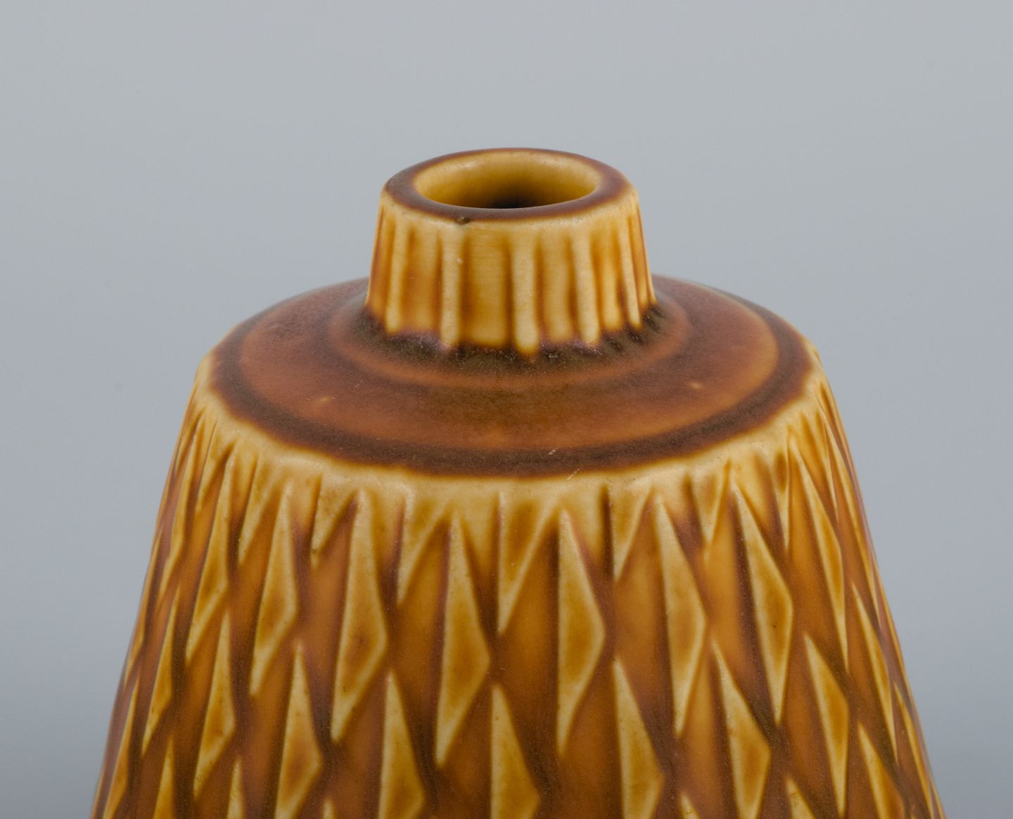 Gunnar Nylund for Rörstrand, ”Eterna” keramikvase med glasur i gulbrune nuancer. 1970’erne. Stemplet. Første sortering. Perfekt stand. Mål: H 10 x D 9,0 cm.