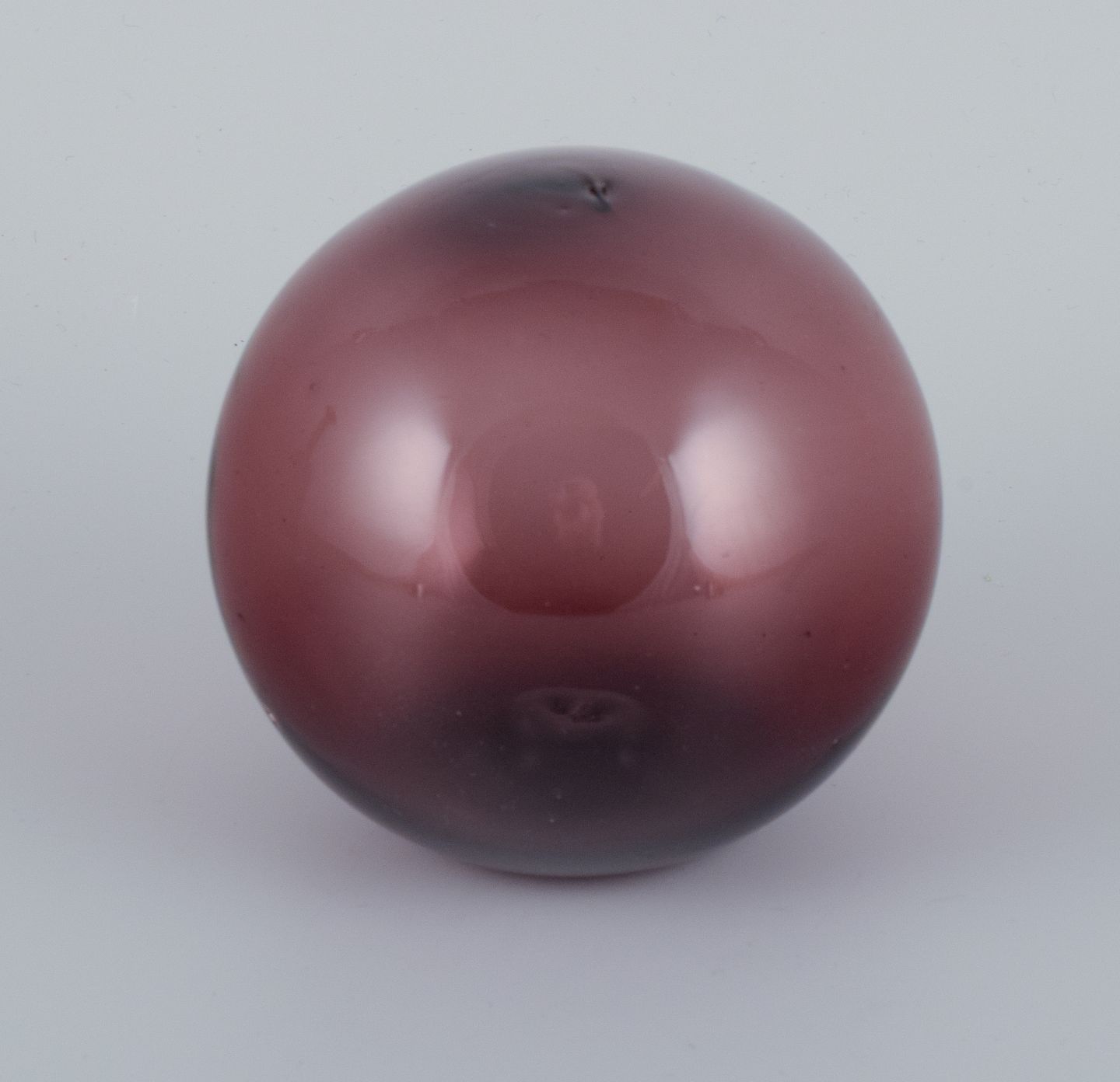 Otto Brauer for Holmegaard. Vase/flaske i grøn mundblæst kunstglas med lilla kugle.