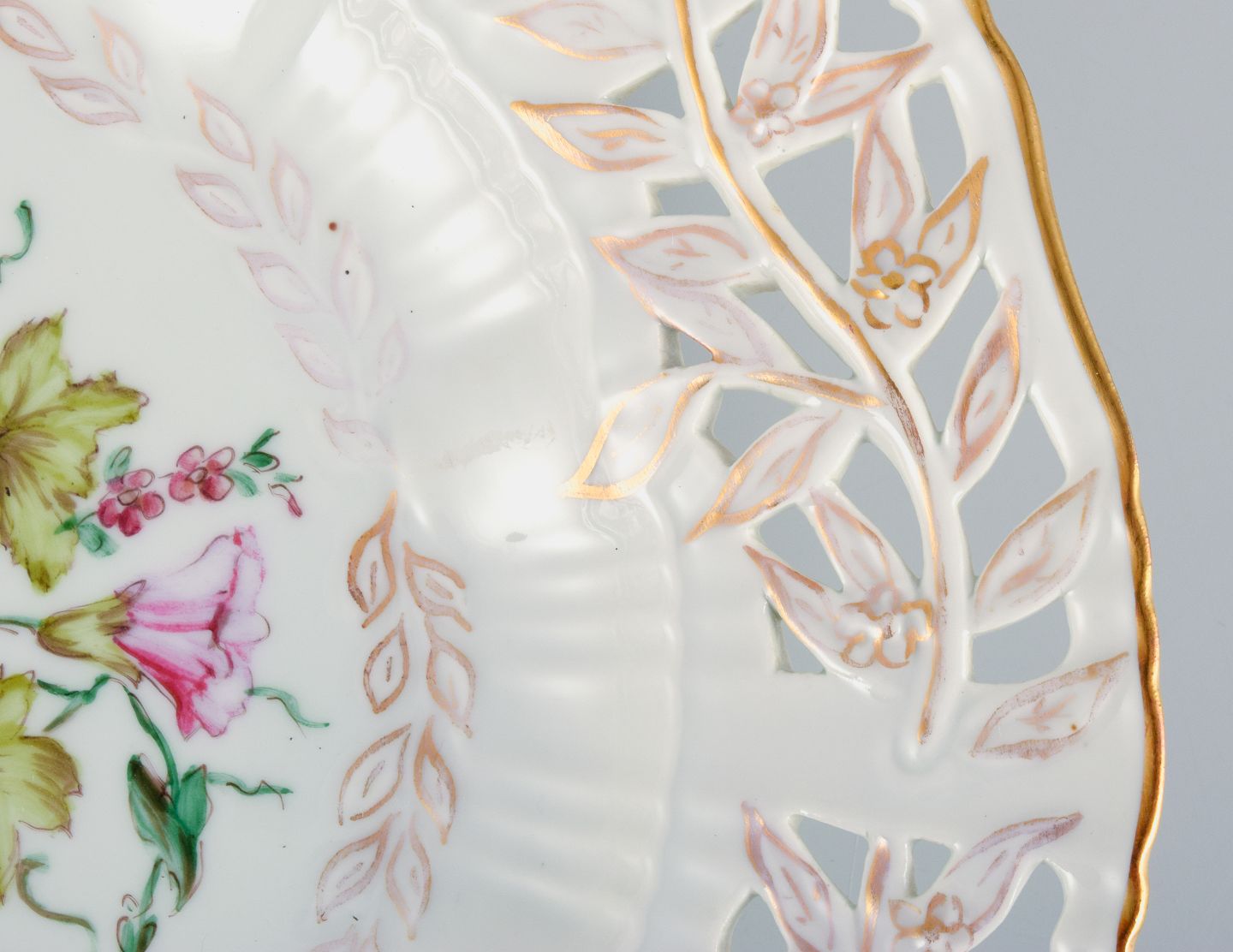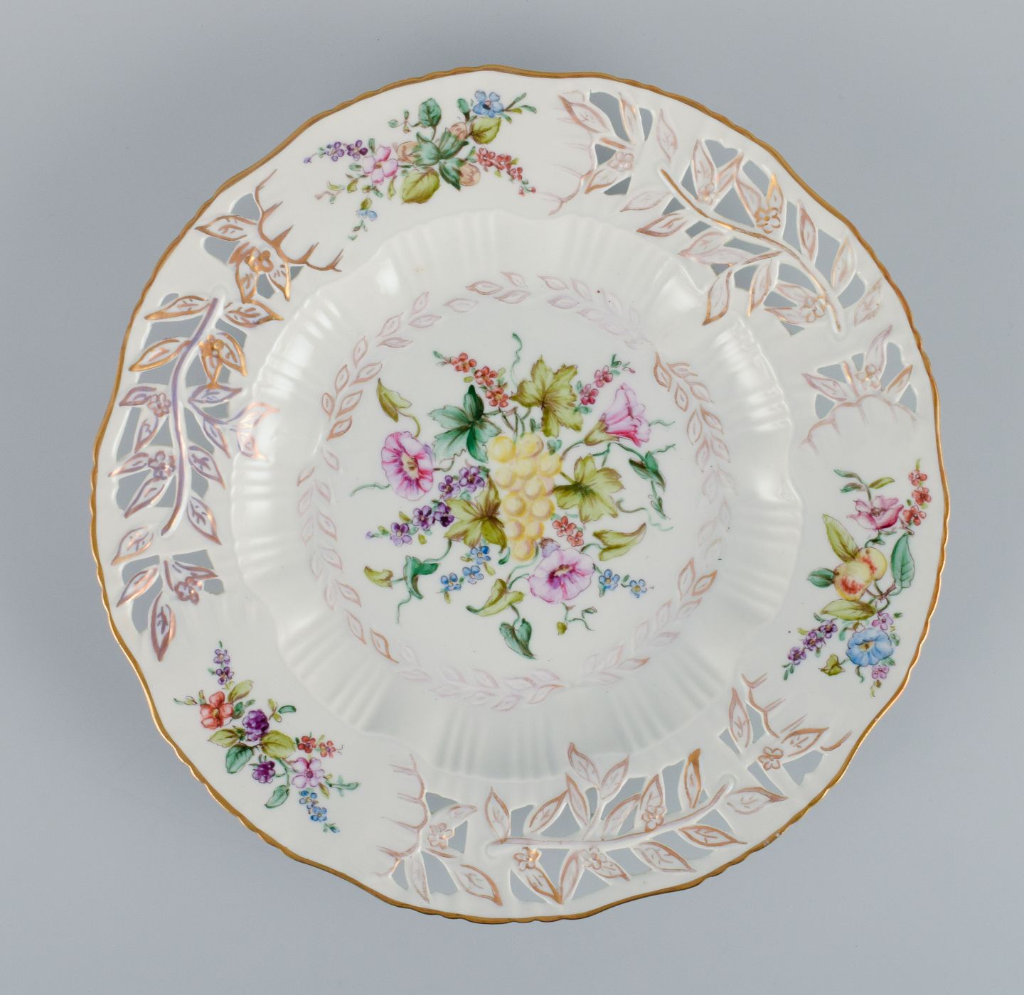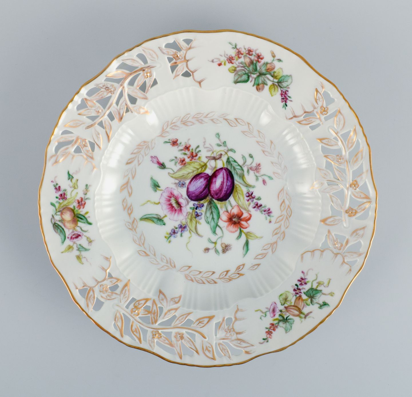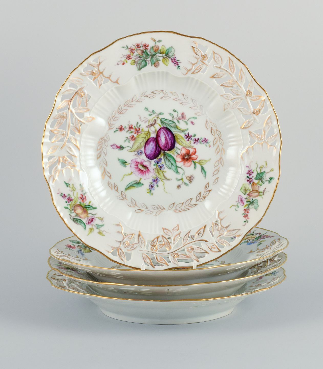 Royal Copenhagen, et sæt på fire antikke middagstallerkner med gennembrudt kant og bladværk.